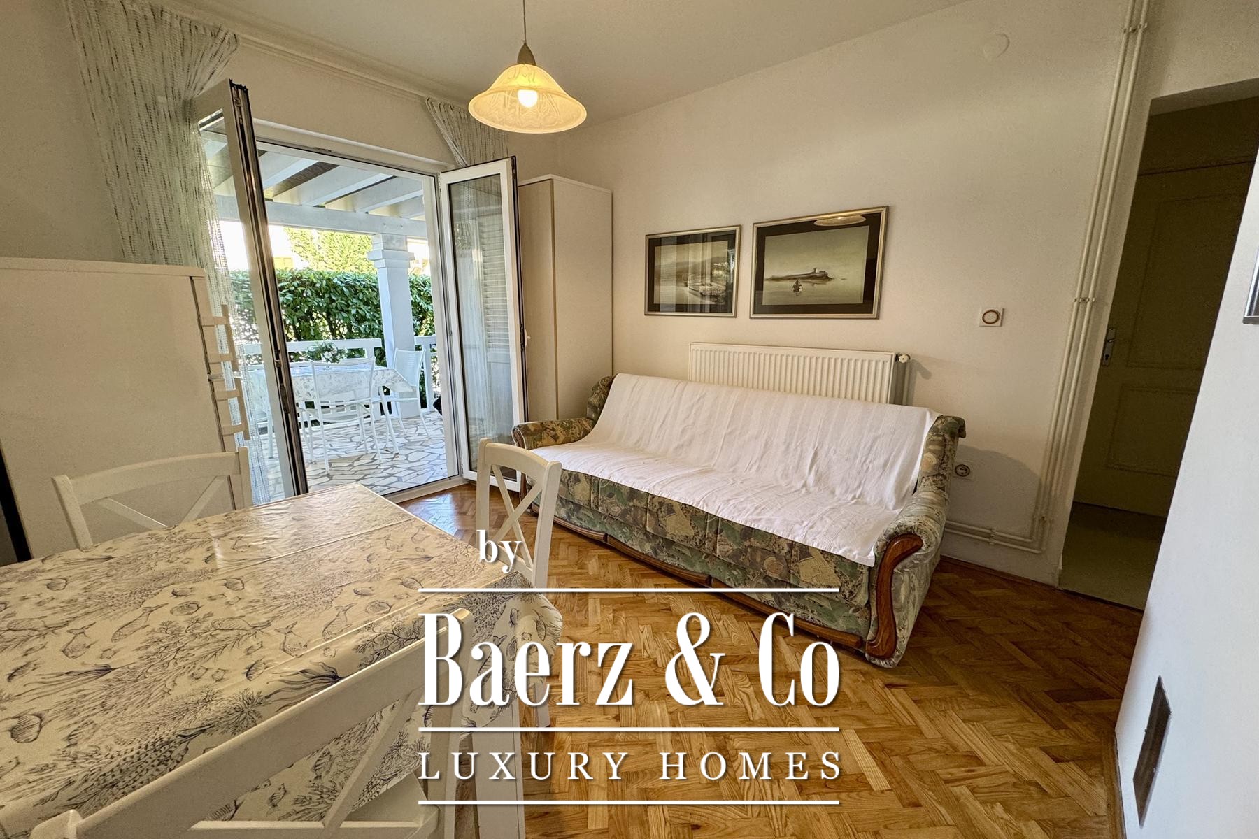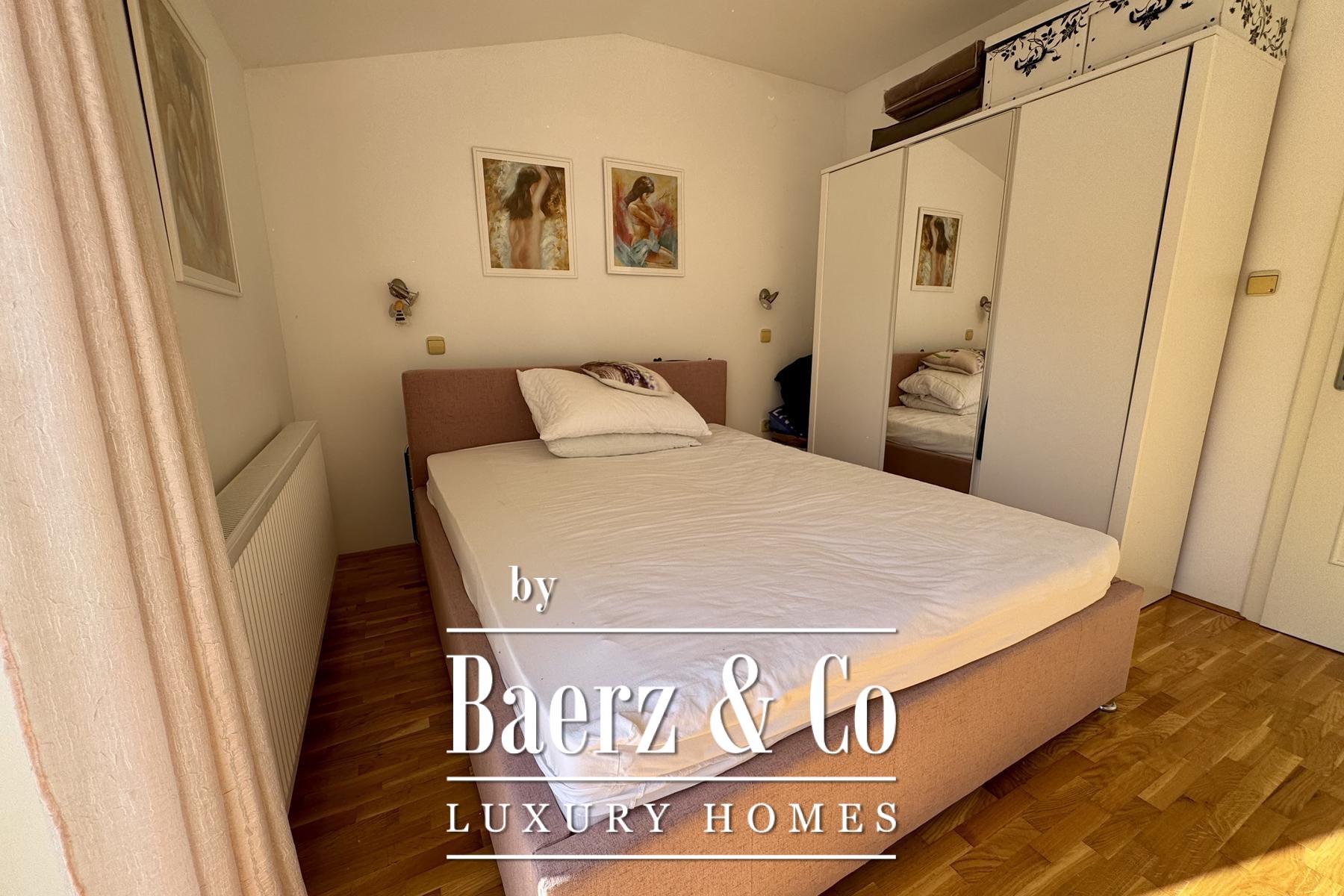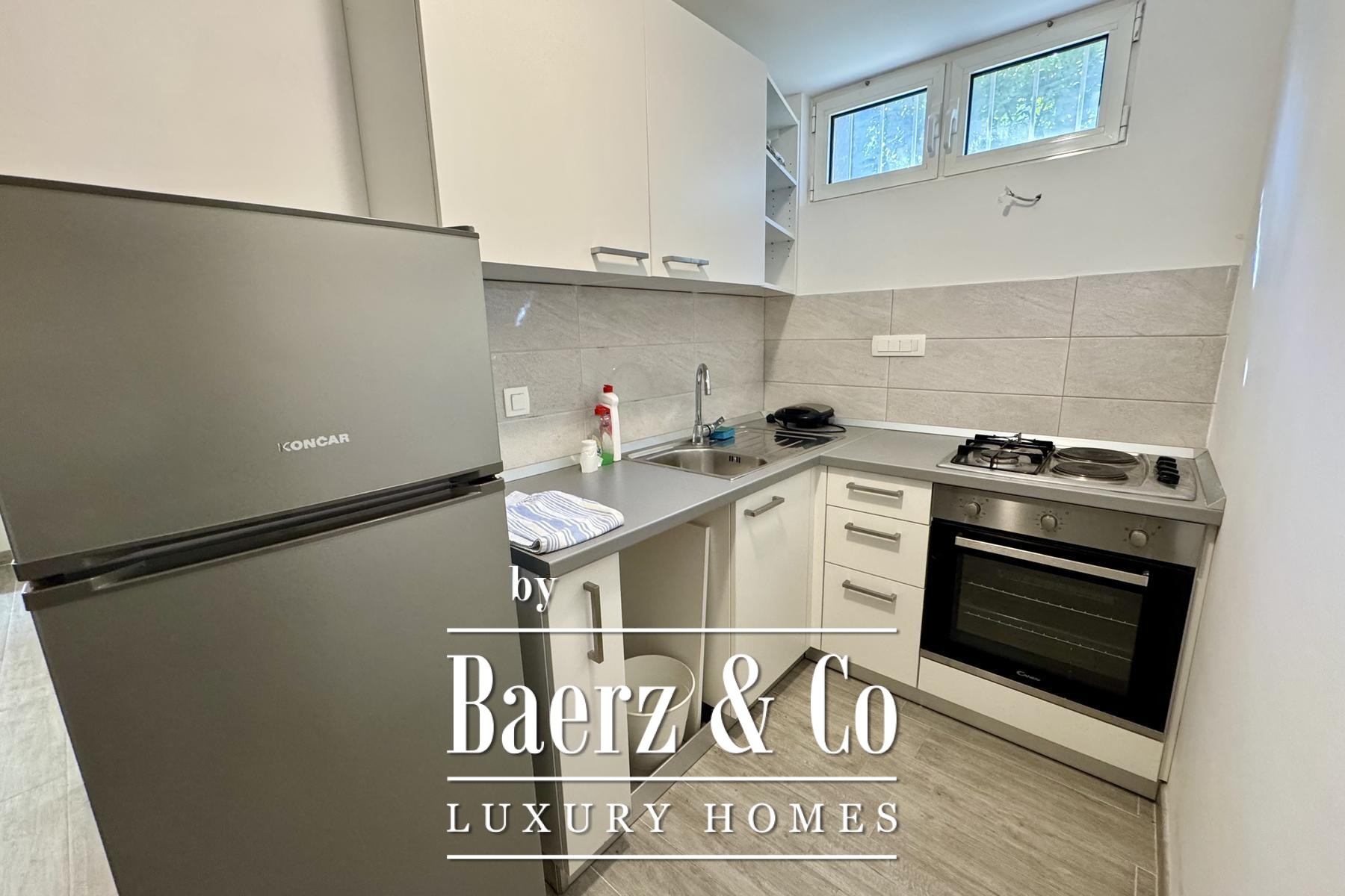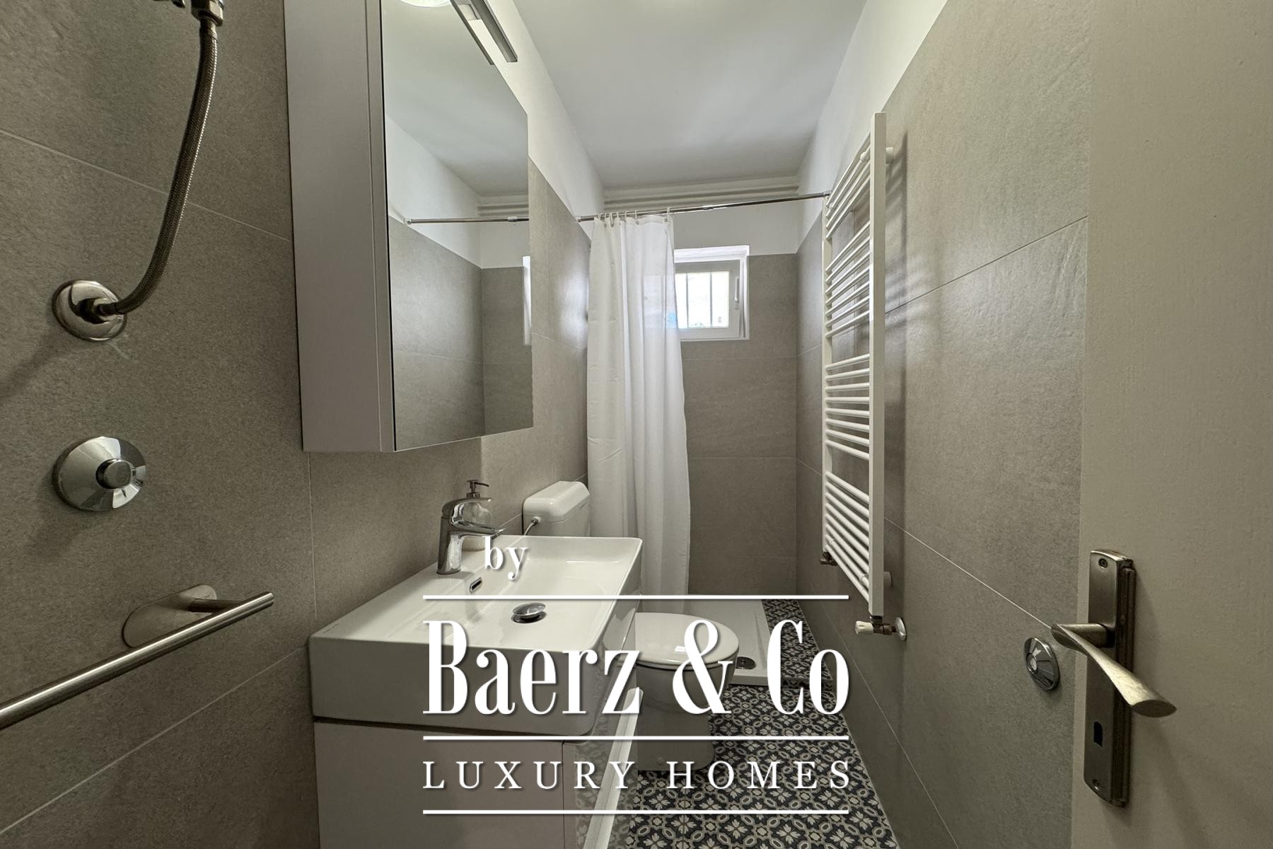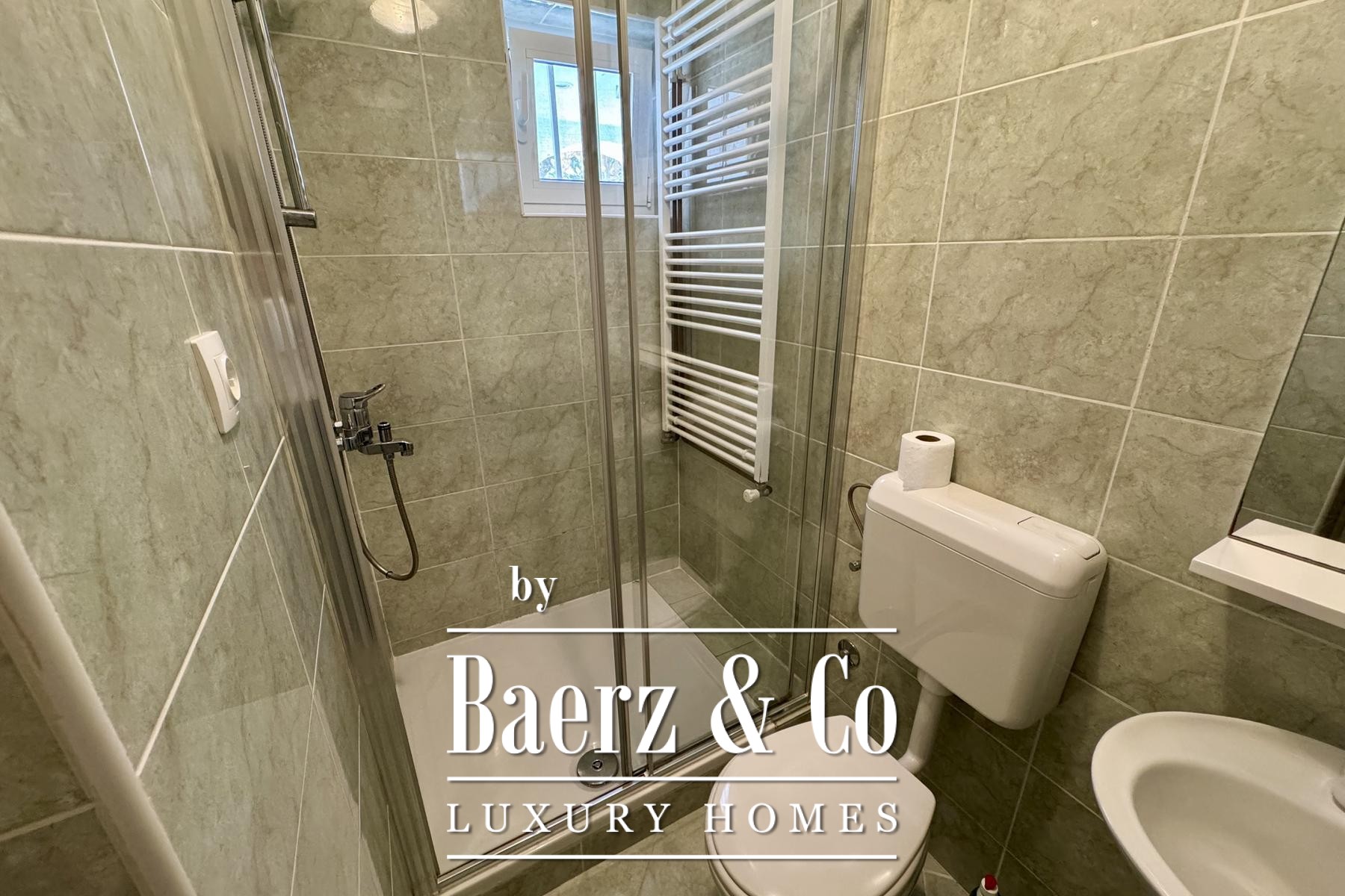 The main two-story apartment features two bedrooms, two bathrooms, a storage room, and a generous open-plan living area. Natural light fills the interior, connecting seamlessly to a covered terrace and two balconies, each framing glimpses of the Adriatic and the ever-changing Mediterranean light.