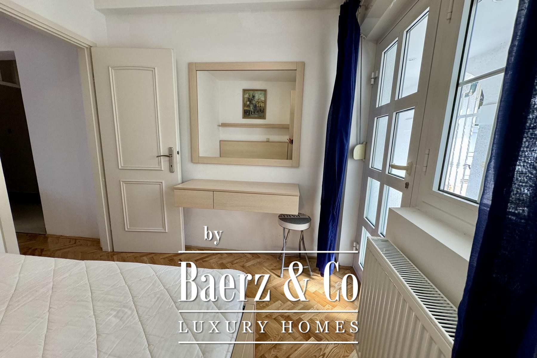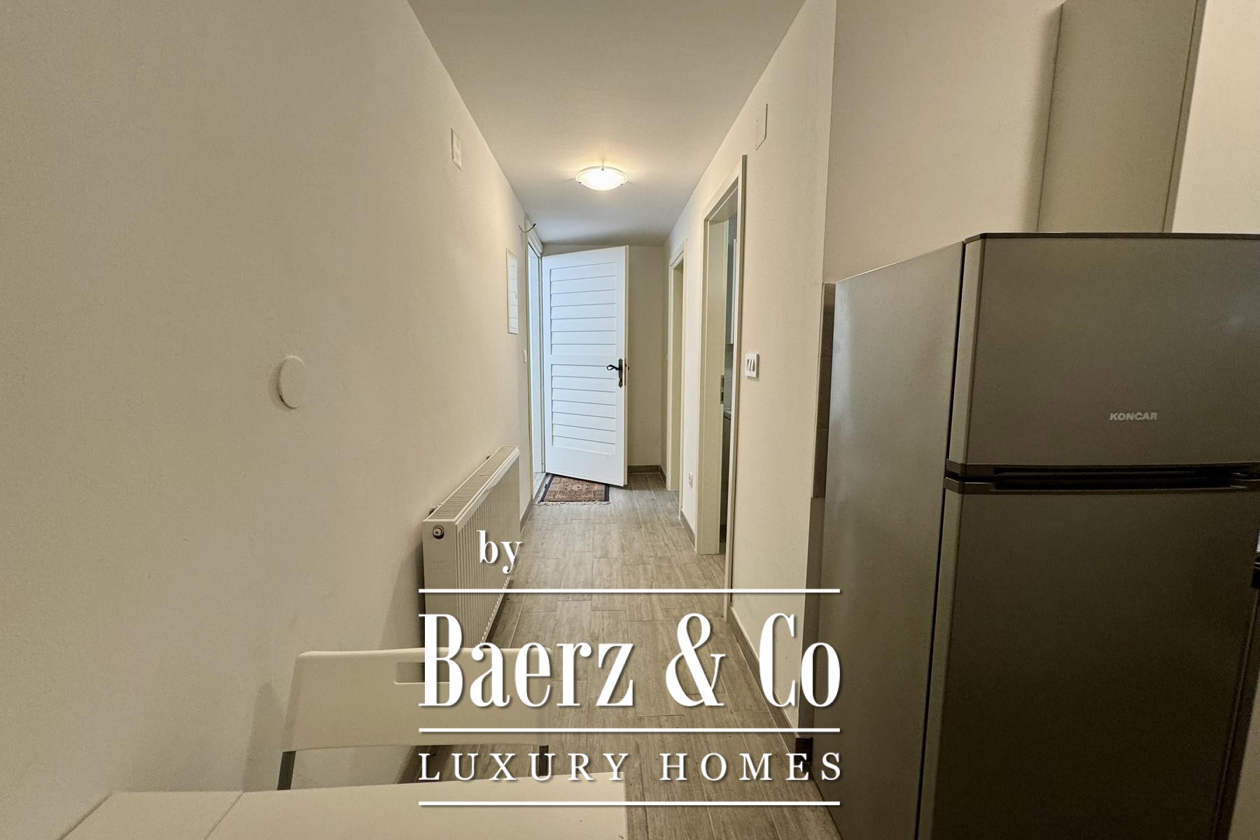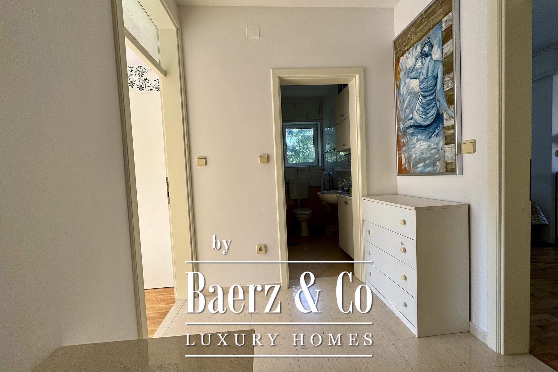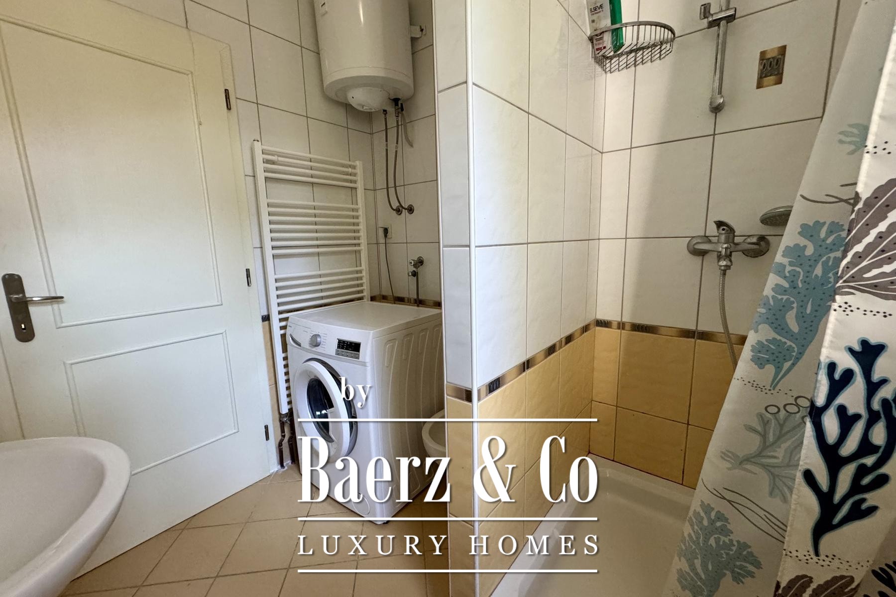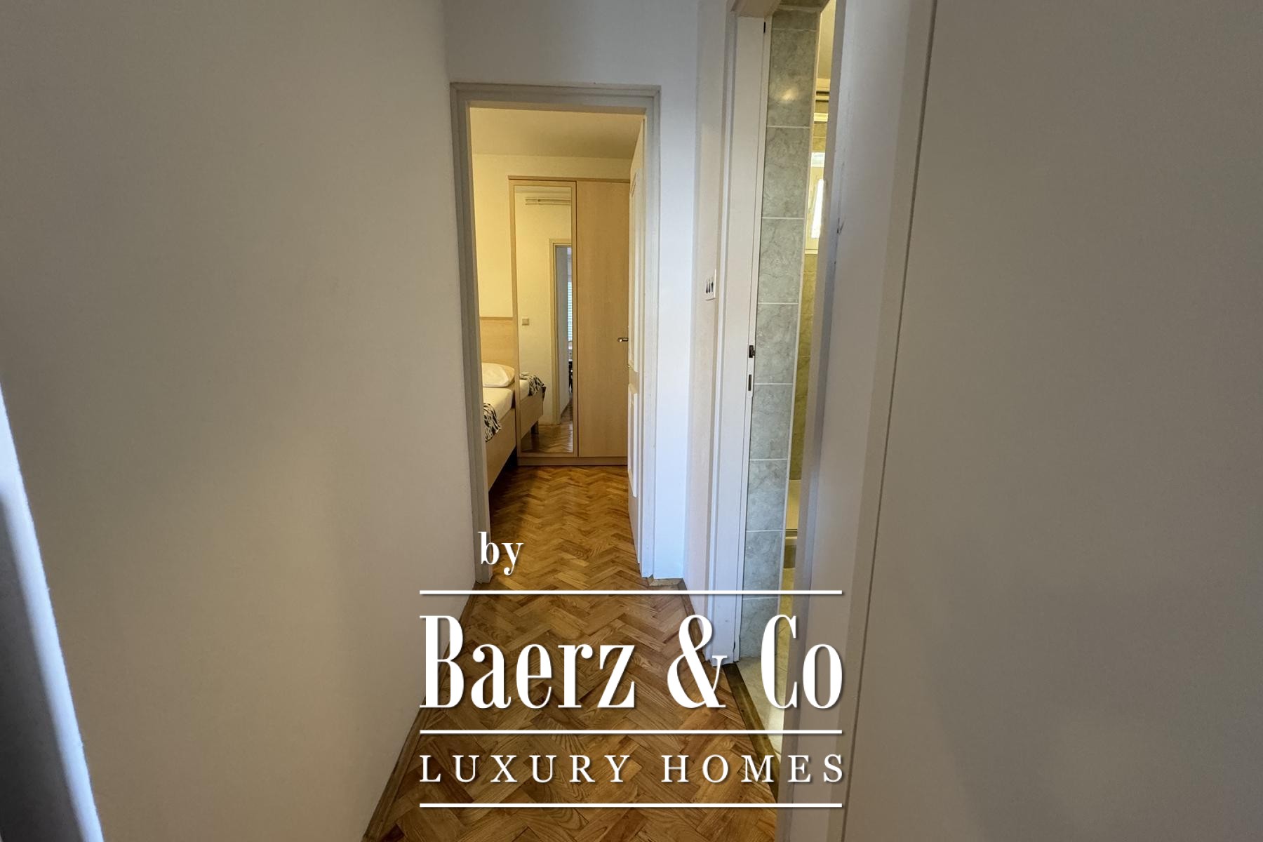 The main two-story apartment features two bedrooms, two bathrooms, a storage room, and a generous open-plan living area. Natural light fills the interior, connecting seamlessly to a covered terrace and two balconies, each framing glimpses of the Adriatic and the ever-changing Mediterranean light.