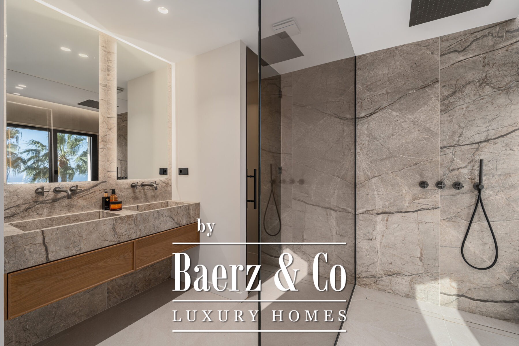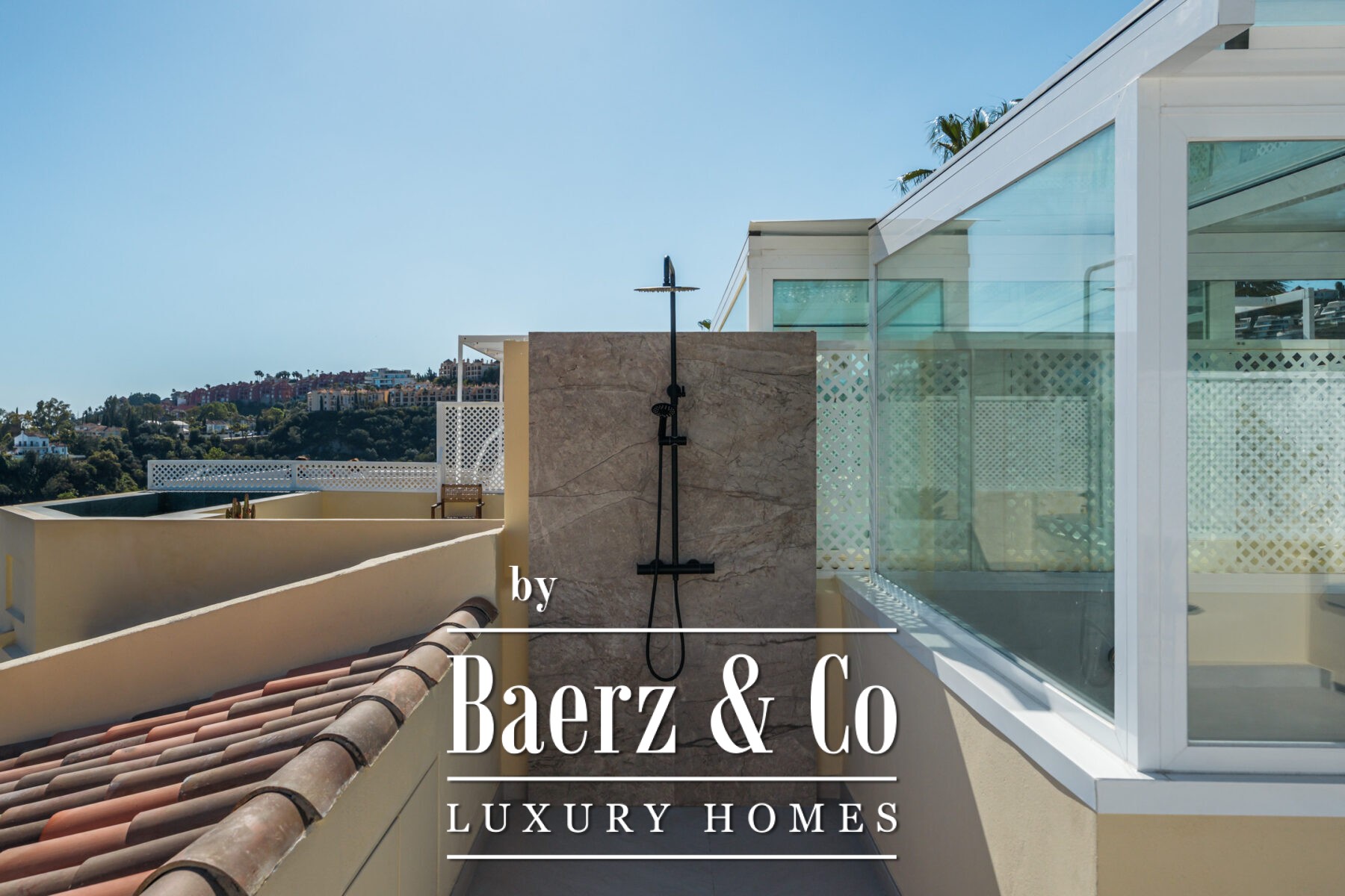 Above, the rooftop solarium is outfitted for relaxation year-round, with views spanning the Mediterranean and La Concha mountain, a lounge, fireplace, bar, outdoor shower, and sunbeds. Residents of this gated community enjoy shared amenities, including a communal pool and proximity to La Quinta Golf & Country Club’s 27-hole course. The area surrounds one with established excellence: Marbella’s beaches are ten minutes away, luxury shopping and restaurants within easy reach, and schools such as Aloha College and Atalaya International close by. Smooth connections to Marbella, Estepona, and Málaga Airport ensure both privacy and access, underscoring the lasting appeal of this property. This meticulously crafted townhouse in Benahavís offers understated luxury, intentional design, and a readymade lifestyle for both permanent and seasonal enjoyment.