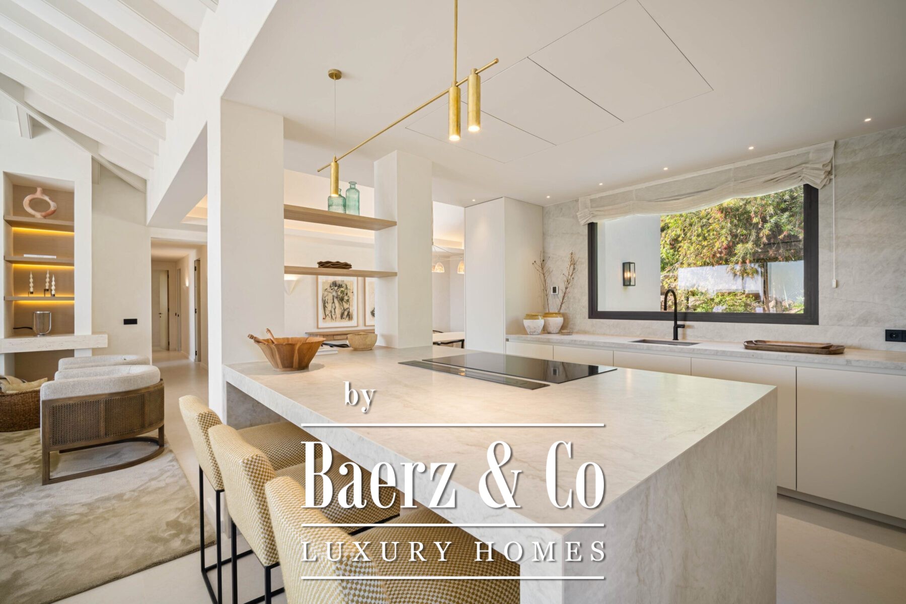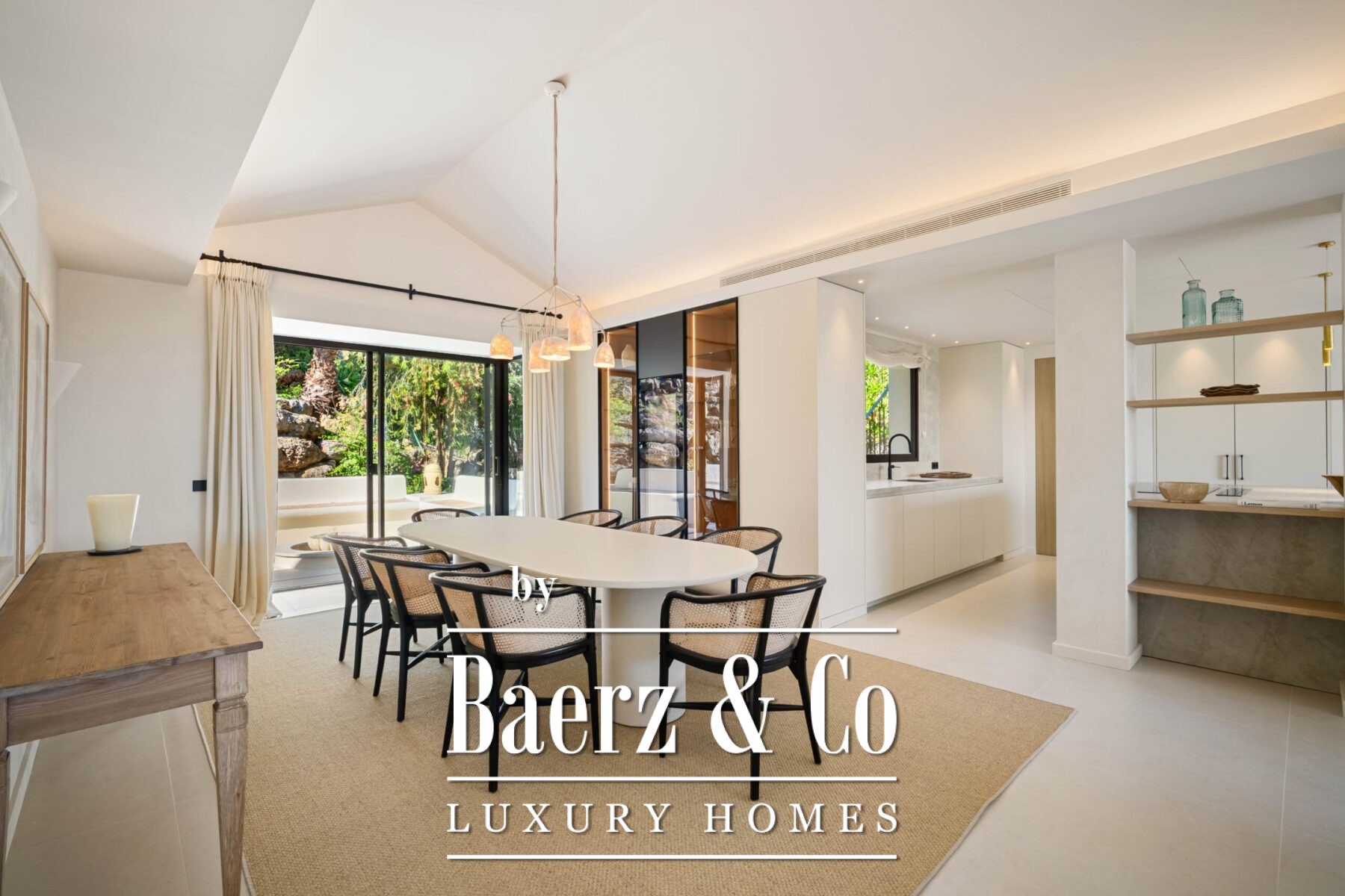 Step inside to discover a calming palette of natural tones, soaring vaulted ceilings, and an open-plan living space that seamlessly flows into a modern kitchen and dining area. Each detail has been carefully curated, from the sleek finishes and custom furnishings to the high-spec appliances and ambient lighting. Floor-to-ceiling glass doors invite natural light throughout and open onto a generous terrace complete with a sunken lounge, outdoor kitchen, and a striking infinity-edge pool that appears to float above the landscape.