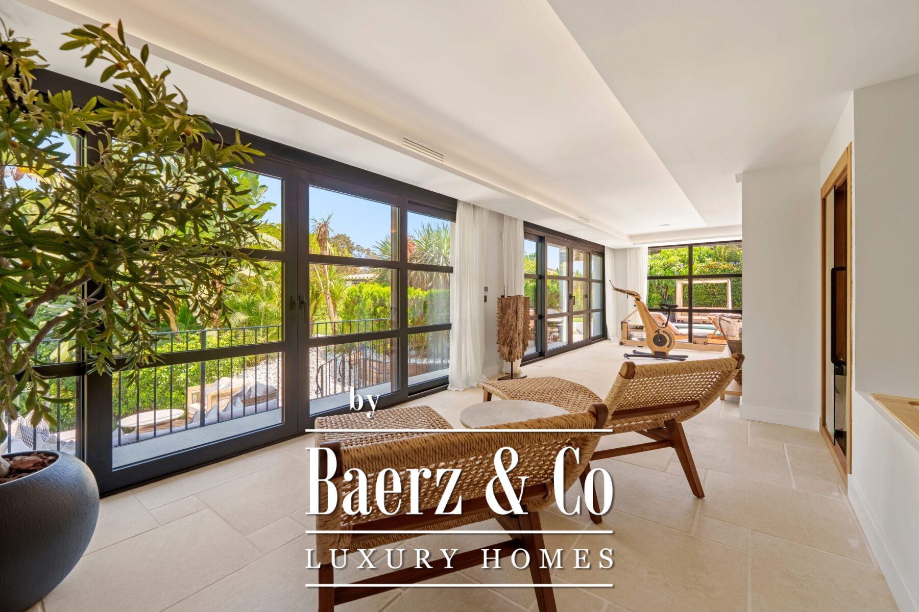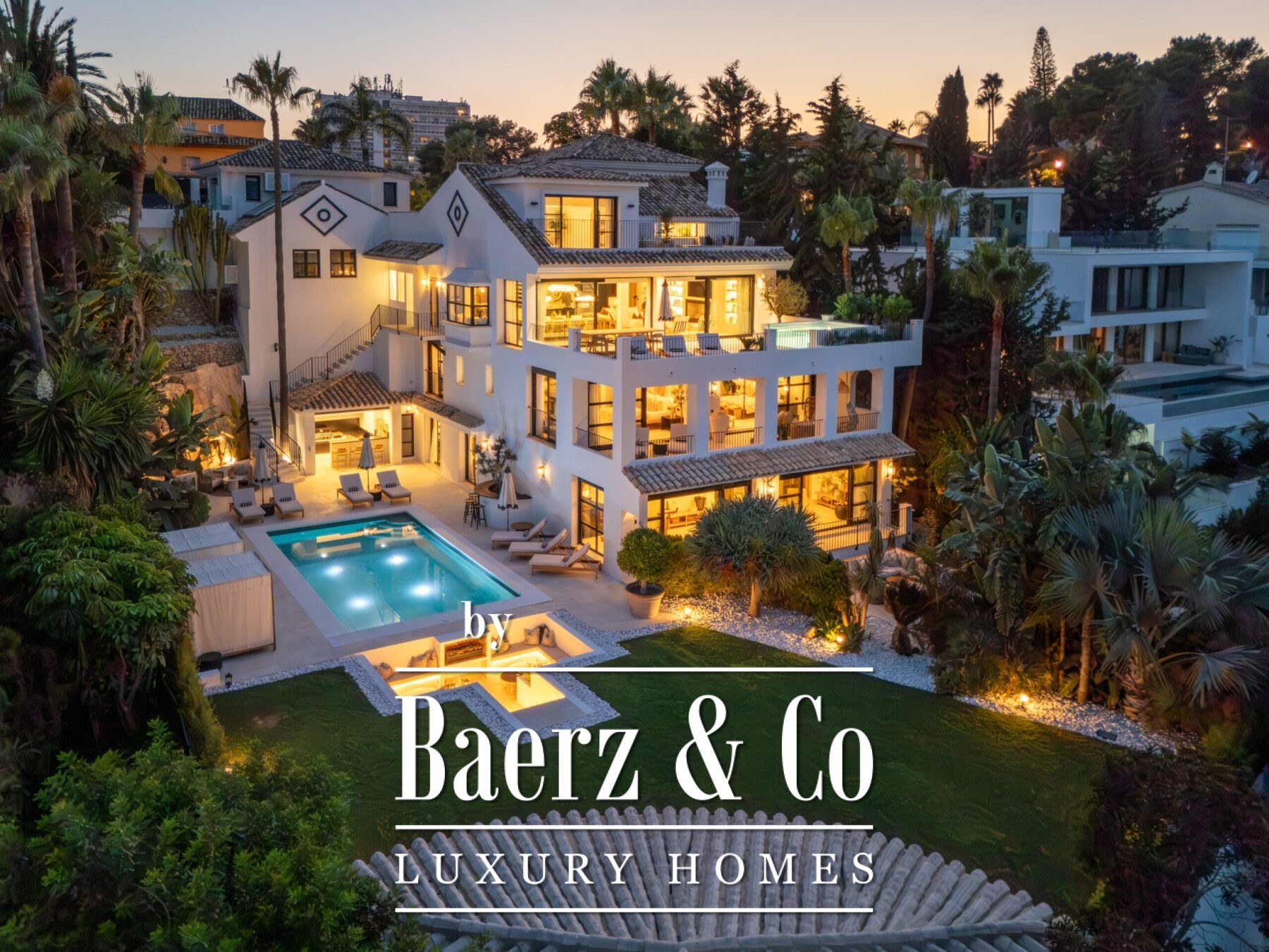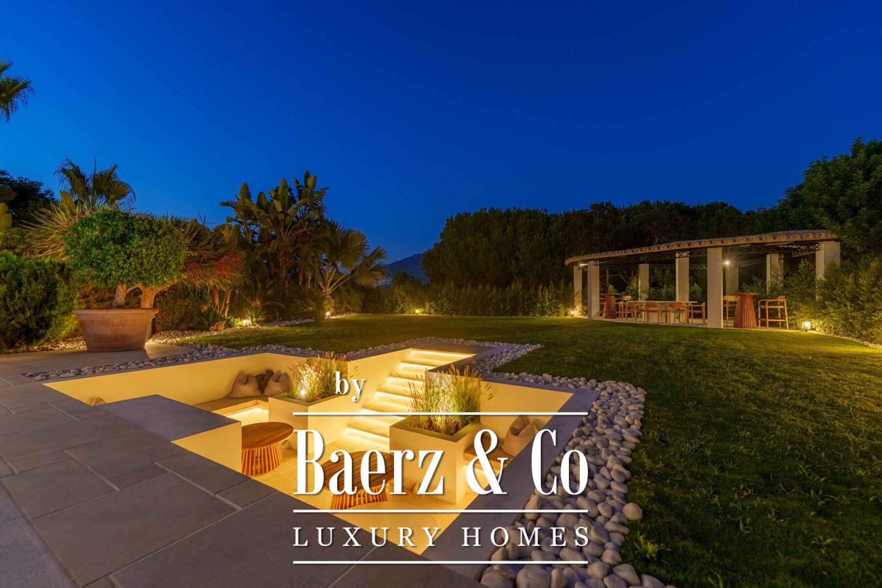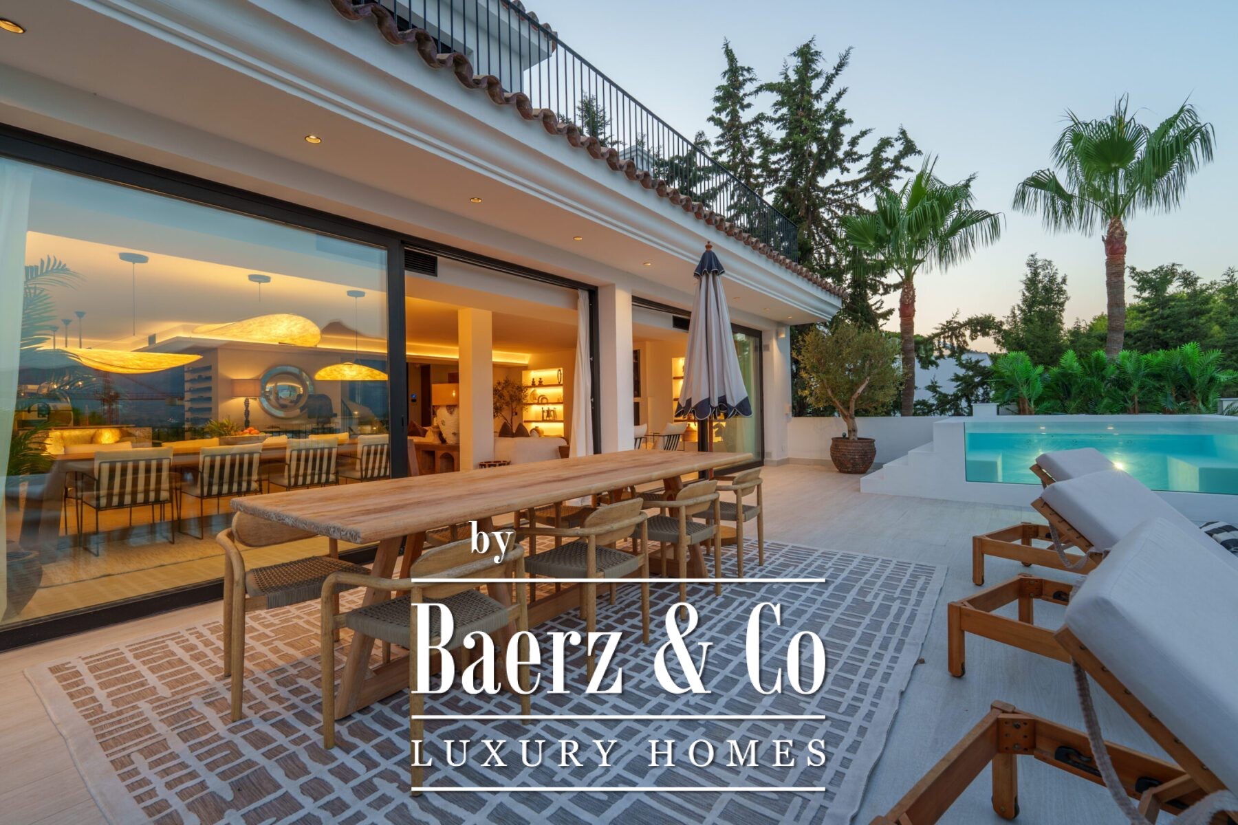 Outside, landscaped gardens embrace a private swimming pool and sunken lounge, adorned with ambient lighting and shaded spaces for tranquil reflection or social occasions. A multi-car garage, security features, and proximity to golf courses, the beach, Puerto Banús, and Marbella’s amenities complete the offering.