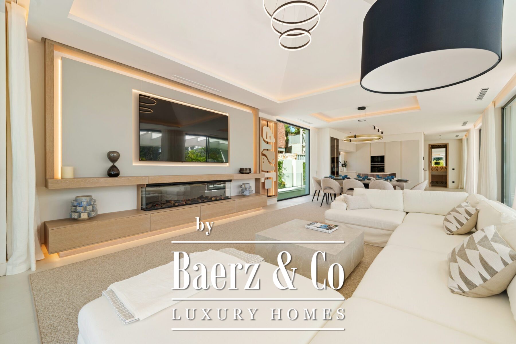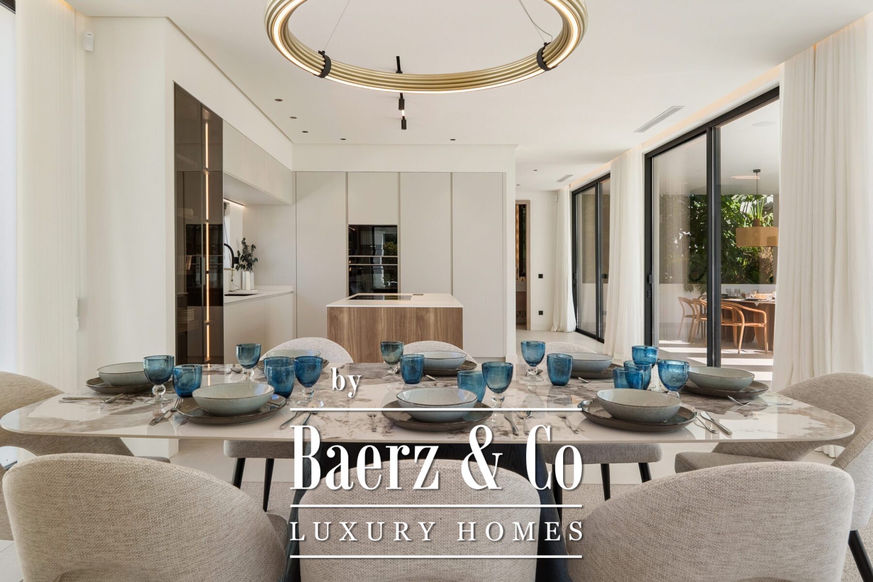 The atmosphere inside is luminous and poised, defined by soft neutral hues, recessed lighting, and generous floor-to-ceiling windows that invite the Andalusian light. The open-plan living and dining zone, anchored by a bespoke entertainment wall and contemporary fixtures, flows seamlessly into a state-of-the-art kitchen where a wood island and integrated appliances meet sleek cabinetry. This fluid spatial experience extends to a dining area meant for meaningful gatherings.