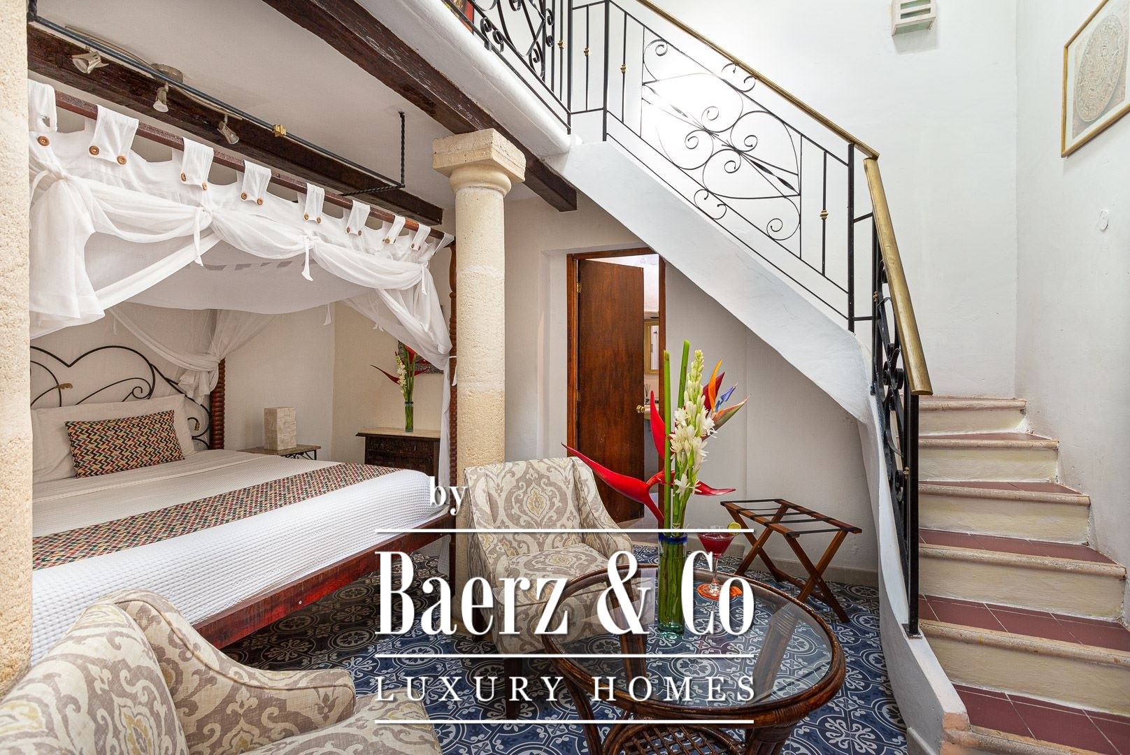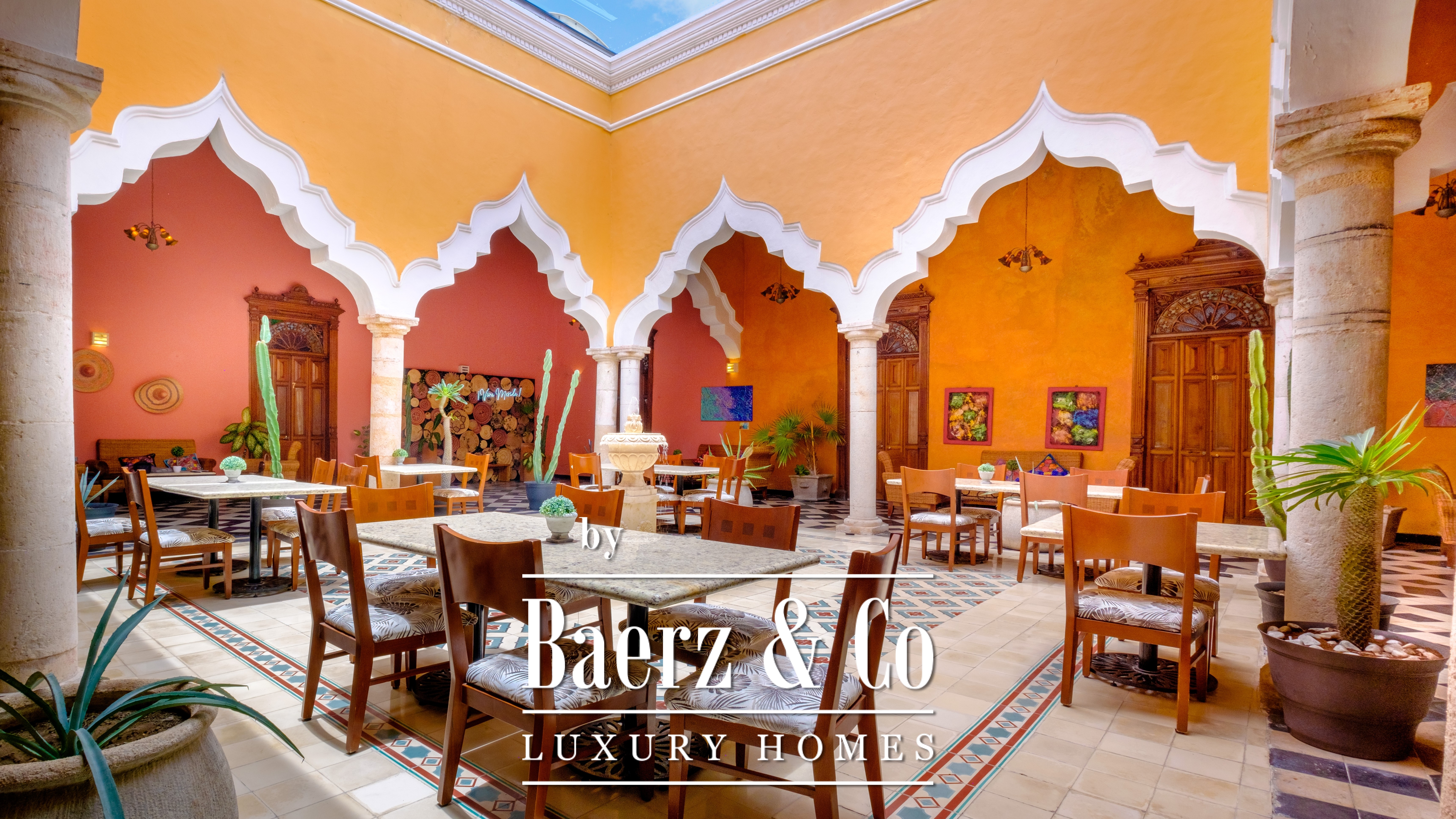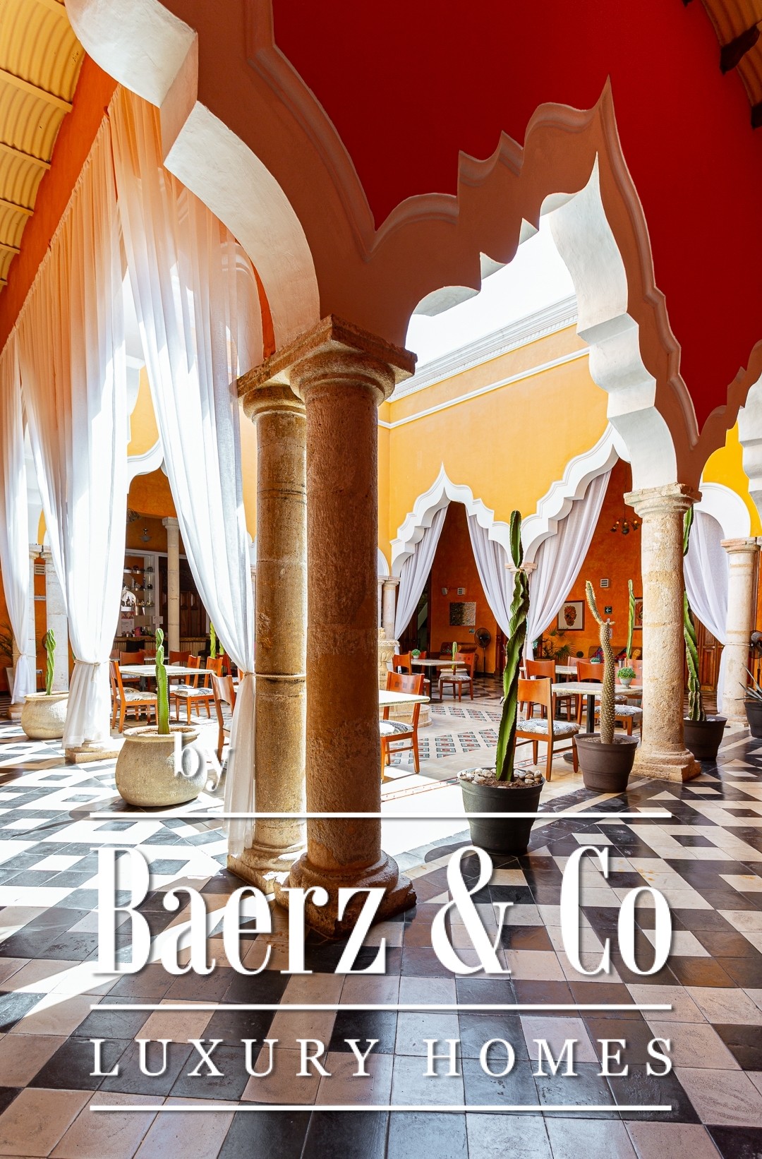 Hotel Merida Historic Center offers a rare convergence of heritage and contemporary efficiency on a prominent corner just four squares from the Main Plaza. This distinguished hotel for sale in Merida reflects centuries of architectural preservation, featuring a patio with mixtilinear arches set on Doric quarry columns, antique vaulted ceilings reinforced on steel rails, and striking 17th century wooden doors, all immaculately conserved.