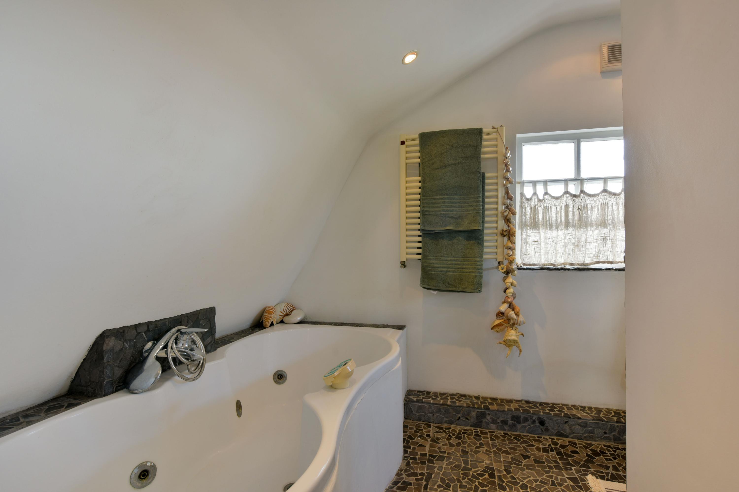 The bathroom, located at the rear of the house, is fully equipped. Here you can enjoy a spacious walk-in shower with rain shower, a luxurious whirlpool bathtub, a toilet, a double vanity unit, and a towel radiator. A perfect place to start or end your day in relaxation.