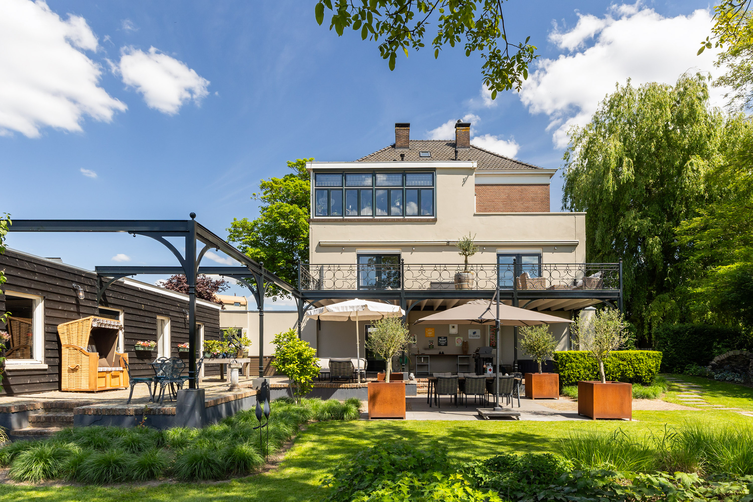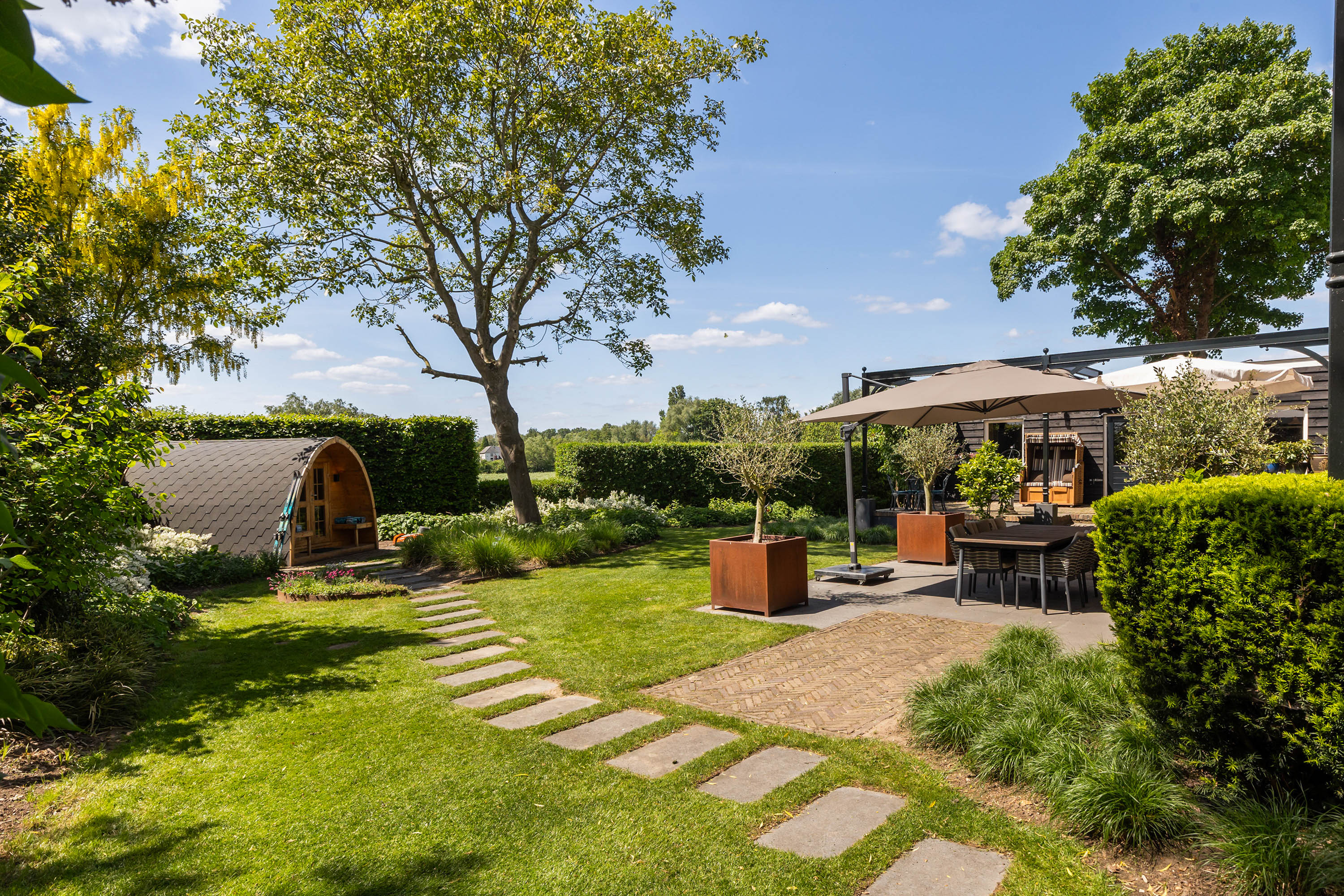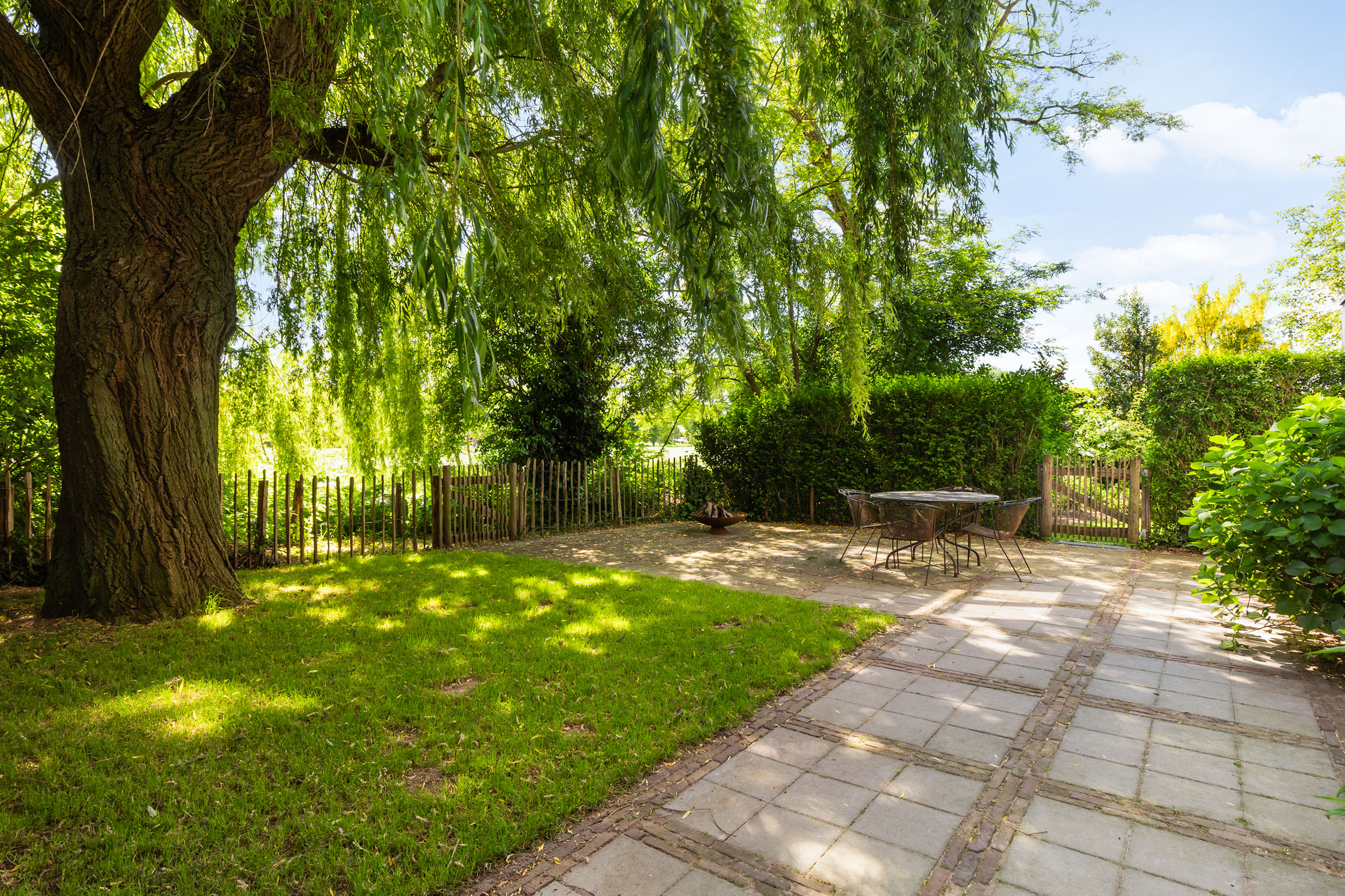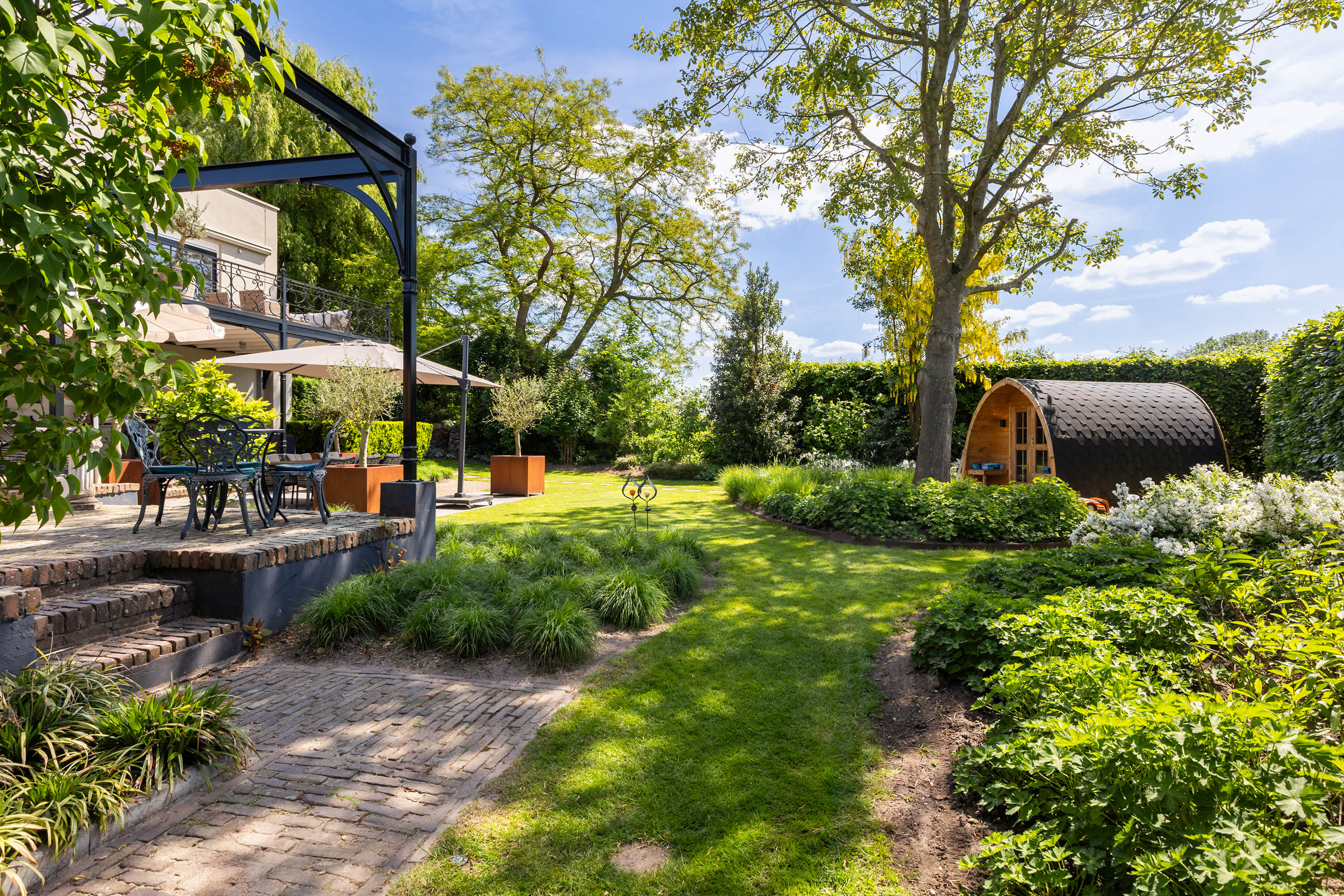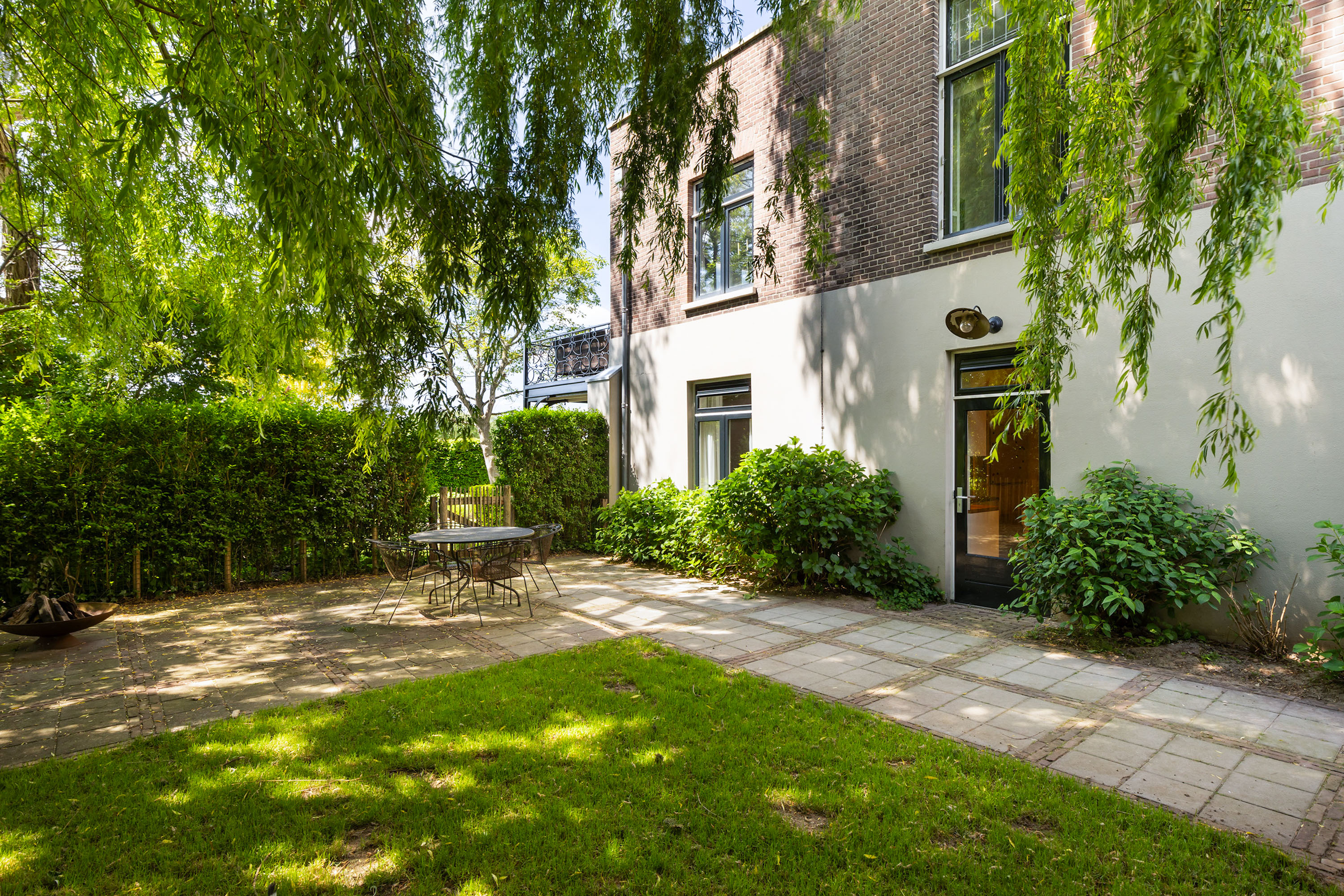The outdoor space forms a natural extension of the home. The garden, redesigned in 2022, has been thoughtfully arranged with a focus on tranquillity and usability. Clean lines are combined with natural planting, and multiple terraces offer both sun and shade throughout the day. The veranda, featuring a timber beam ceiling and prepared for an outdoor kitchen and wellness facilities, enhances the enjoyment of outdoor living. To the side of the plot, a second garden area with lawn and a graceful weeping willow adds to the sense of greenery and privacy.