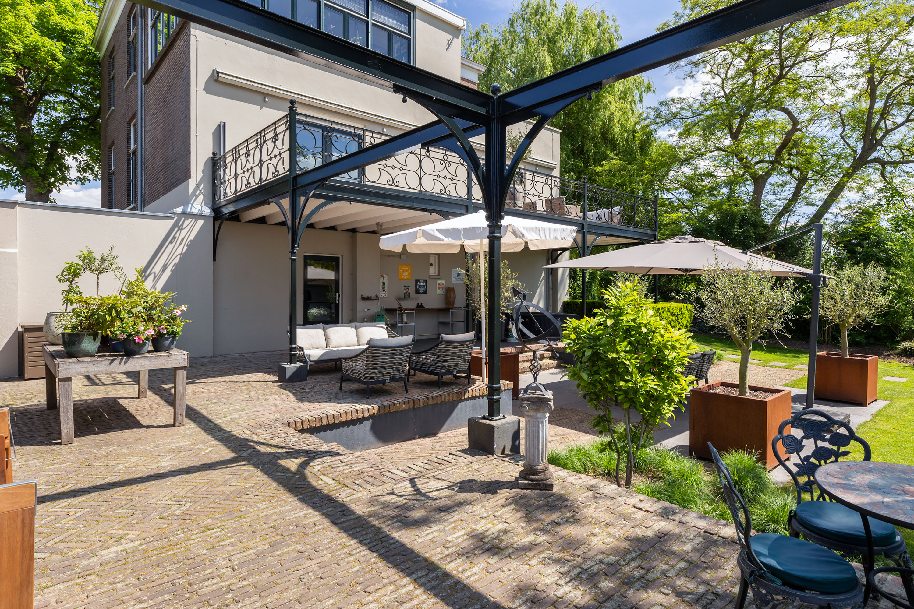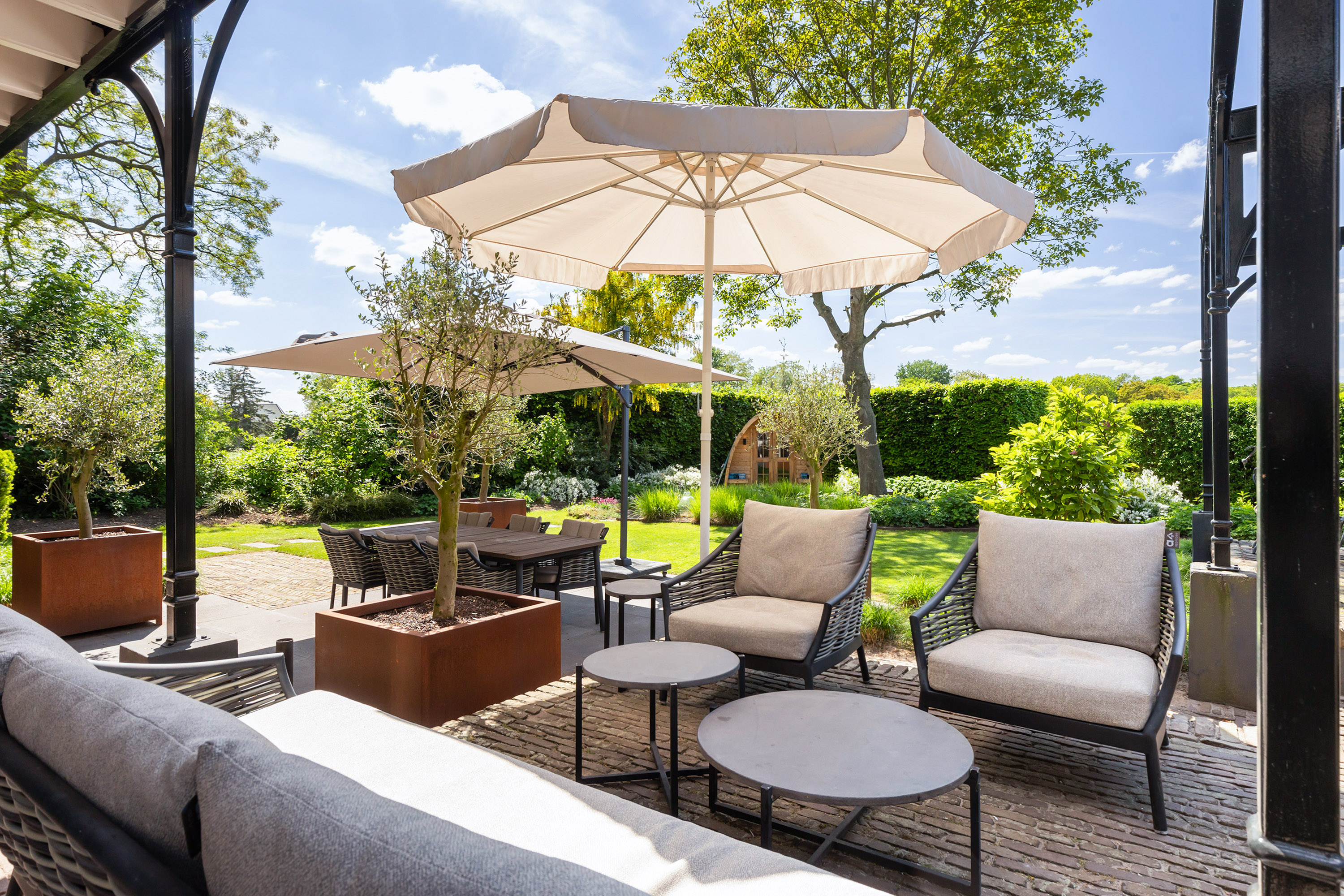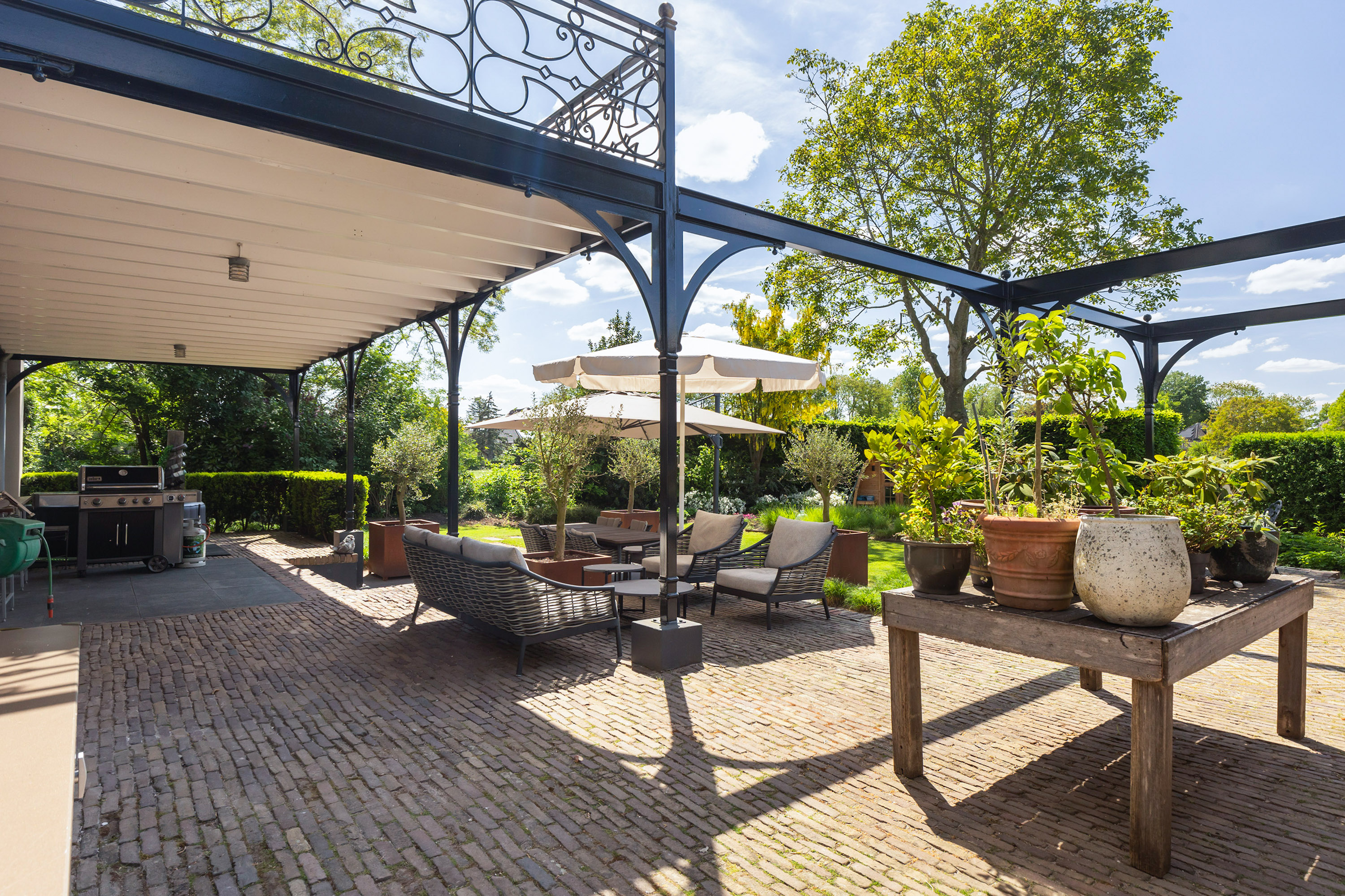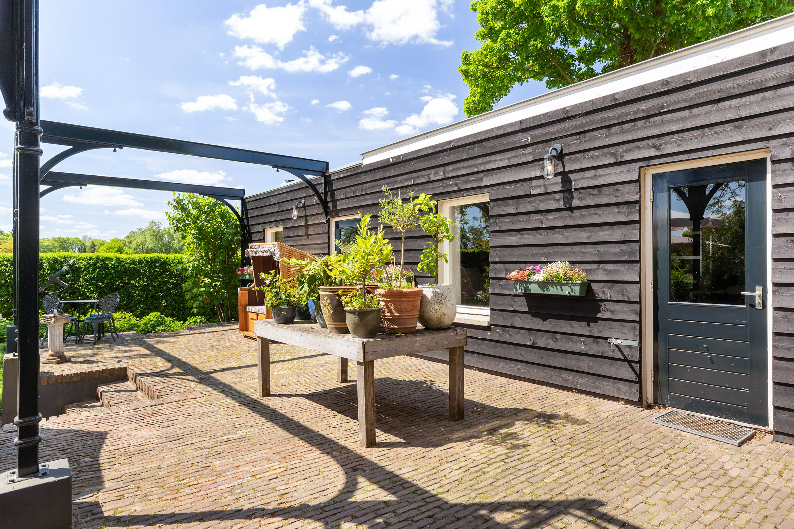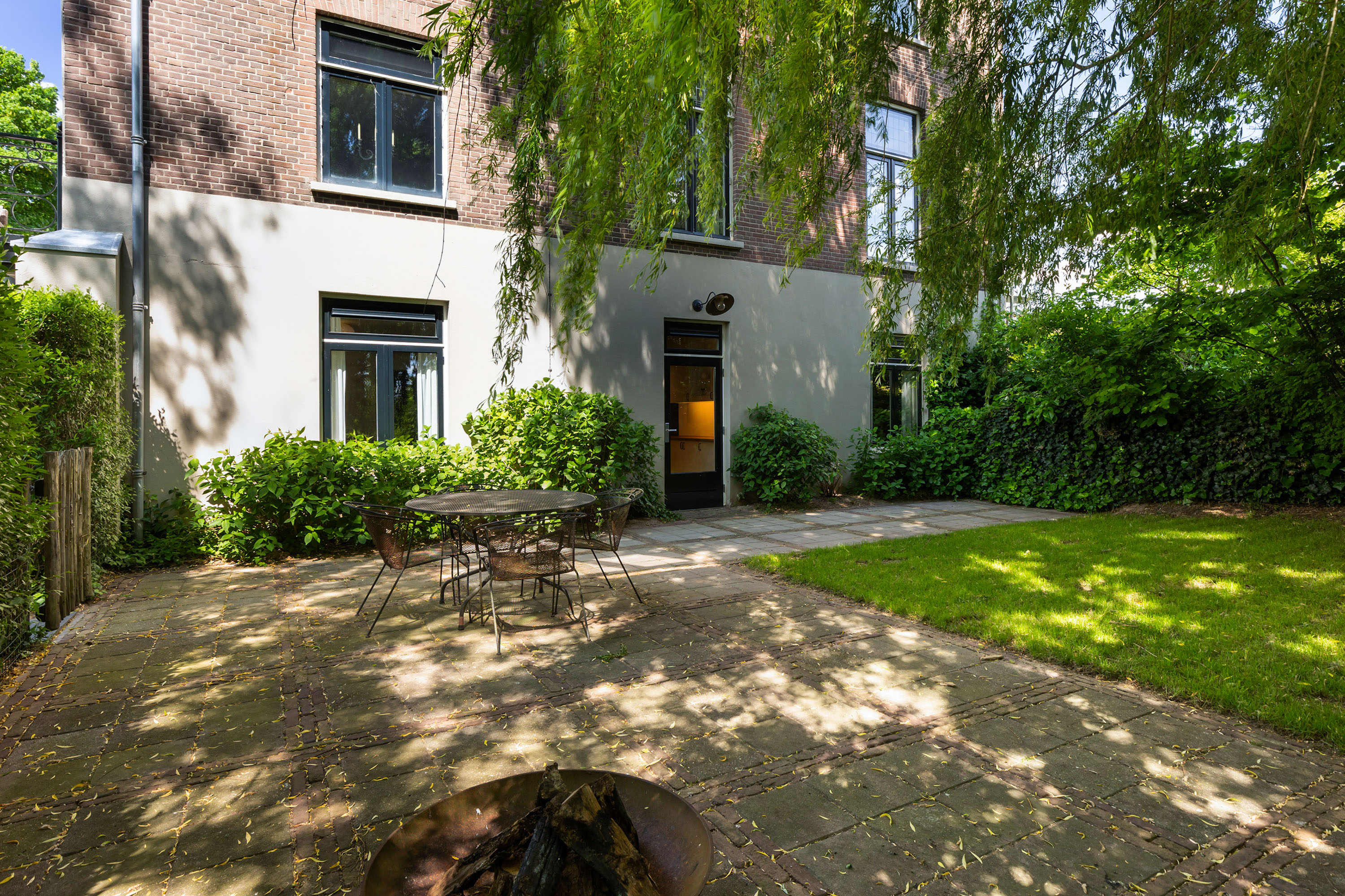 The outdoor space forms a natural extension of the home. The garden, redesigned in 2022, has been thoughtfully arranged with a focus on tranquillity and usability. Clean lines are combined with natural planting, and multiple terraces offer both sun and shade throughout the day. The veranda, featuring a timber beam ceiling and prepared for an outdoor kitchen and wellness facilities, enhances the enjoyment of outdoor living. To the side of the plot, a second garden area with lawn and a graceful weeping willow adds to the sense of greenery and privacy.