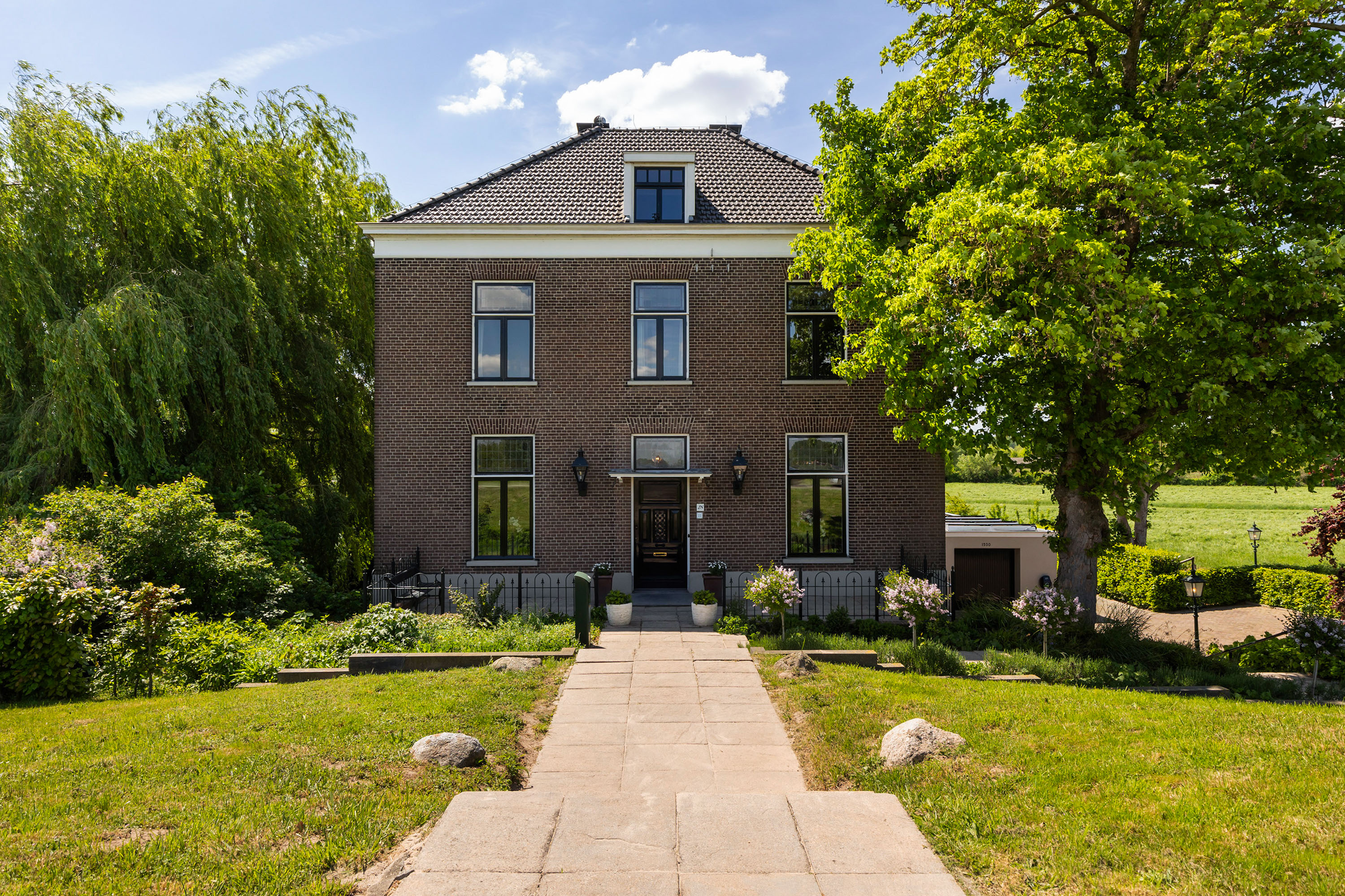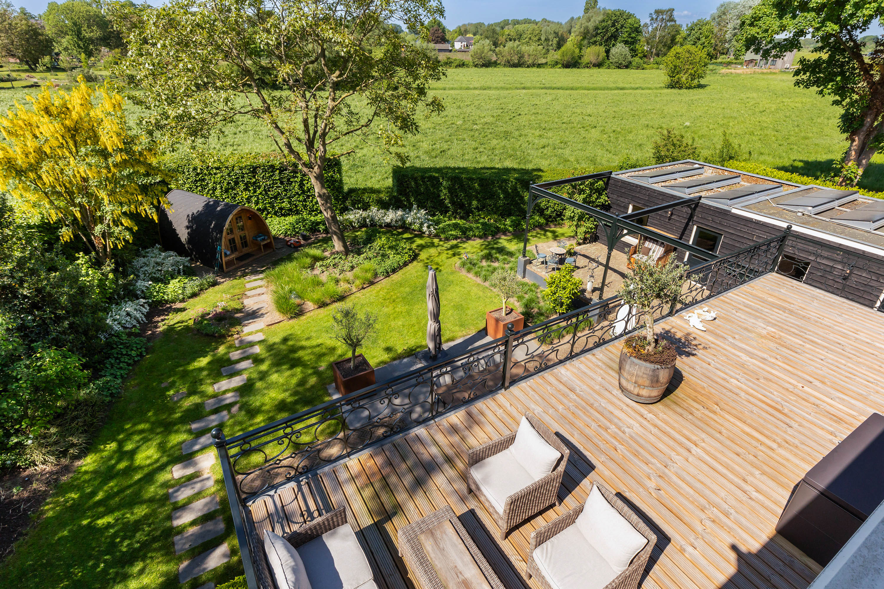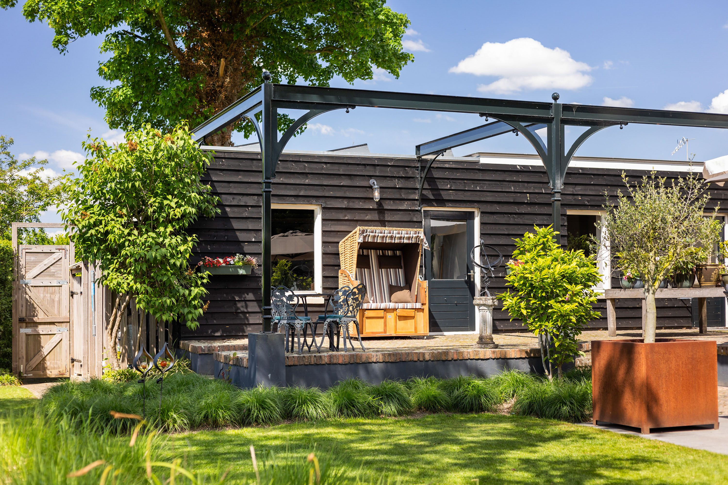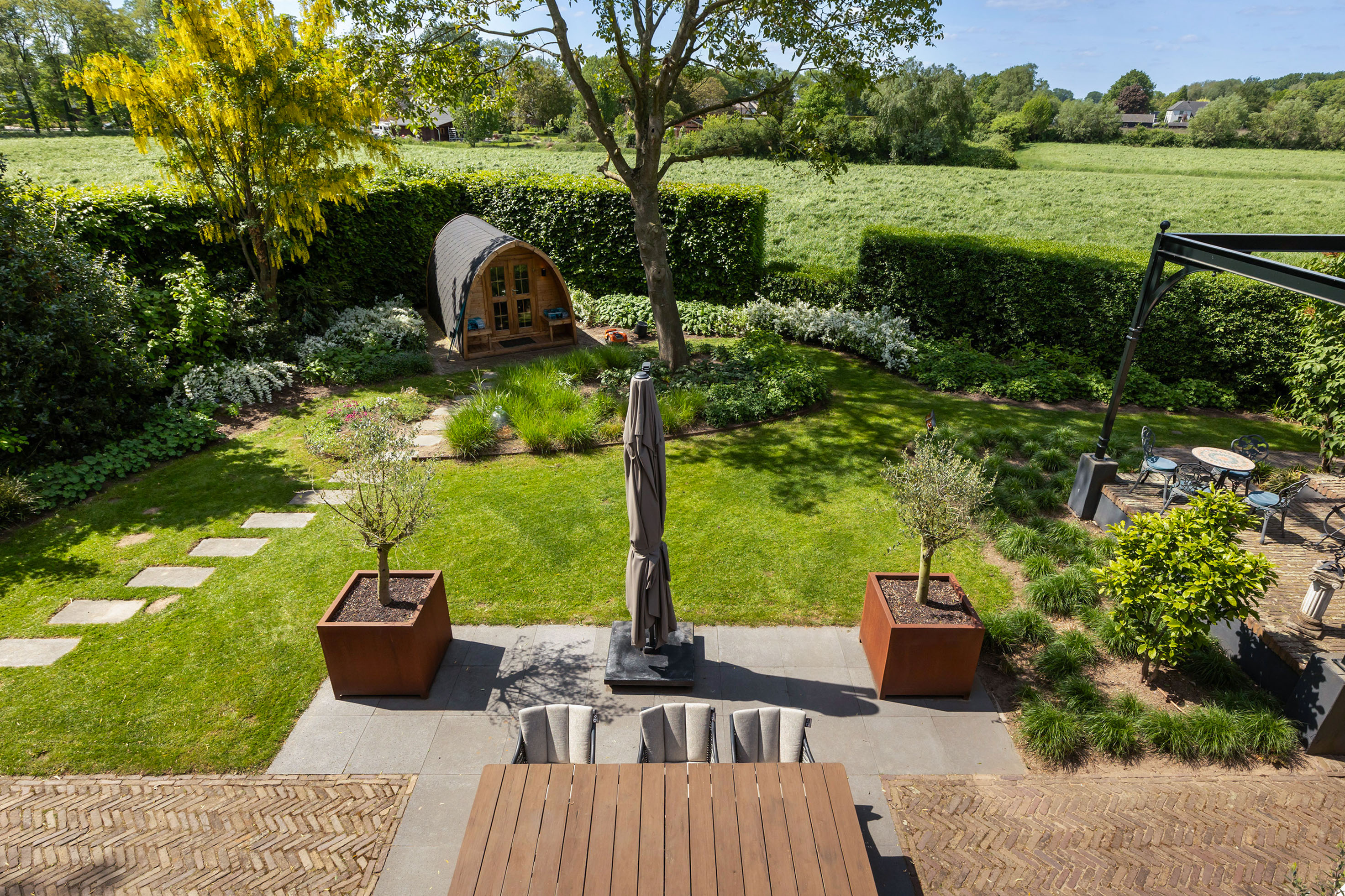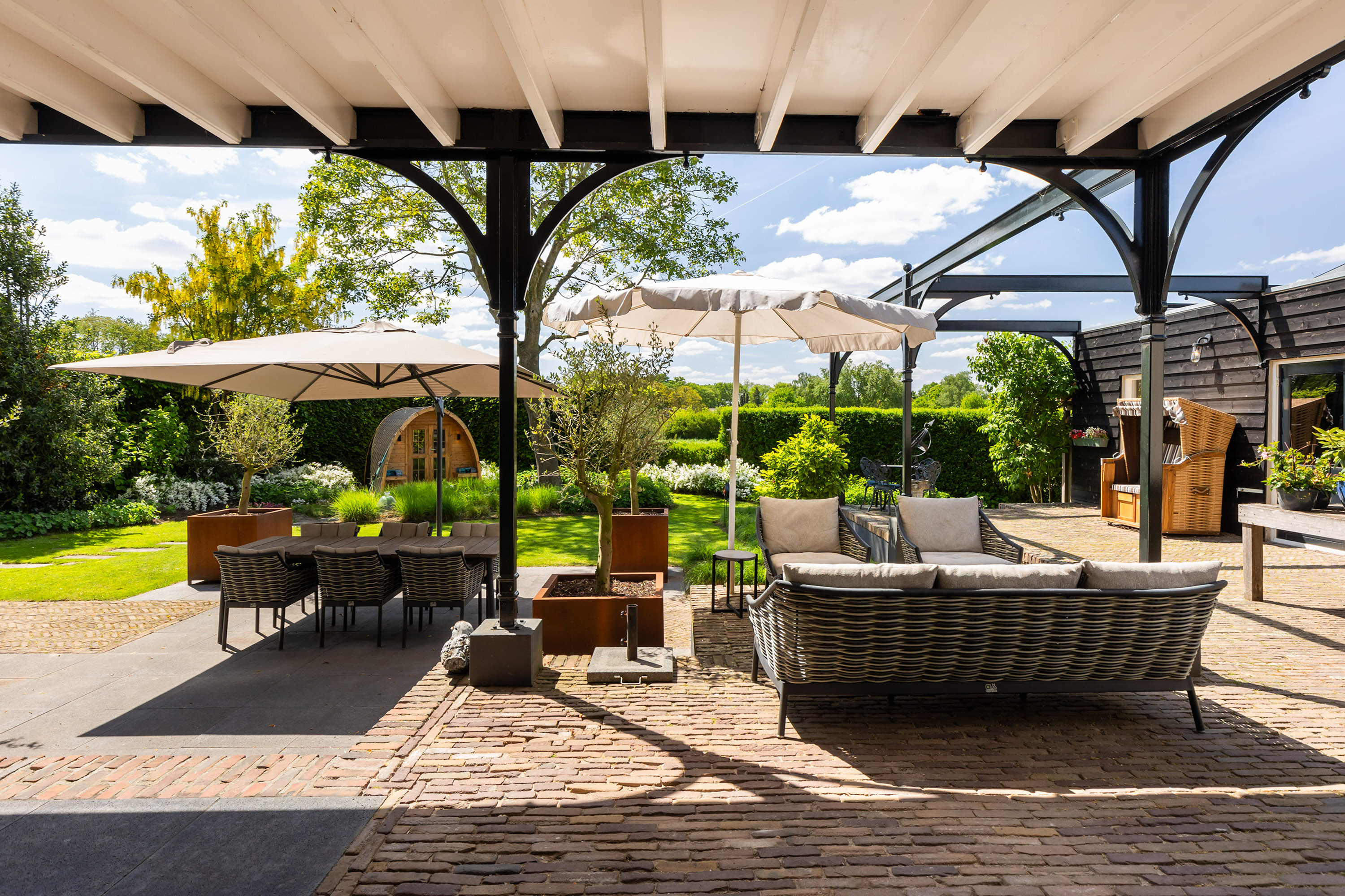 The outdoor space forms a natural extension of the home. The garden, redesigned in 2022, has been thoughtfully arranged with a focus on tranquillity and usability. Clean lines are combined with natural planting, and multiple terraces offer both sun and shade throughout the day. The veranda, featuring a timber beam ceiling and prepared for an outdoor kitchen and wellness facilities, enhances the enjoyment of outdoor living. To the side of the plot, a second garden area with lawn and a graceful weeping willow adds to the sense of greenery and privacy.