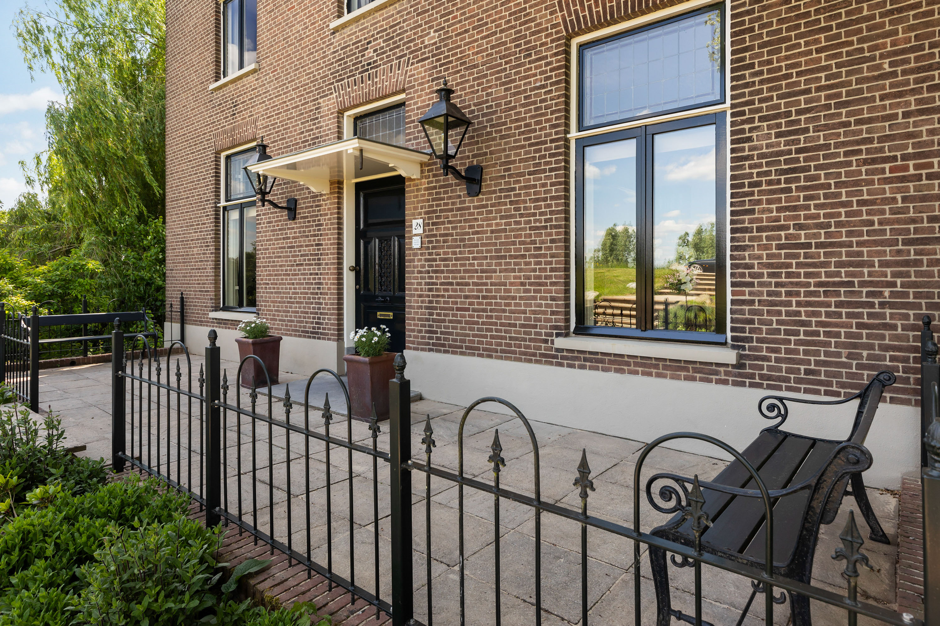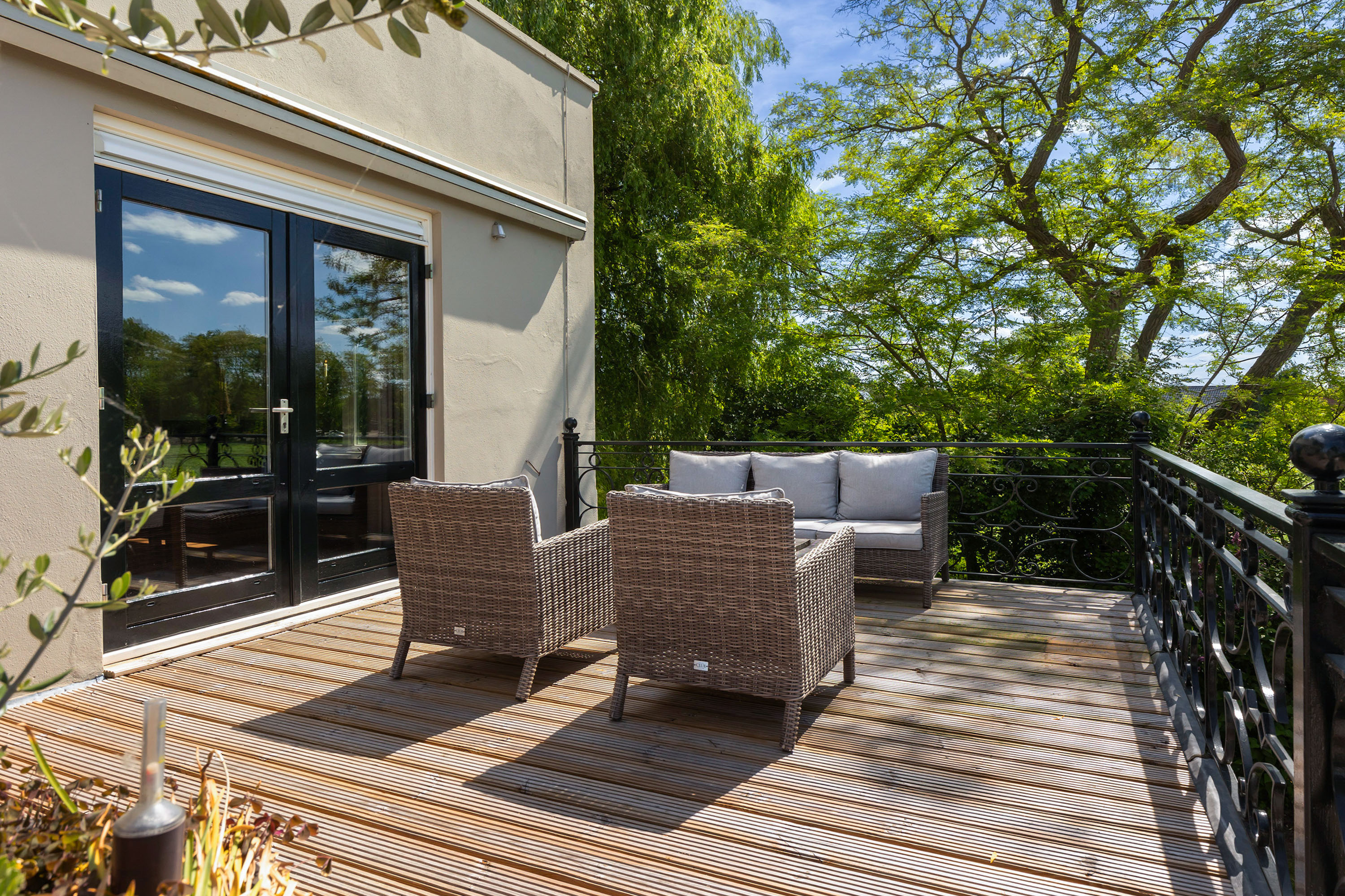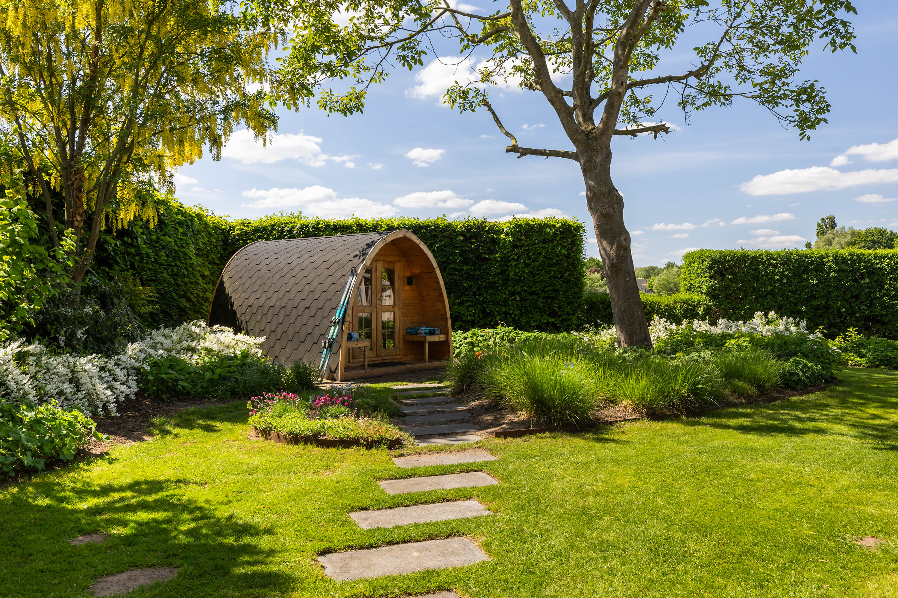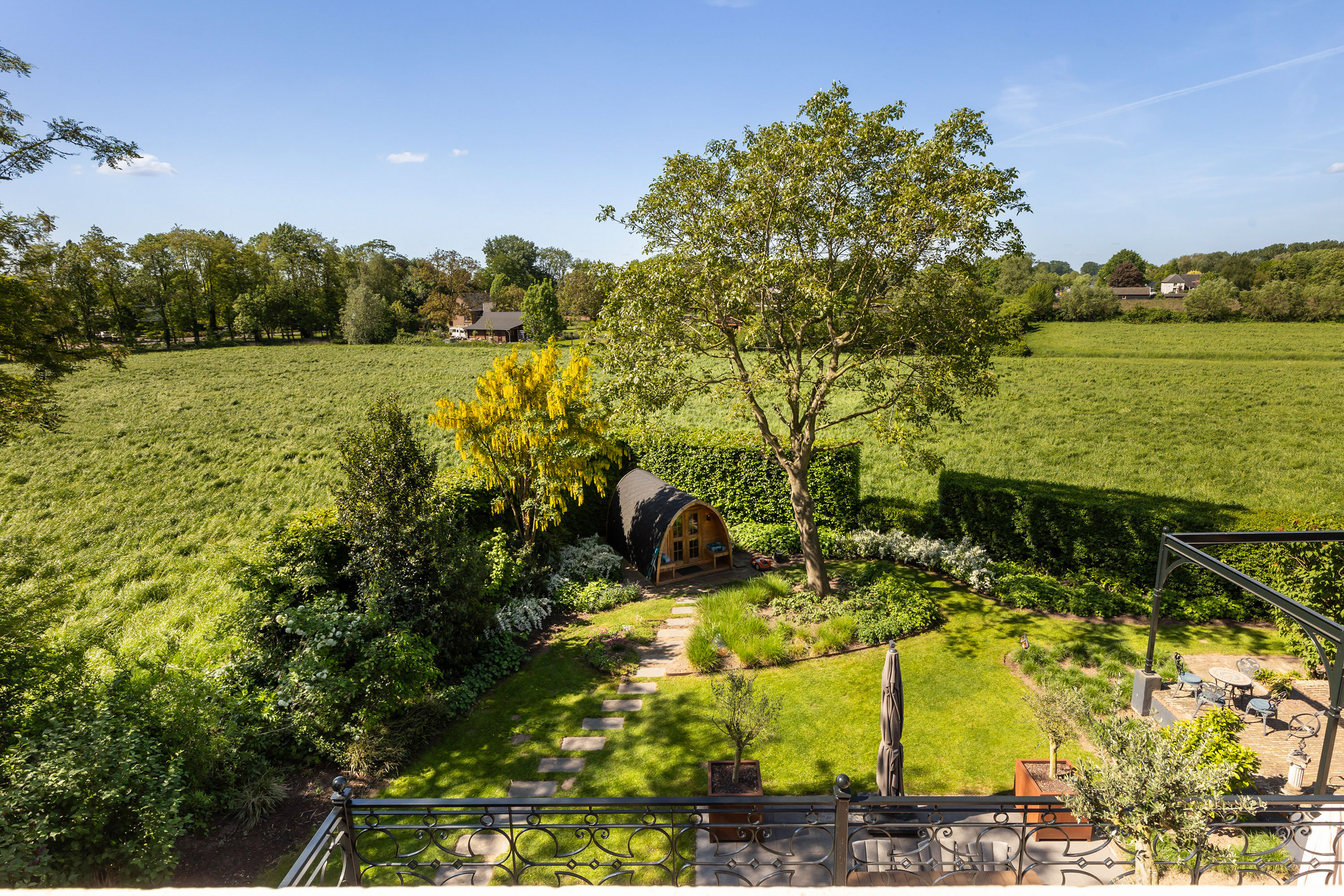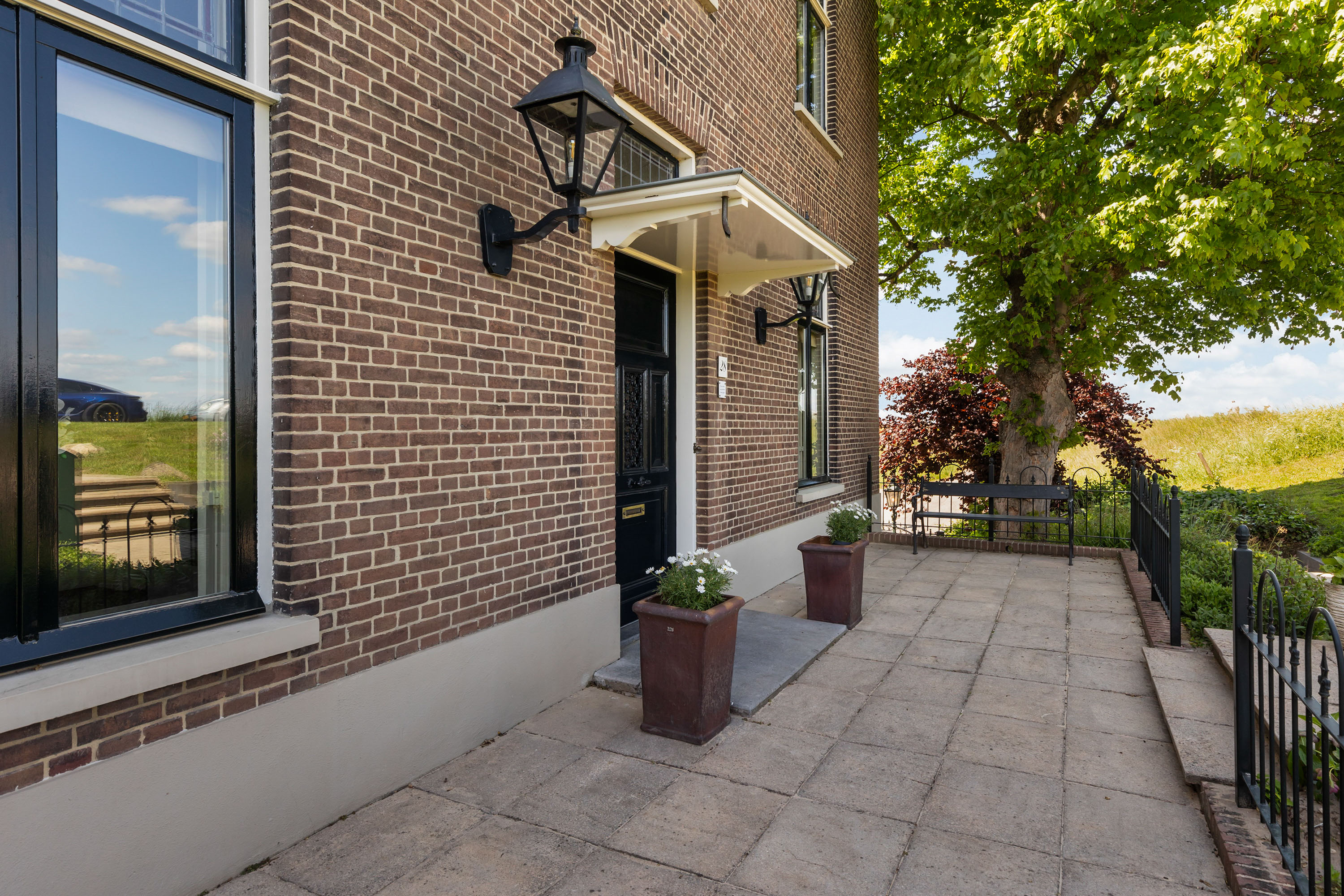 The outdoor space forms a natural extension of the home. The garden, redesigned in 2022, has been thoughtfully arranged with a focus on tranquillity and usability. Clean lines are combined with natural planting, and multiple terraces offer both sun and shade throughout the day. The veranda, featuring a timber beam ceiling and prepared for an outdoor kitchen and wellness facilities, enhances the enjoyment of outdoor living. To the side of the plot, a second garden area with lawn and a graceful weeping willow adds to the sense of greenery and privacy.