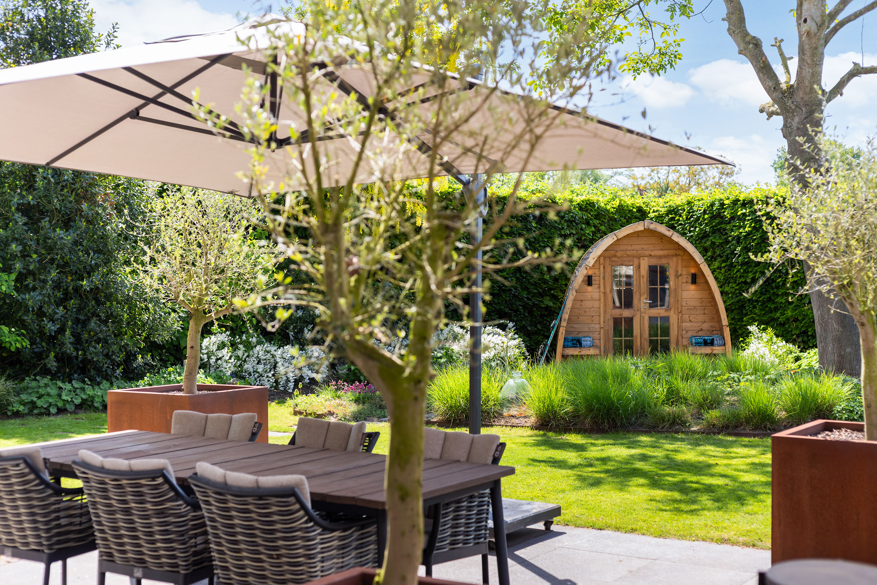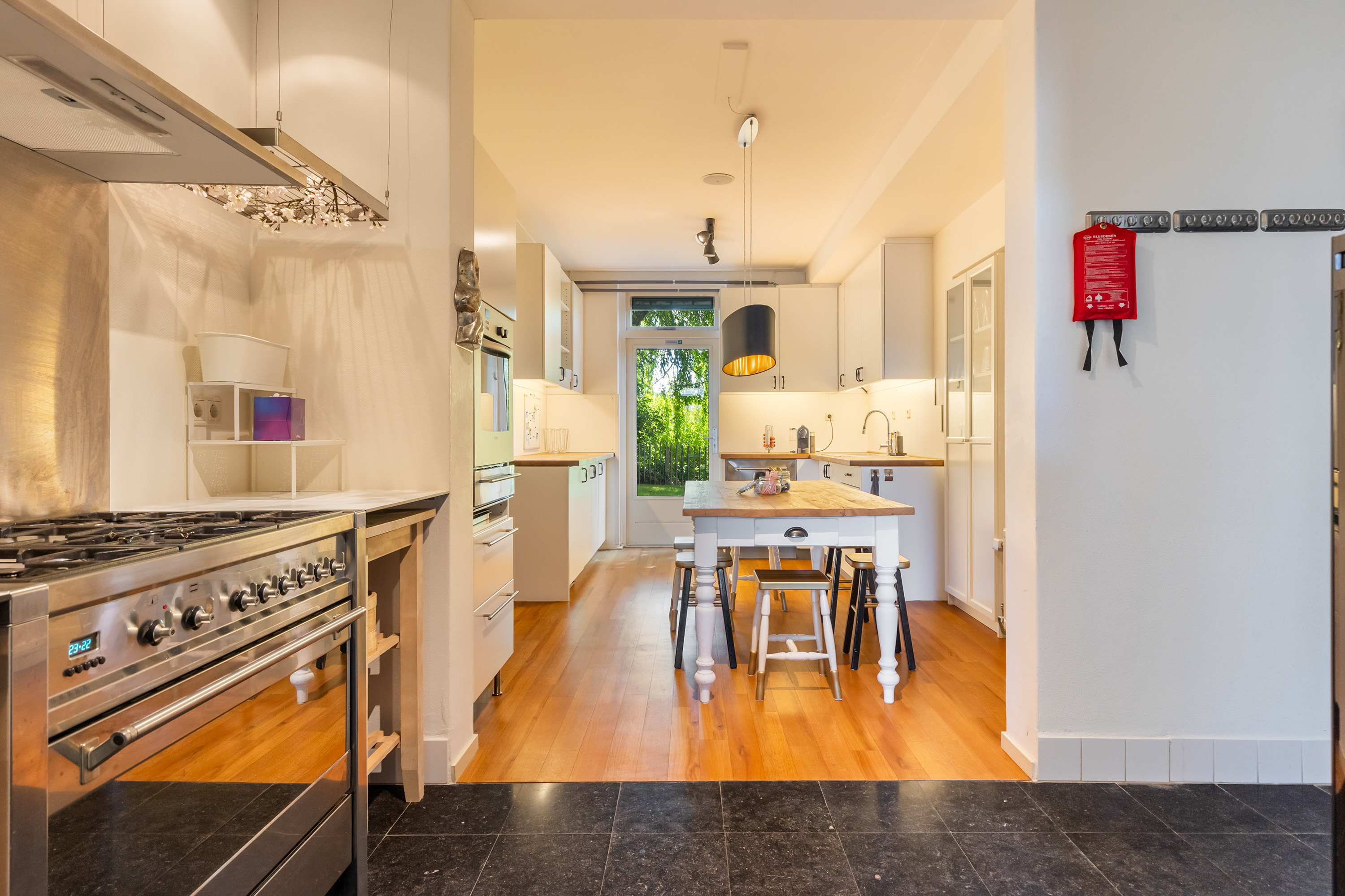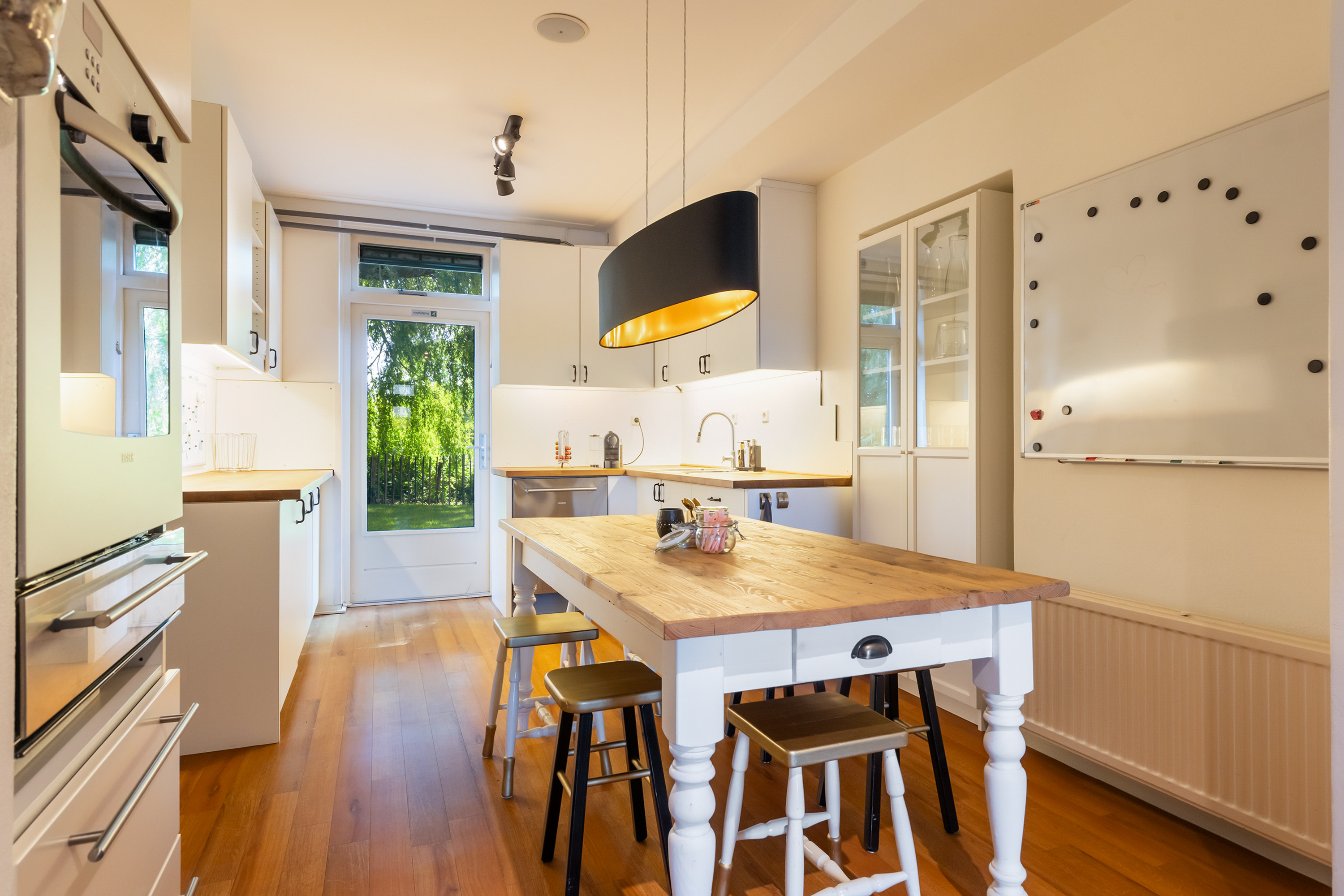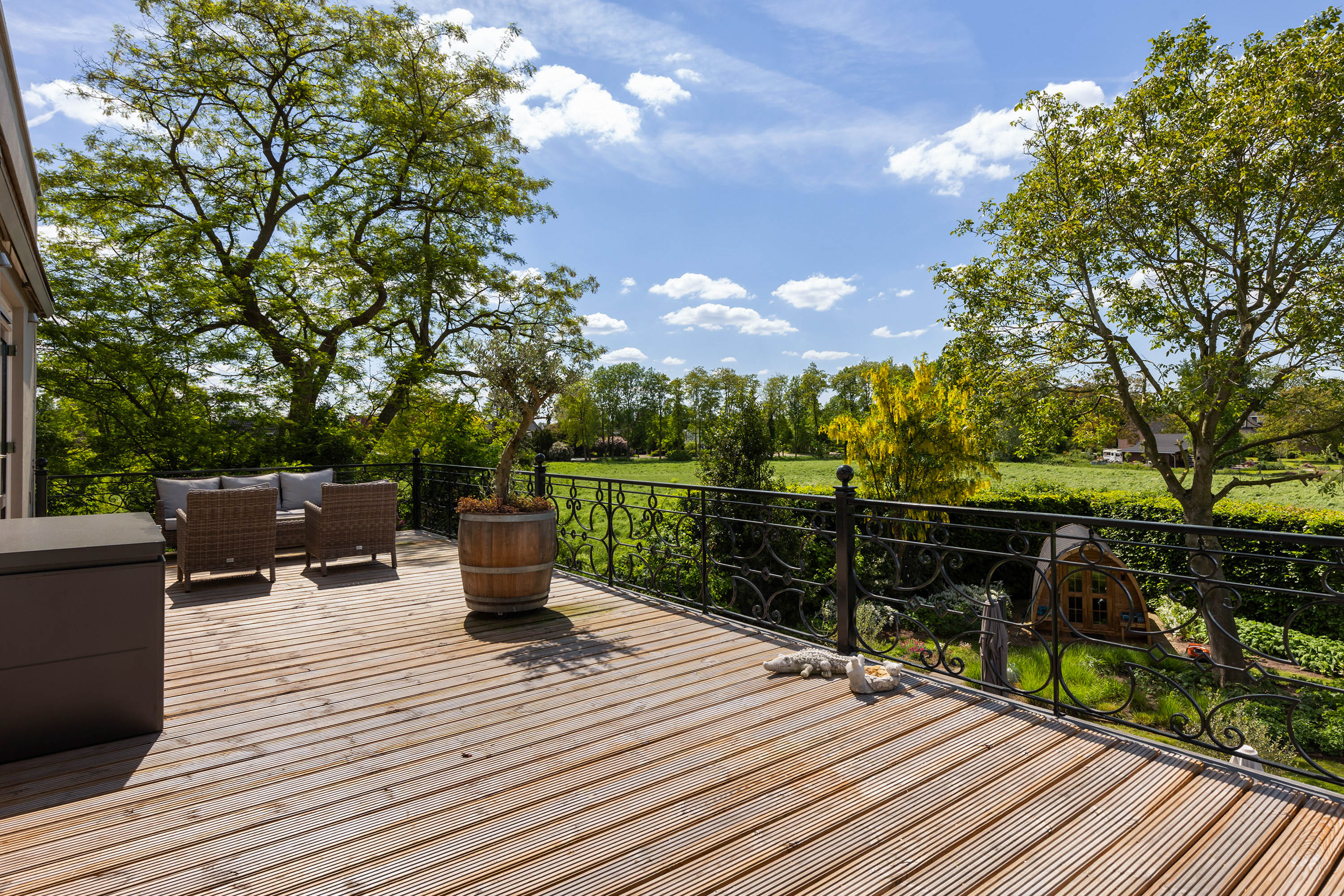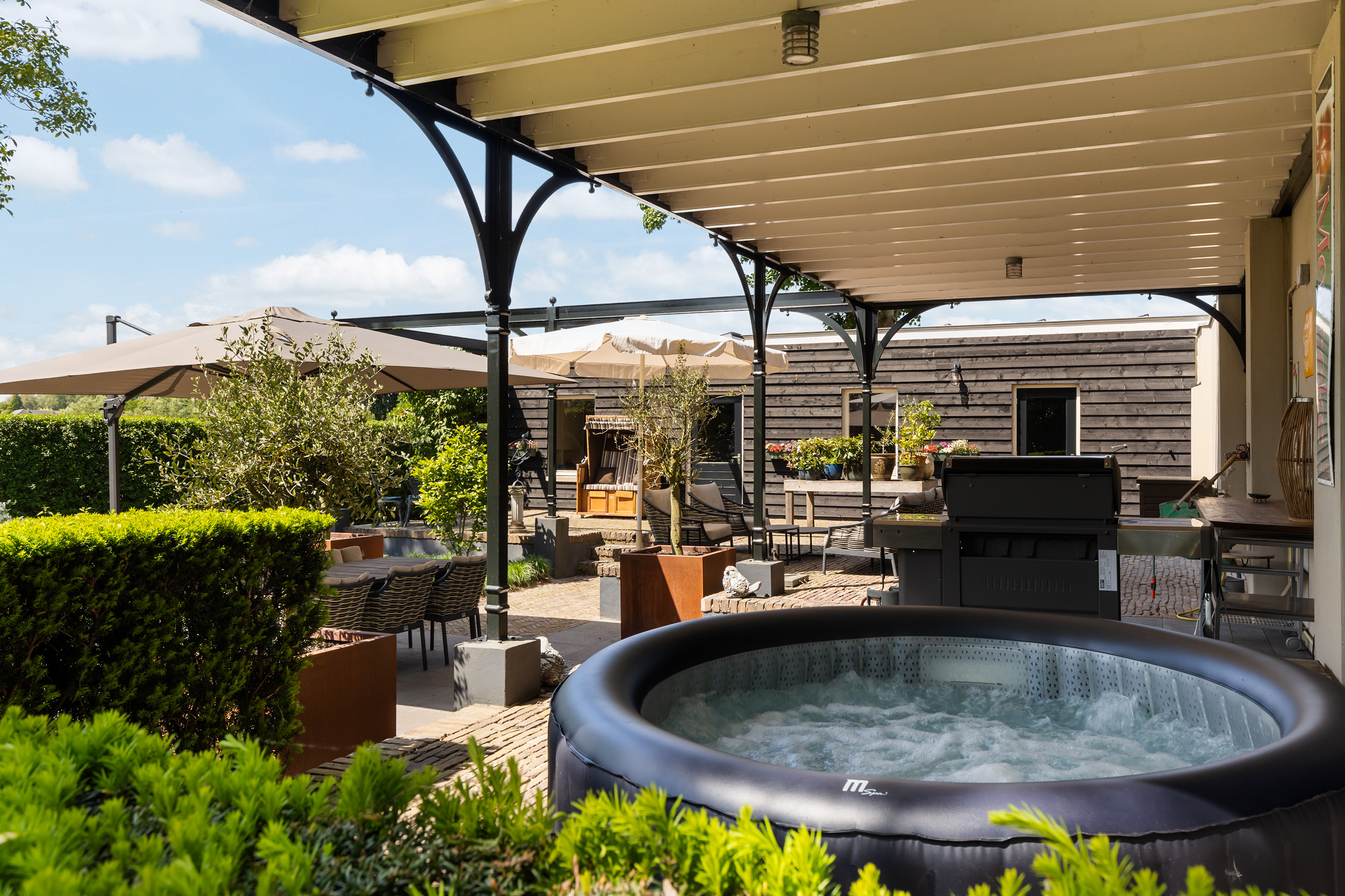 The outdoor space forms a natural extension of the home. The garden, redesigned in 2022, has been thoughtfully arranged with a focus on tranquillity and usability. Clean lines are combined with natural planting, and multiple terraces offer both sun and shade throughout the day. The veranda, featuring a timber beam ceiling and prepared for an outdoor kitchen and wellness facilities, enhances the enjoyment of outdoor living. To the side of the plot, a second garden area with lawn and a graceful weeping willow adds to the sense of greenery and privacy.