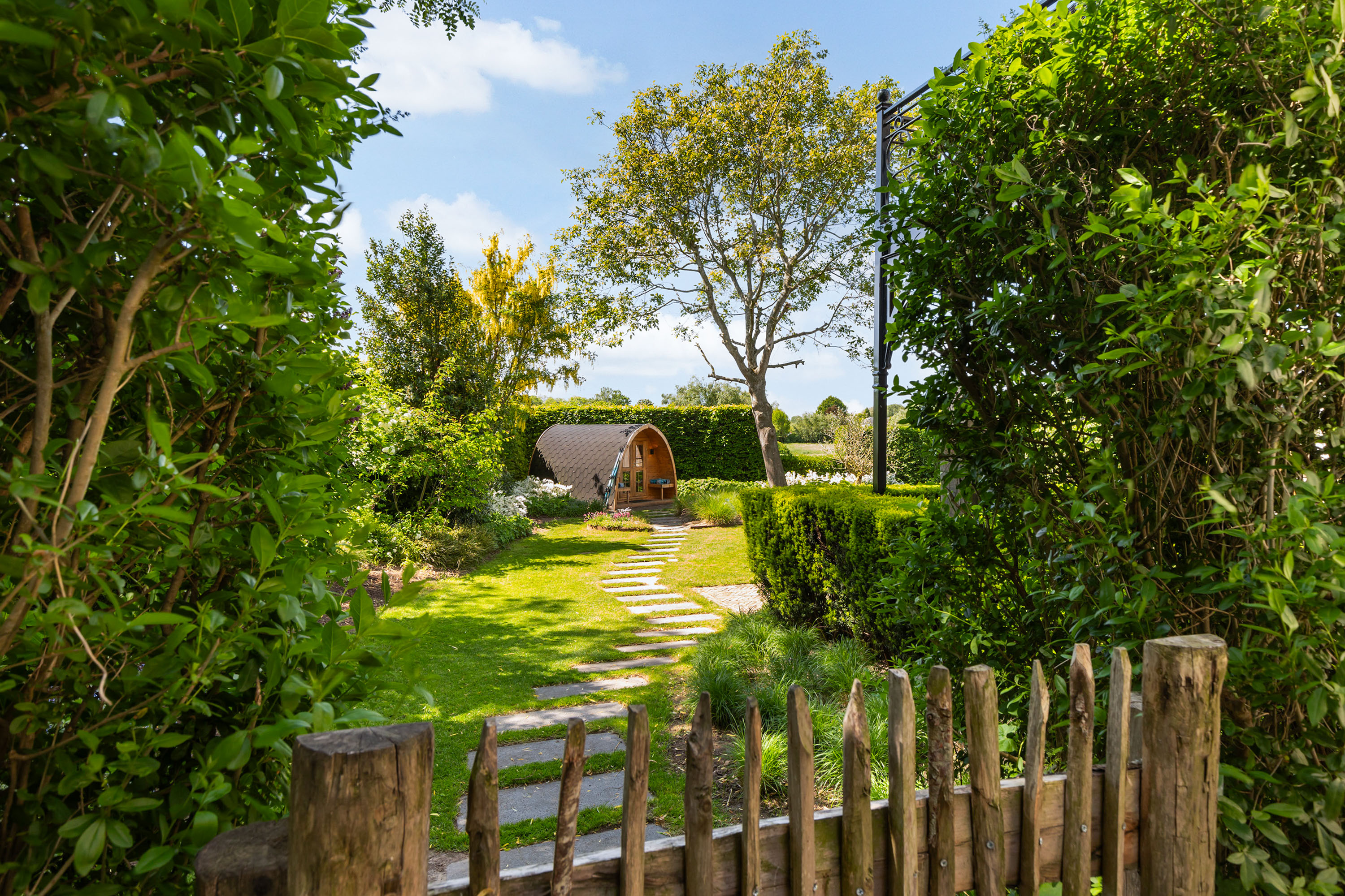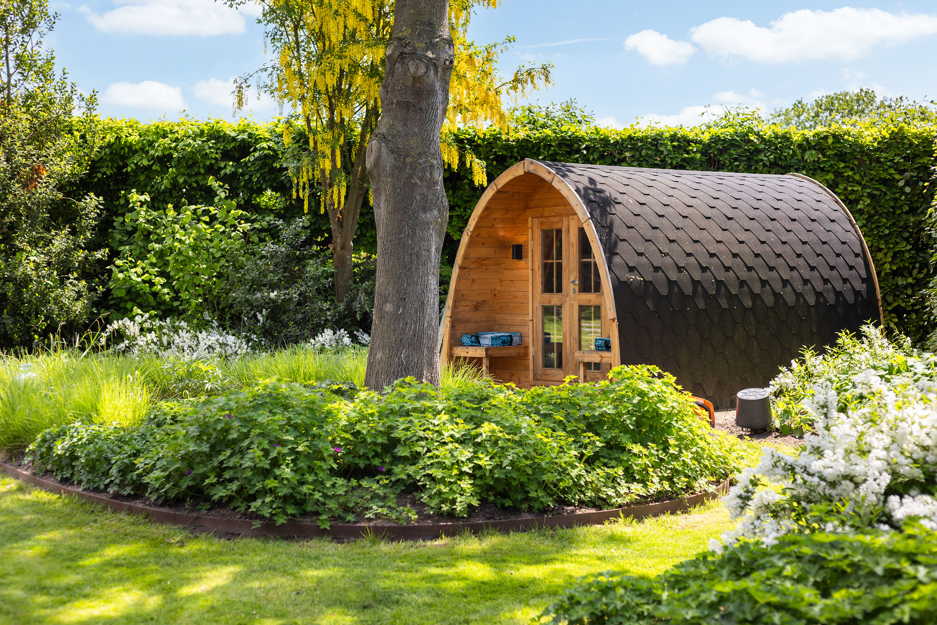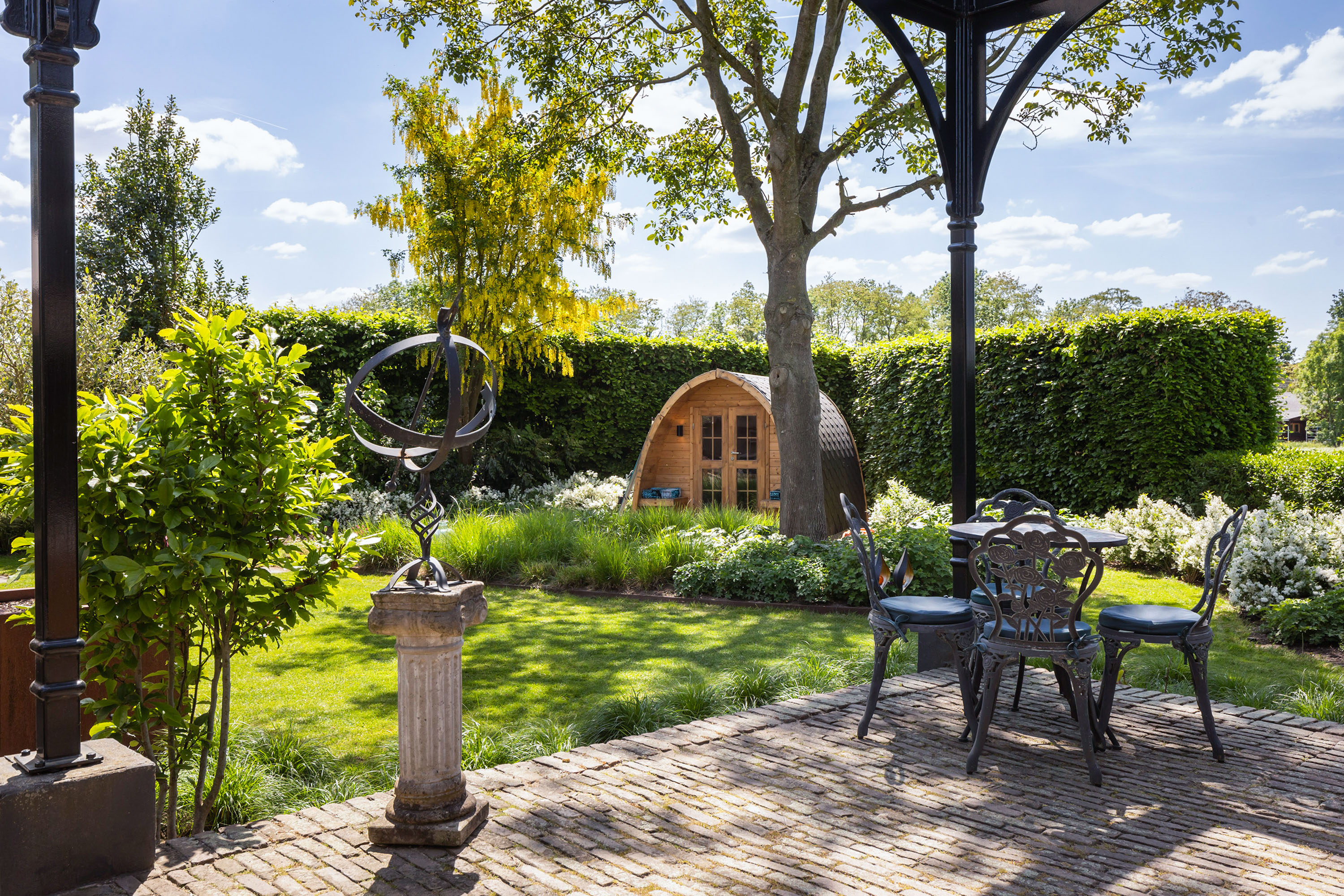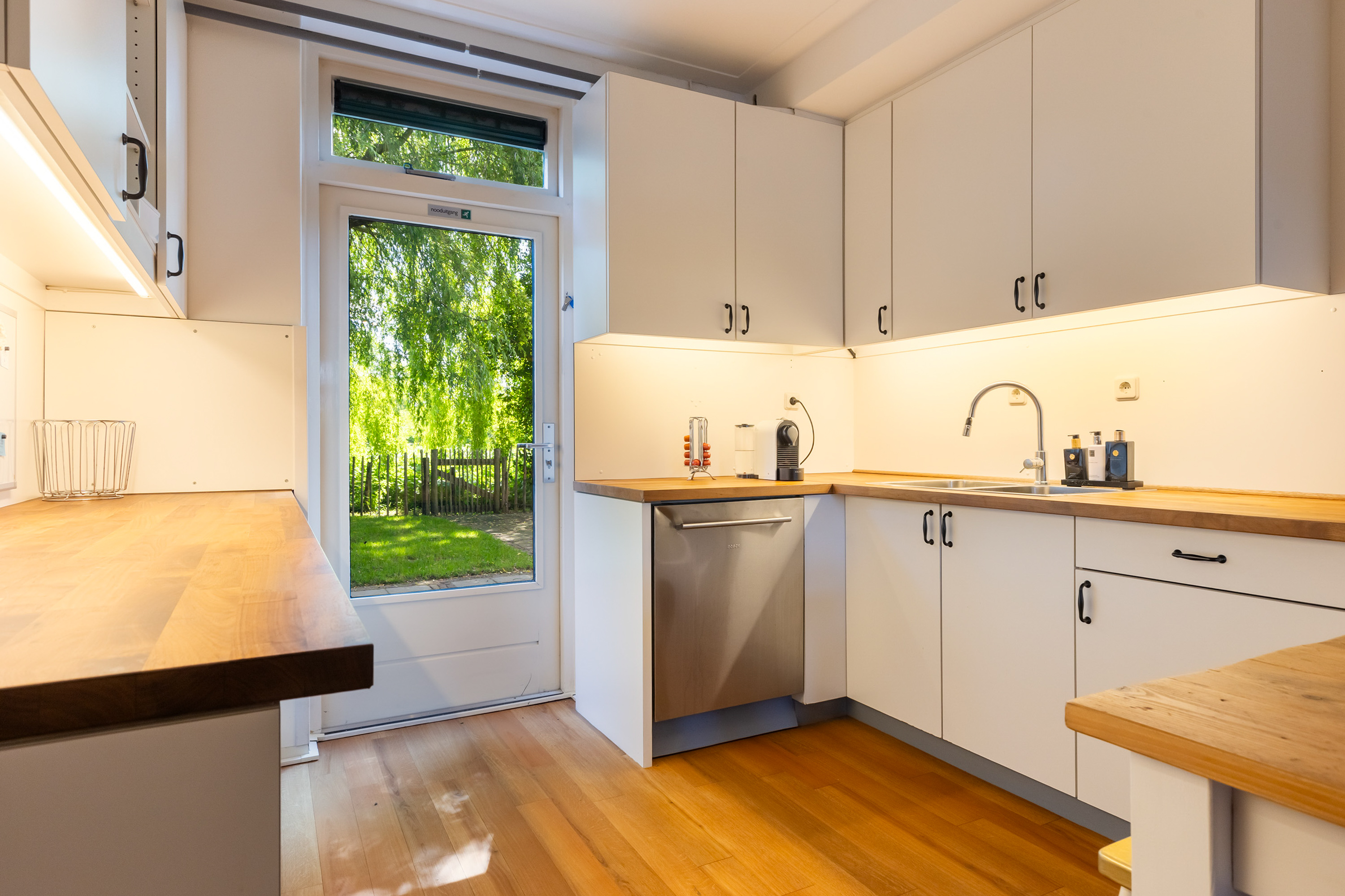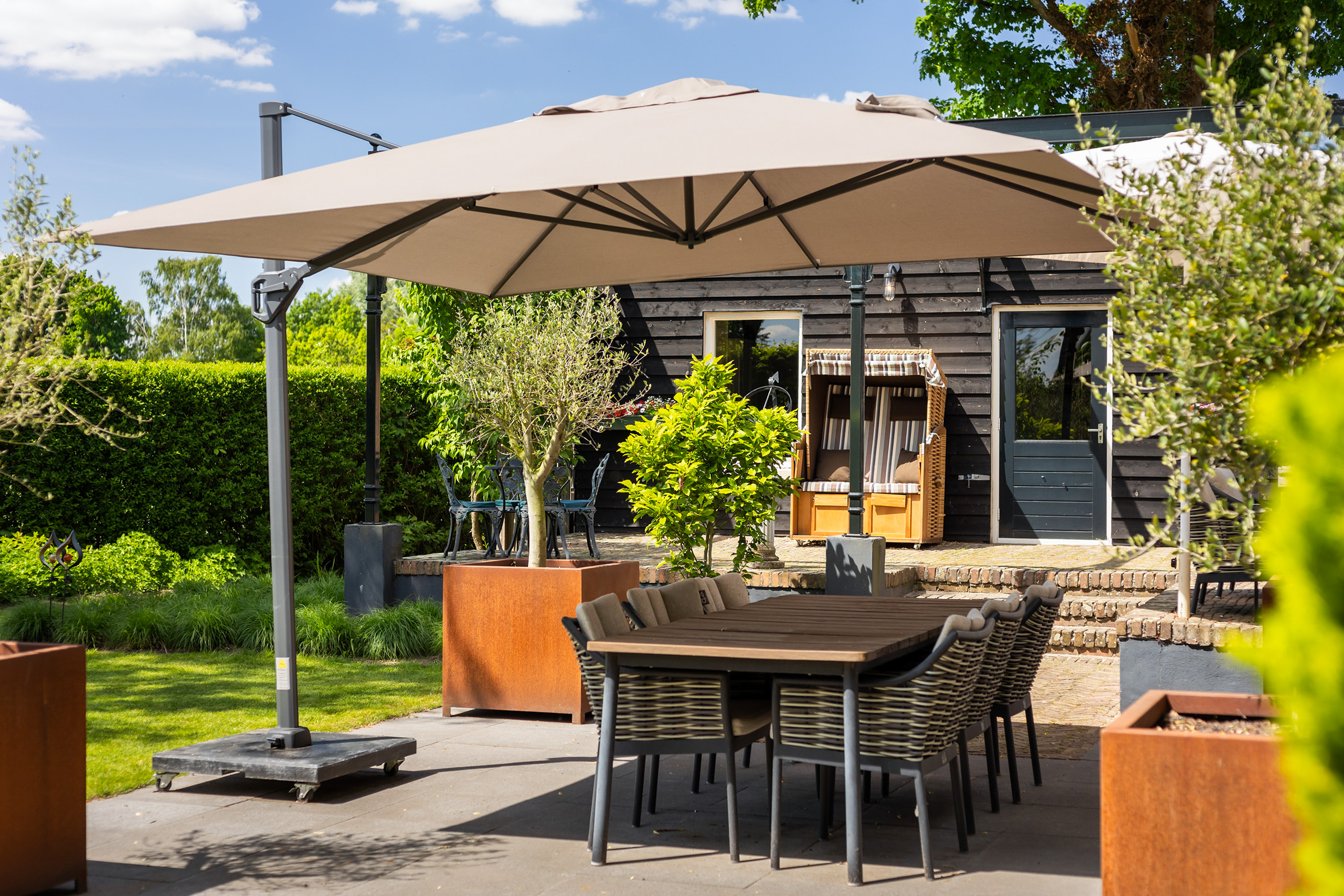 The outdoor space forms a natural extension of the home. The garden, redesigned in 2022, has been thoughtfully arranged with a focus on tranquillity and usability. Clean lines are combined with natural planting, and multiple terraces offer both sun and shade throughout the day. The veranda, featuring a timber beam ceiling and prepared for an outdoor kitchen and wellness facilities, enhances the enjoyment of outdoor living. To the side of the plot, a second garden area with lawn and a graceful weeping willow adds to the sense of greenery and privacy.