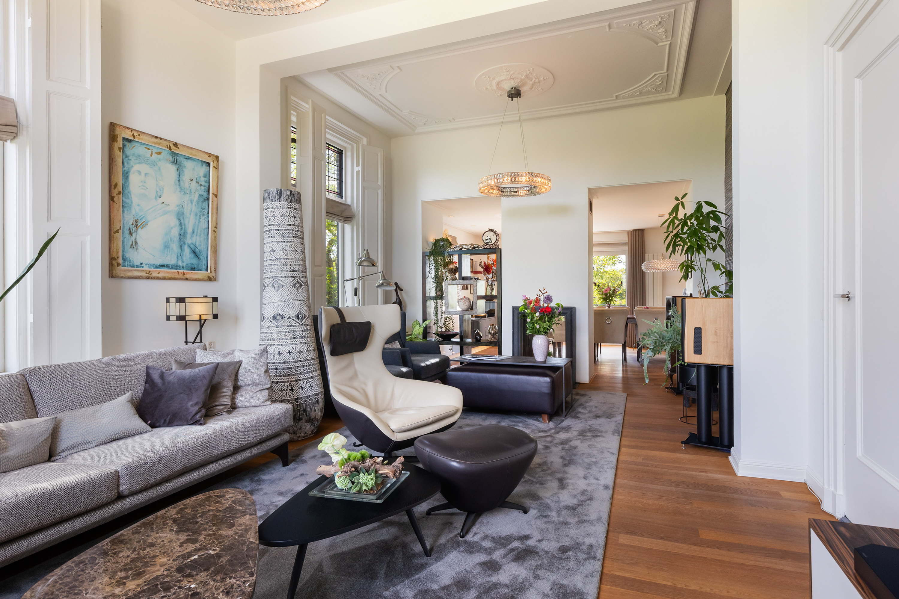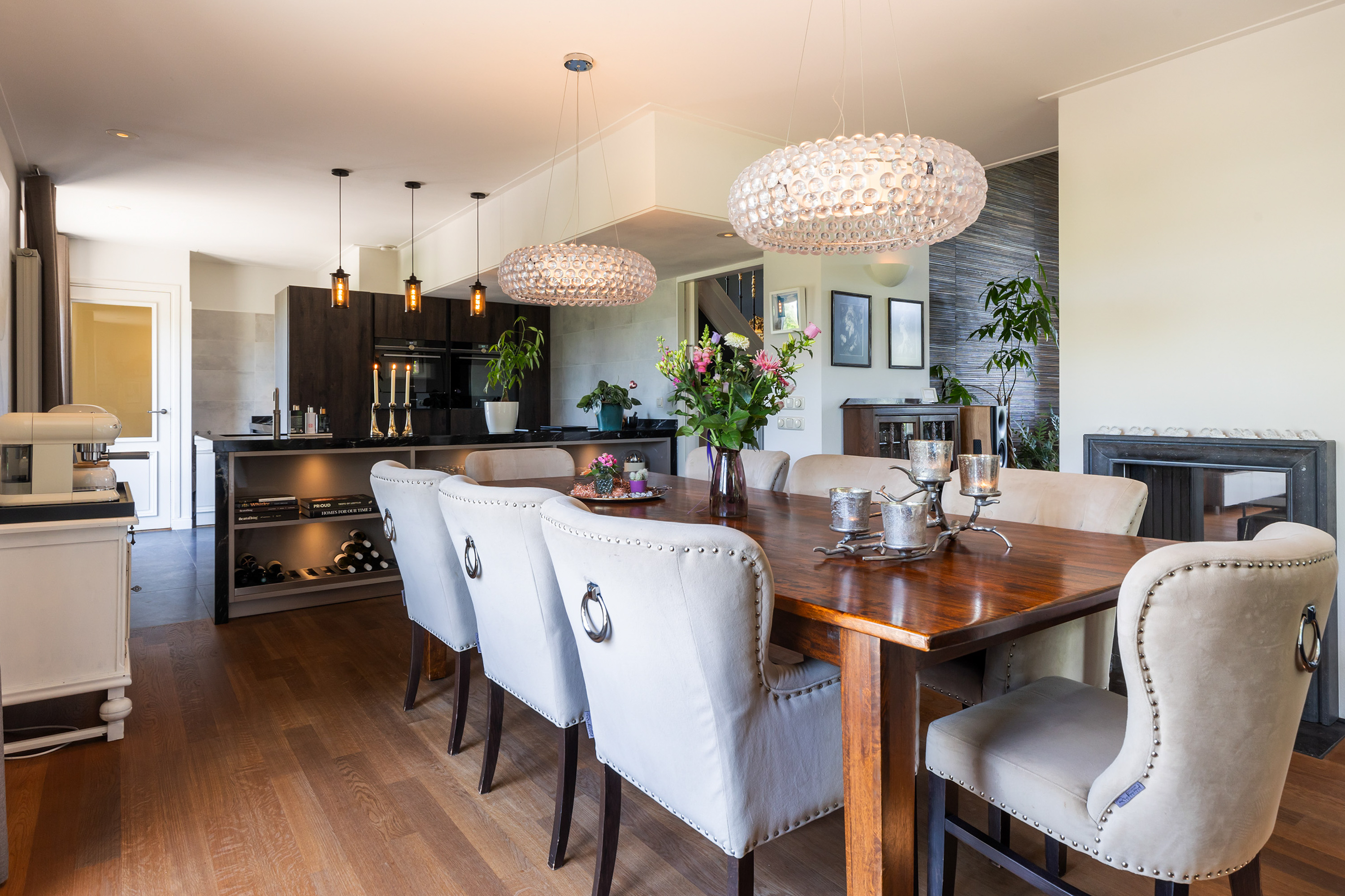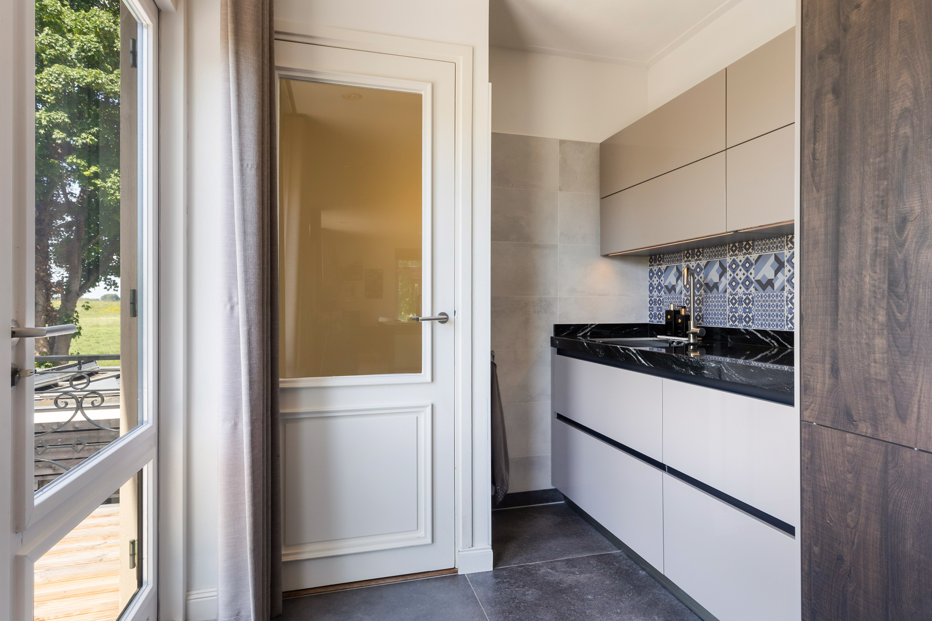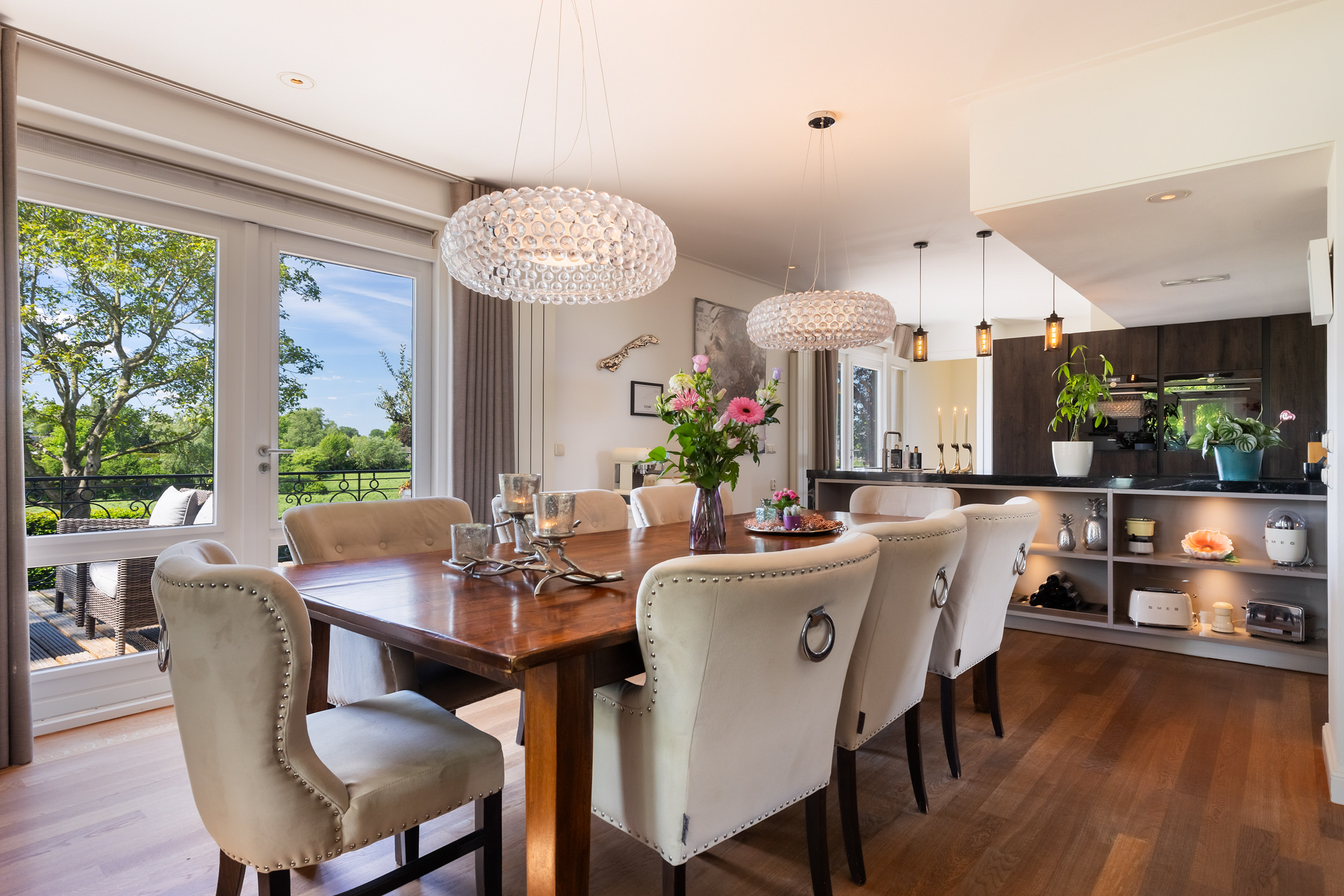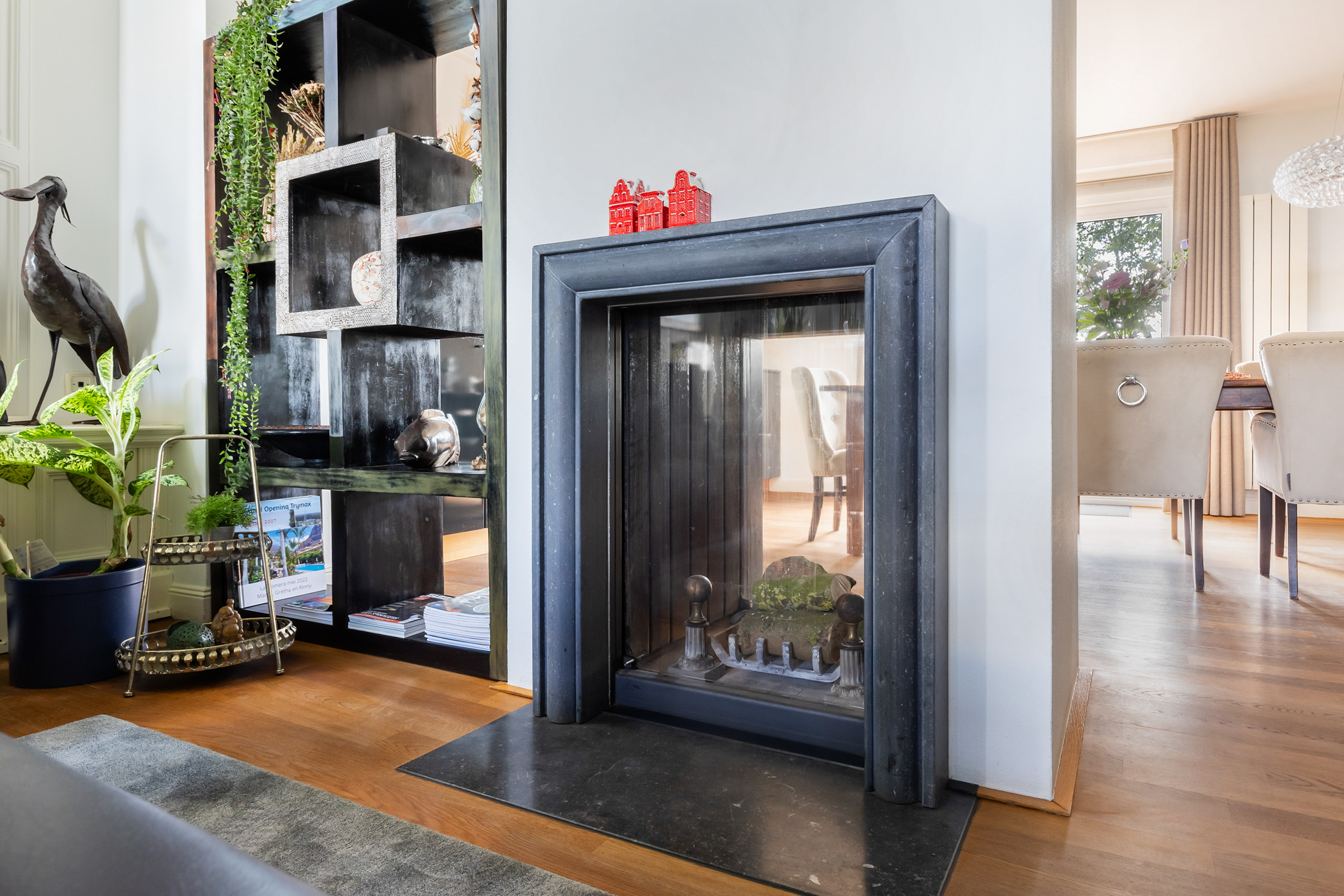 The villa distinguishes itself not only by its setting, but also by its versatility. Arranged over four full floors, the layout naturally accommodates a combination of living, working and hosting. At dike level lies the heart of the home: an elegant living floor where various living spaces flow seamlessly together. From the vestibule, one enters a generous study with fireplace and views across the river. The adjoining living room, dining area and open-plan kitchen form a cohesive and spacious environment, unified by a stylish double-sided fireplace. Large windows and French doors provide direct access to the balcony, where uninterrupted views over the water and surrounding countryside create an ever-changing and captivating backdrop.