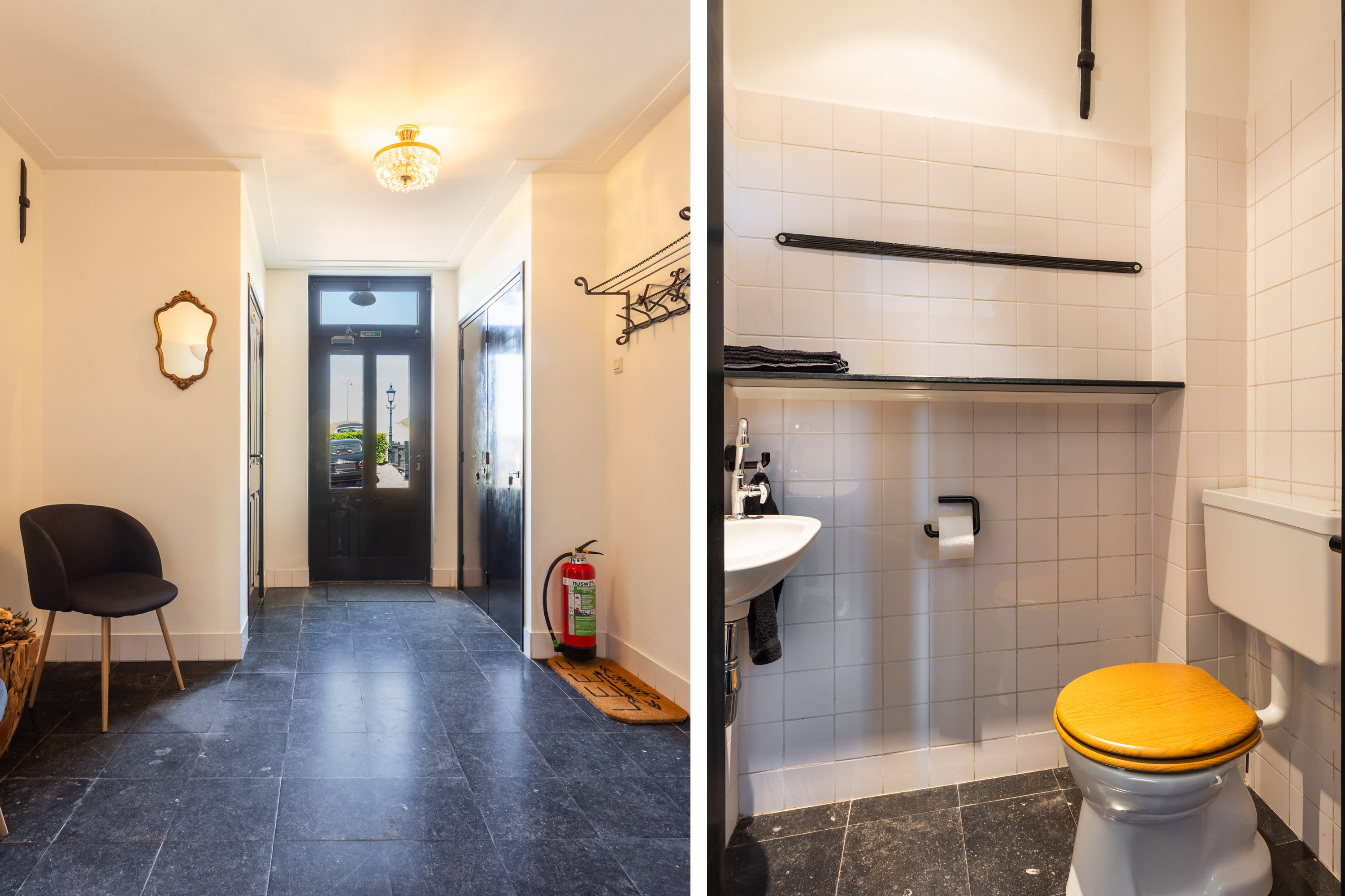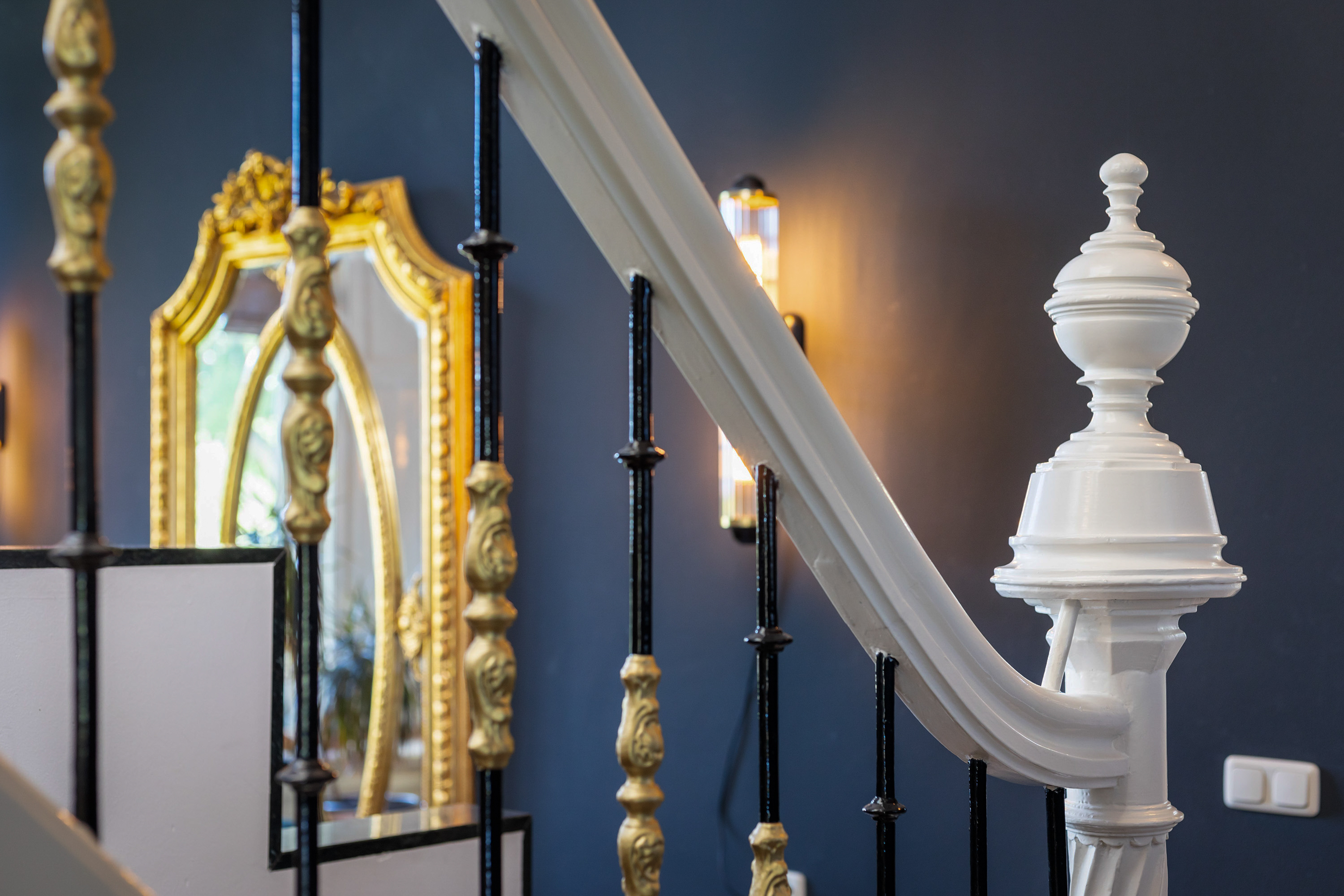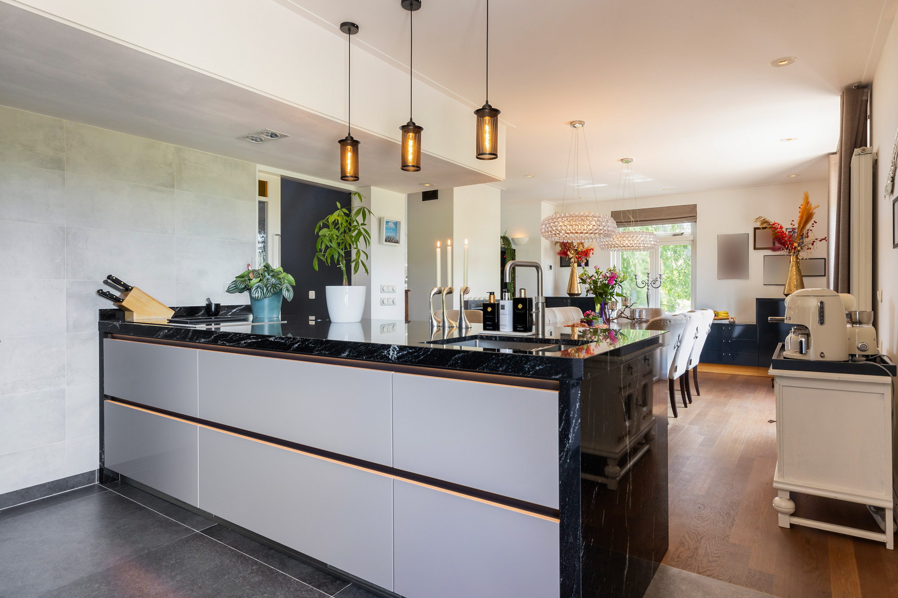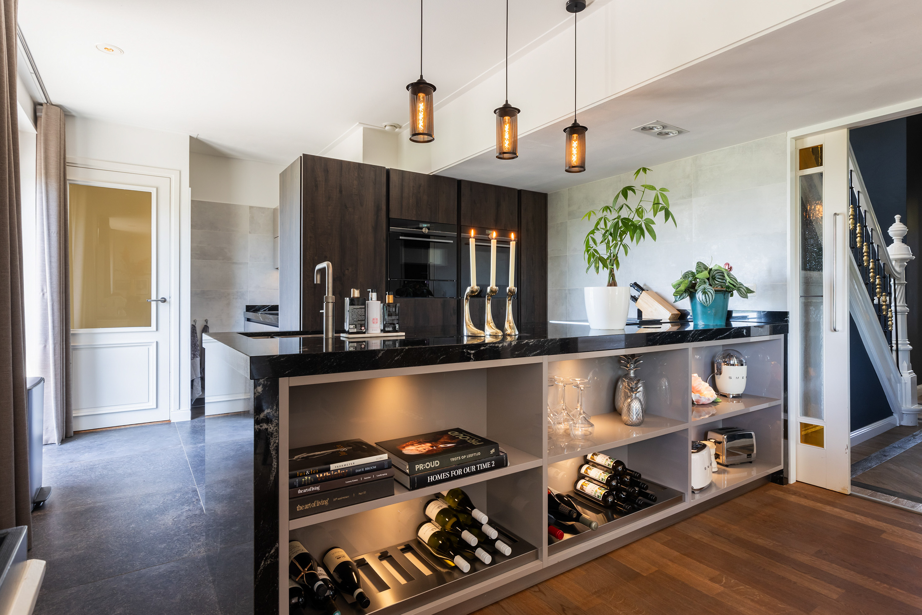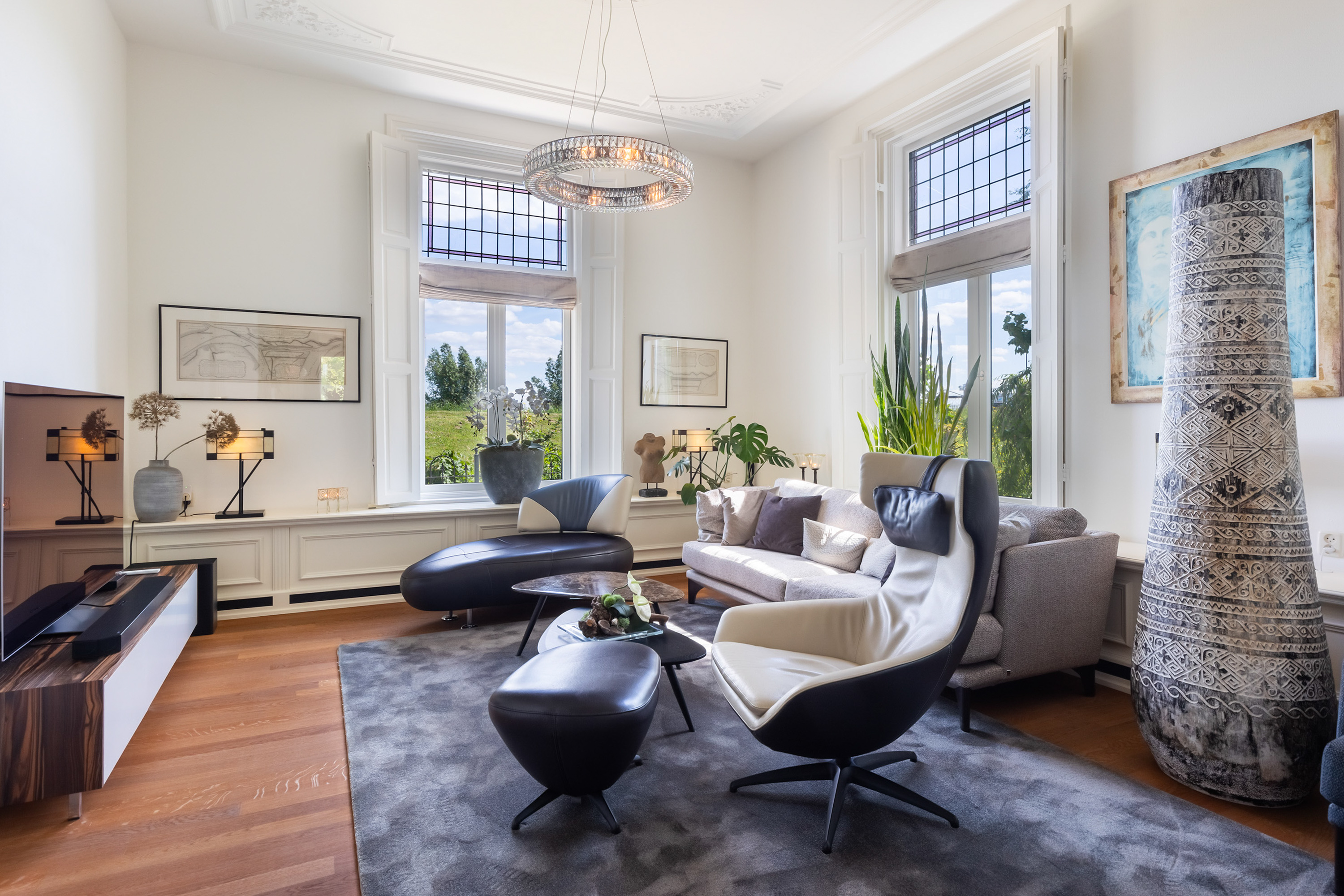 The villa distinguishes itself not only by its setting, but also by its versatility. Arranged over four full floors, the layout naturally accommodates a combination of living, working and hosting. At dike level lies the heart of the home: an elegant living floor where various living spaces flow seamlessly together. From the vestibule, one enters a generous study with fireplace and views across the river. The adjoining living room, dining area and open-plan kitchen form a cohesive and spacious environment, unified by a stylish double-sided fireplace. Large windows and French doors provide direct access to the balcony, where uninterrupted views over the water and surrounding countryside create an ever-changing and captivating backdrop.