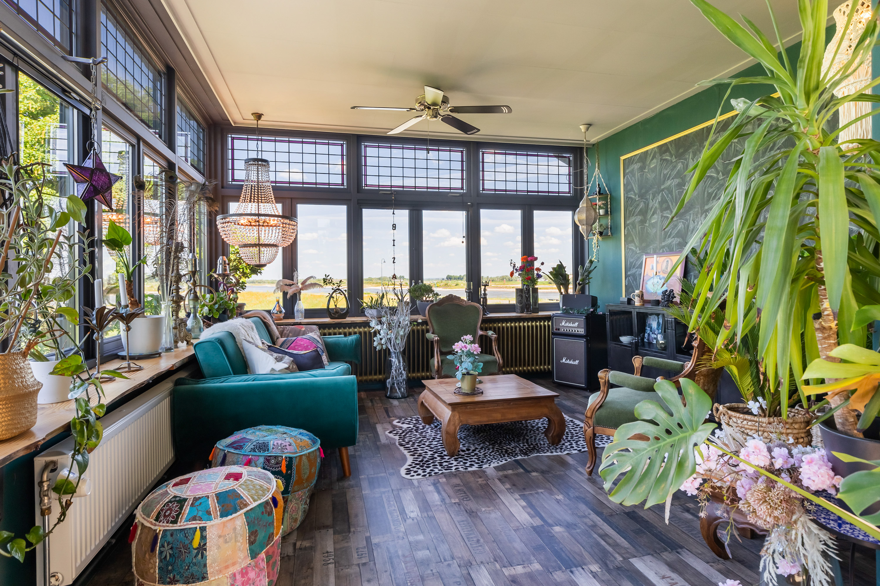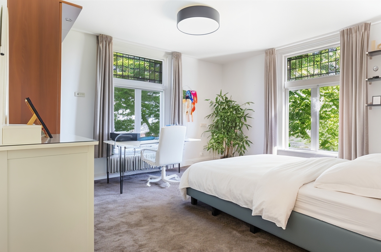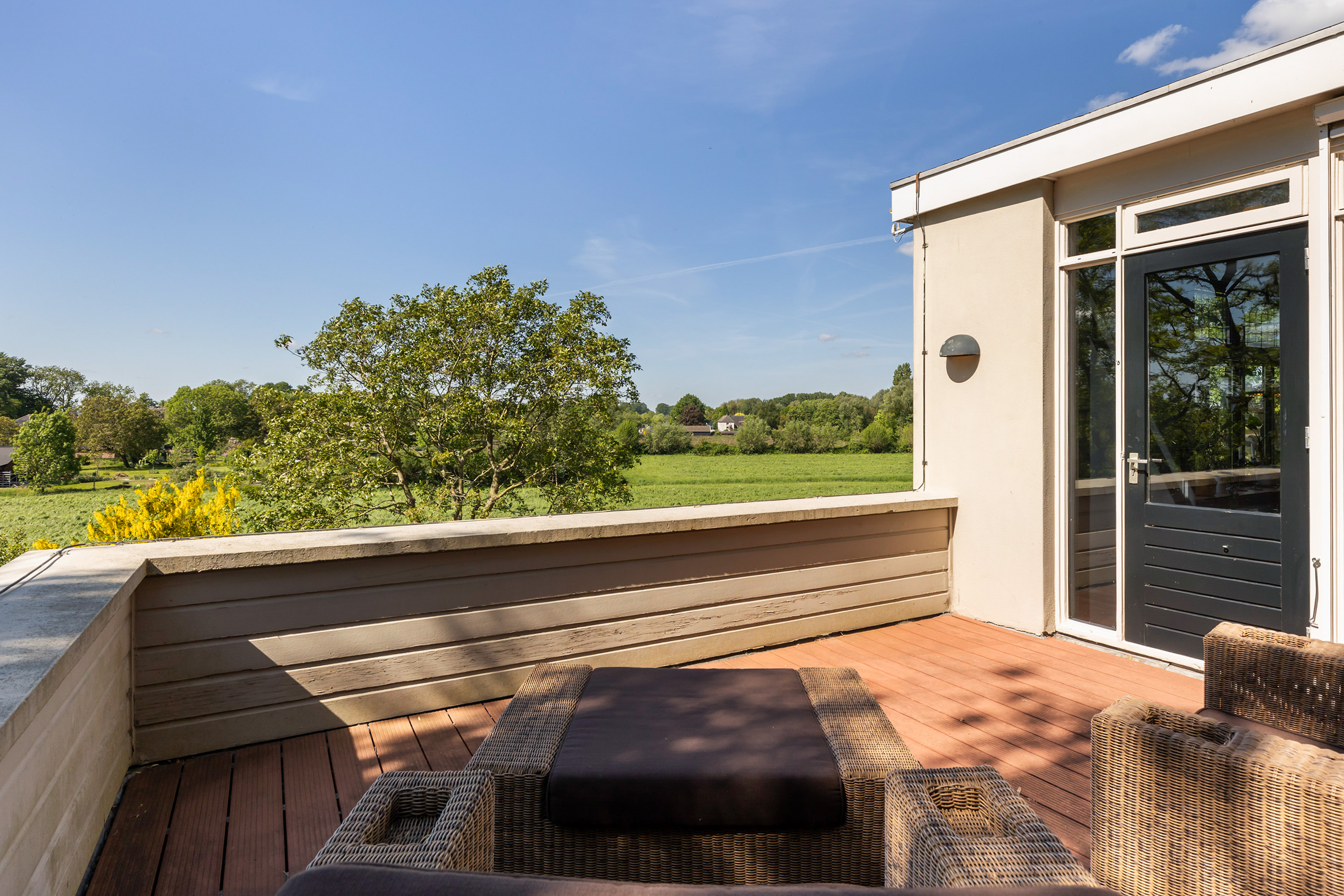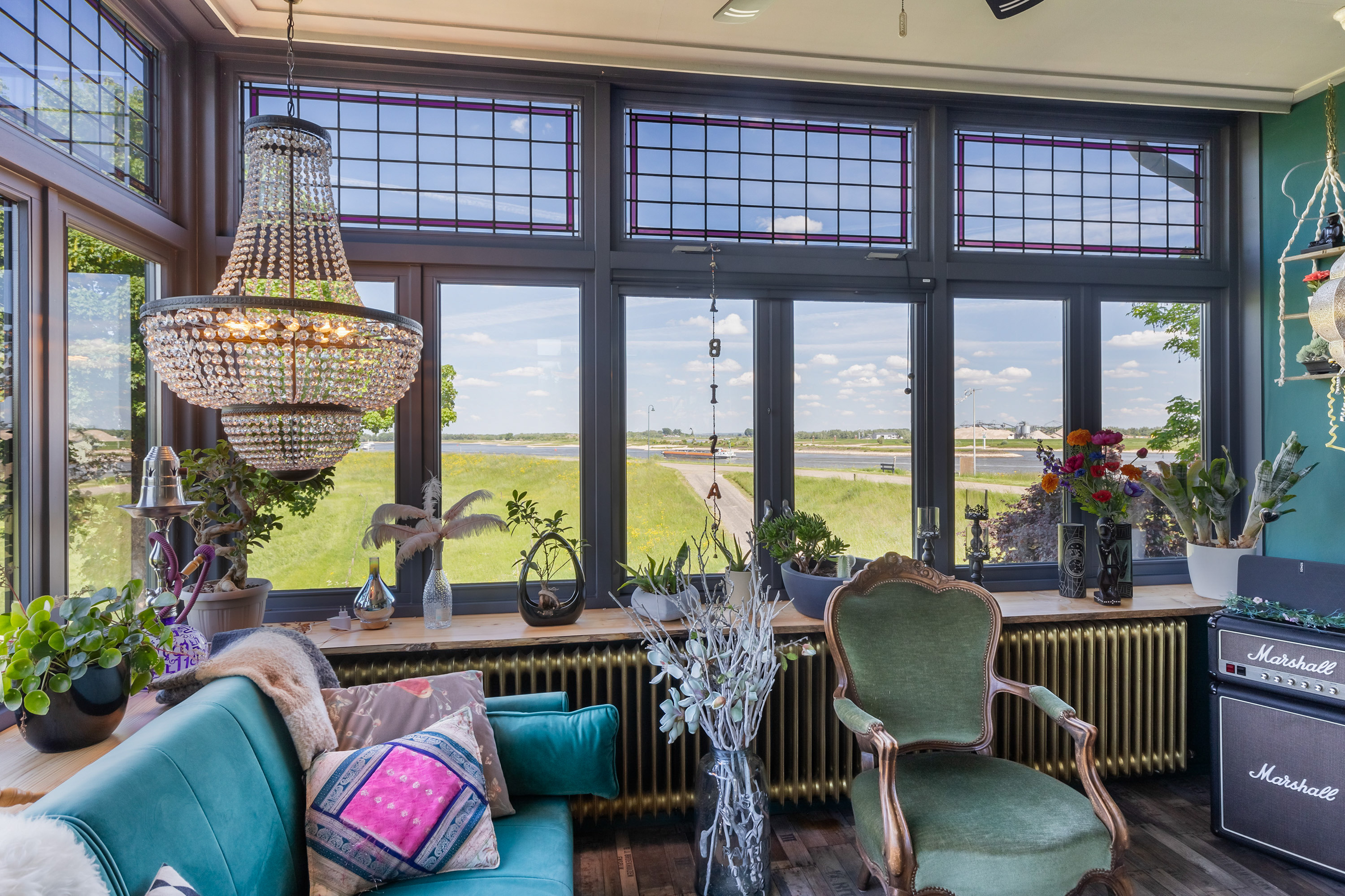 One floor above, a remarkable feature reveals itself: the fully restored conservatory. Surrounded by glass, this space offers breathtaking views of the river landscape and serves perfectly as a lounge or retreat. An intimate roof terrace adjoins this area. This level also accommodates three comfortable bedrooms, a walk-in dressing room and a spacious bathroom equipped with a bath, separate shower, double washbasin and WC.