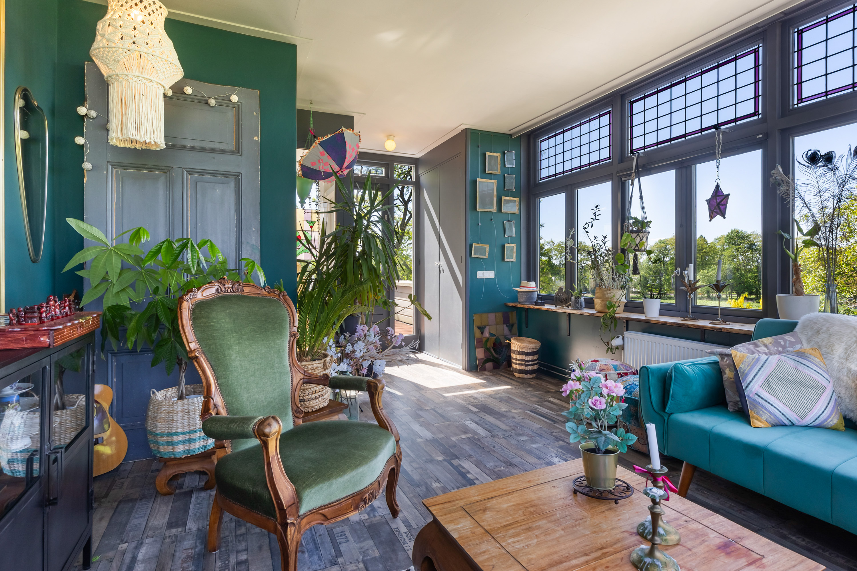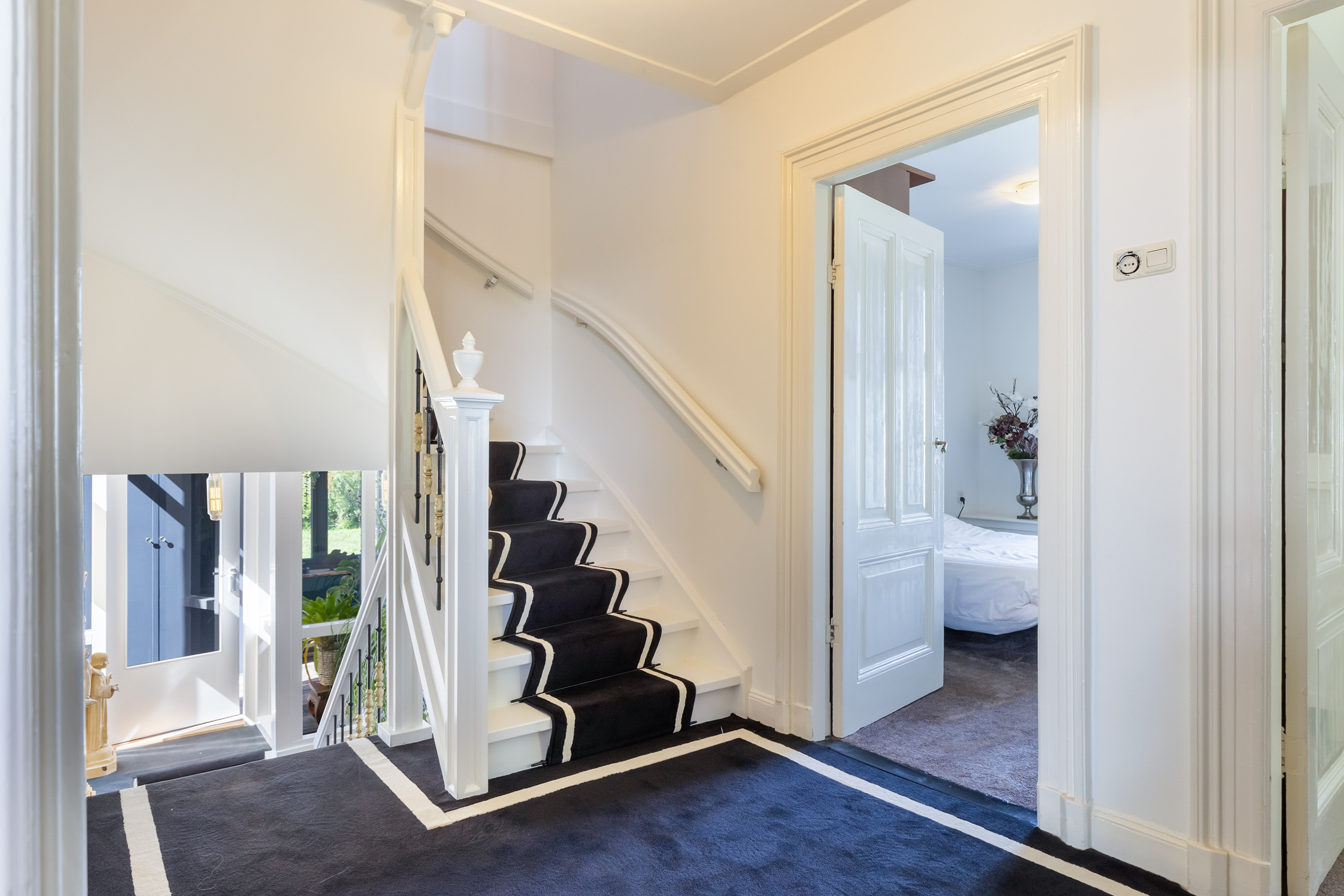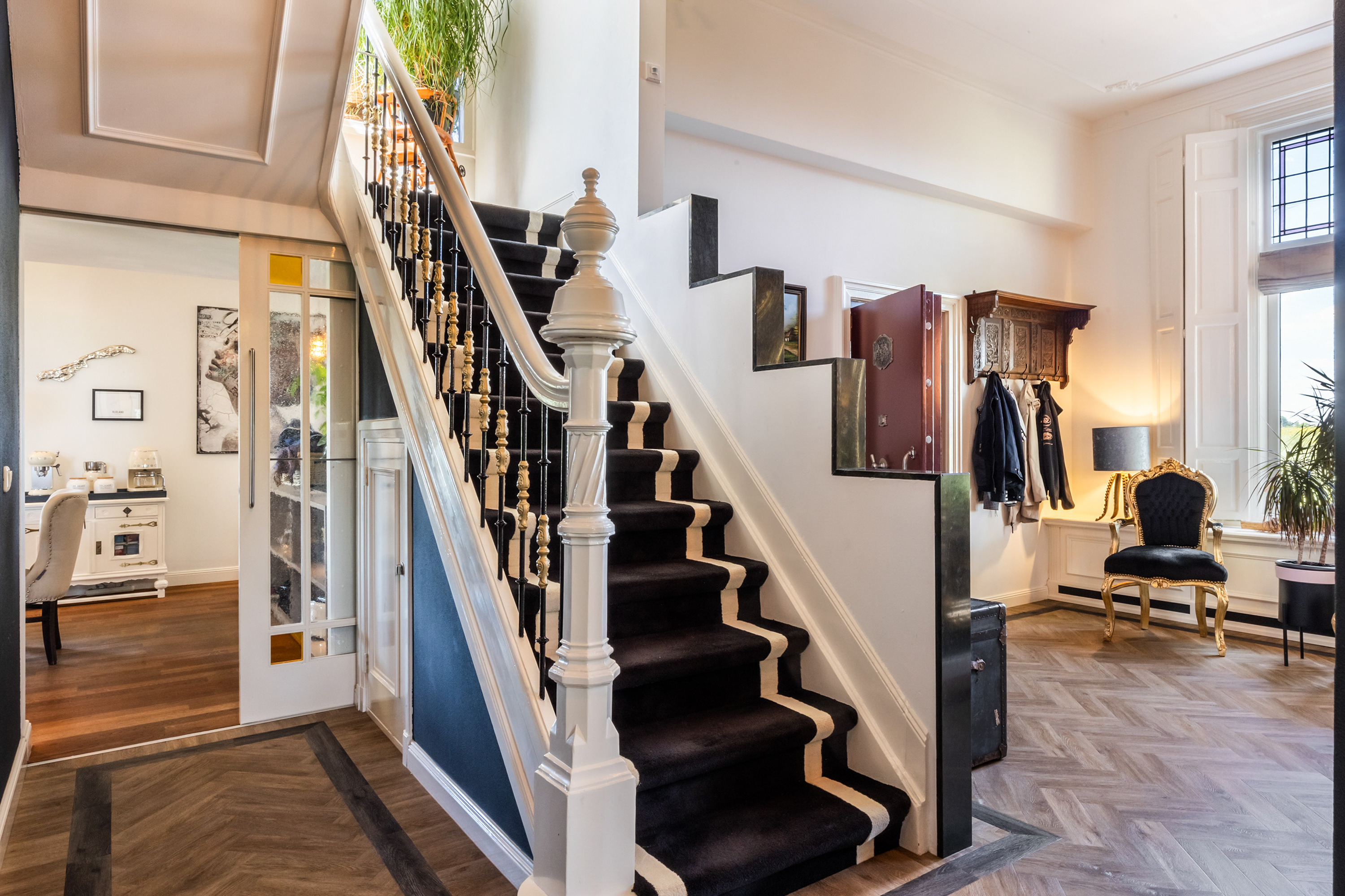 One floor above, a remarkable feature reveals itself: the fully restored conservatory. Surrounded by glass, this space offers breathtaking views of the river landscape and serves perfectly as a lounge or retreat. An intimate roof terrace adjoins this area. This level also accommodates three comfortable bedrooms, a walk-in dressing room and a spacious bathroom equipped with a bath, separate shower, double washbasin and WC.
