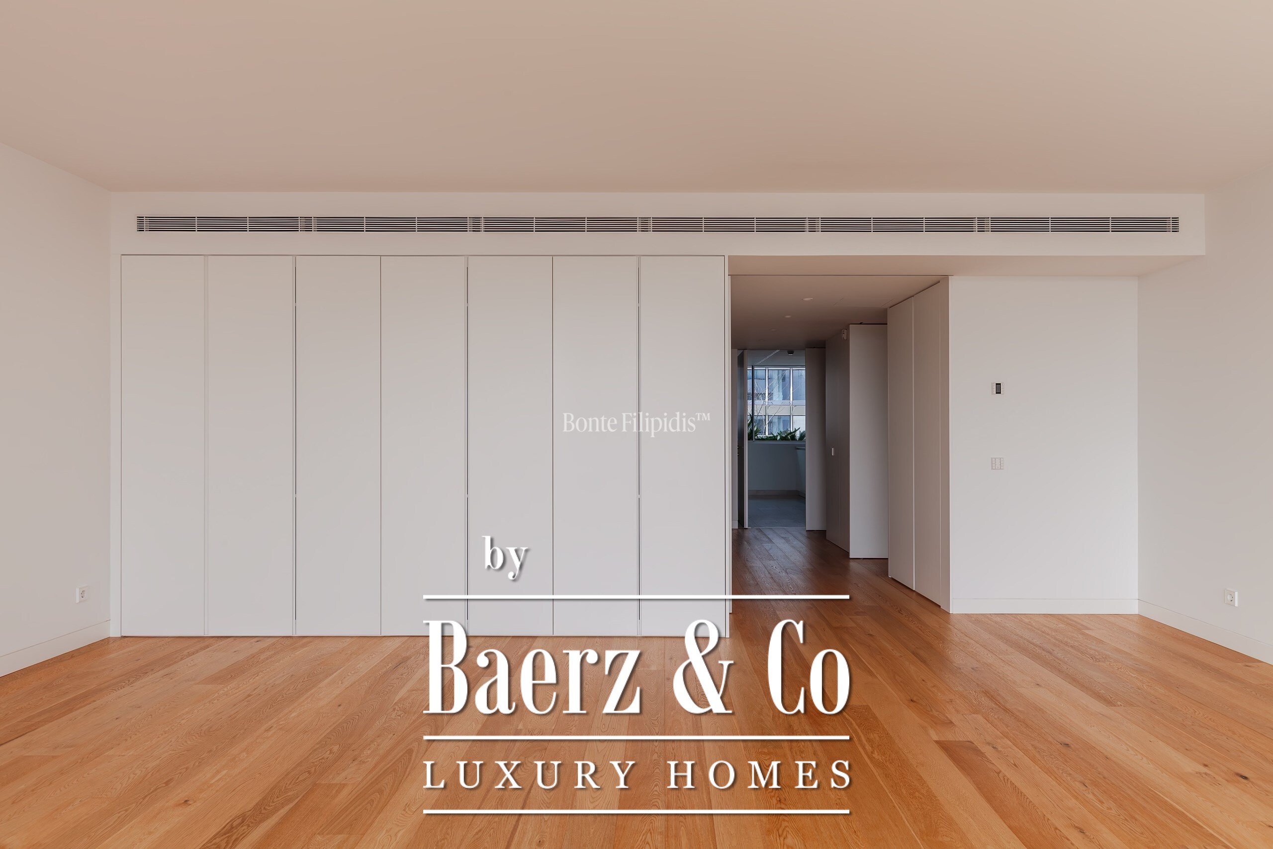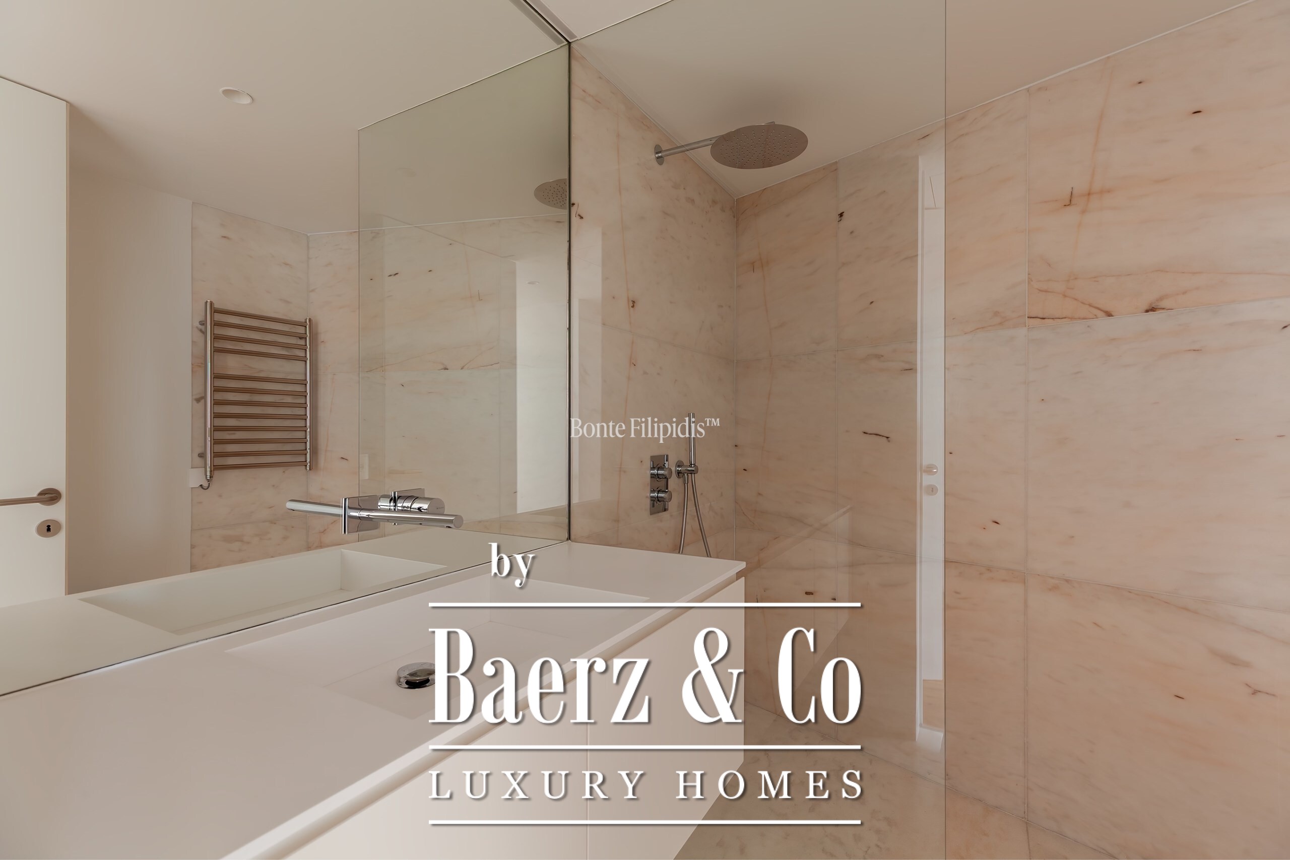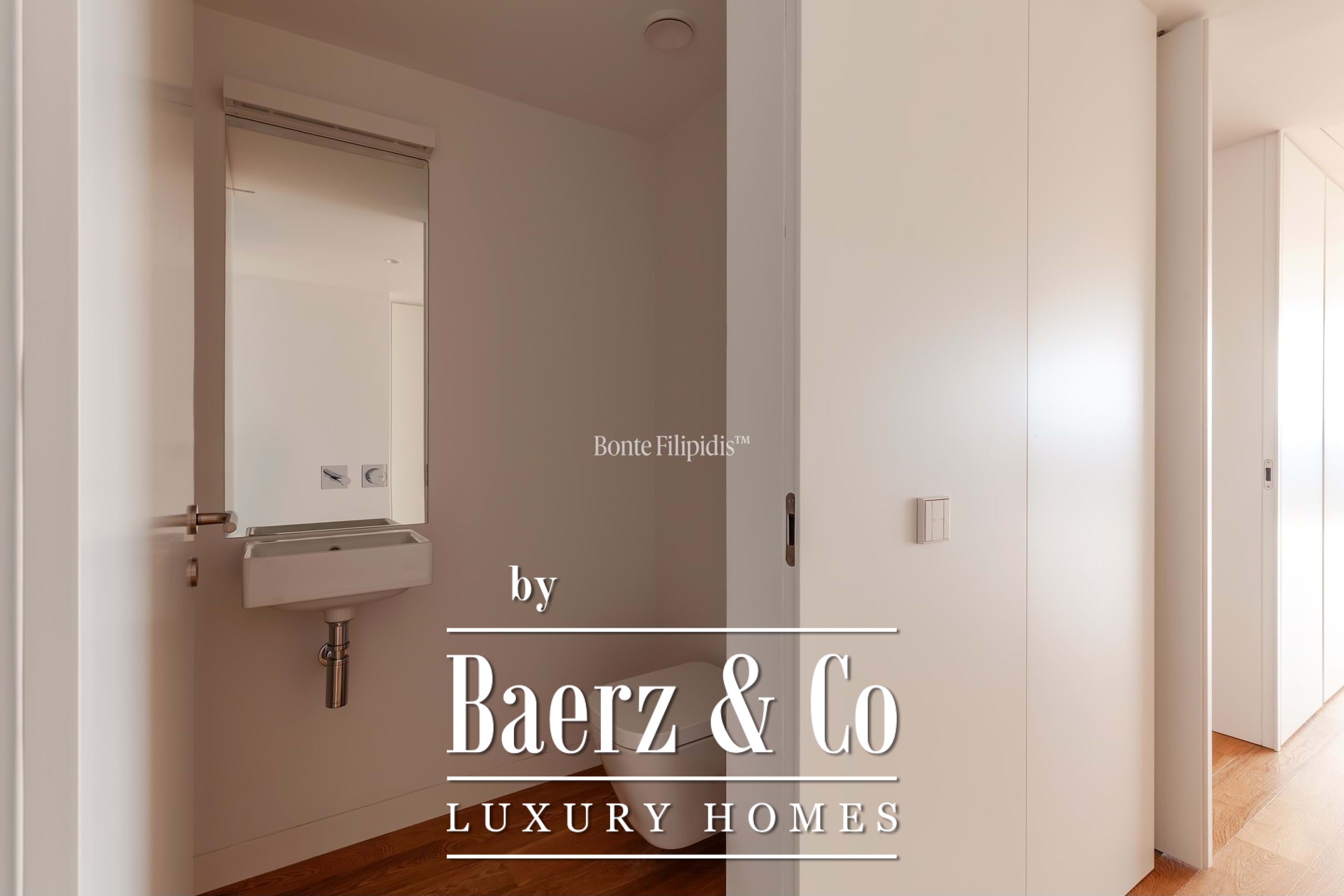 The principal suite is finished with fitted wardrobes and an en suite bath in natural stone. Two additional bedrooms offer generous proportions, wide windows and integrated storage, complemented by a total of three bathrooms. Solid wood flooring, refined cabinetry, and a fully equipped kitchen with high-quality appliances underline a focus on modern comfort.