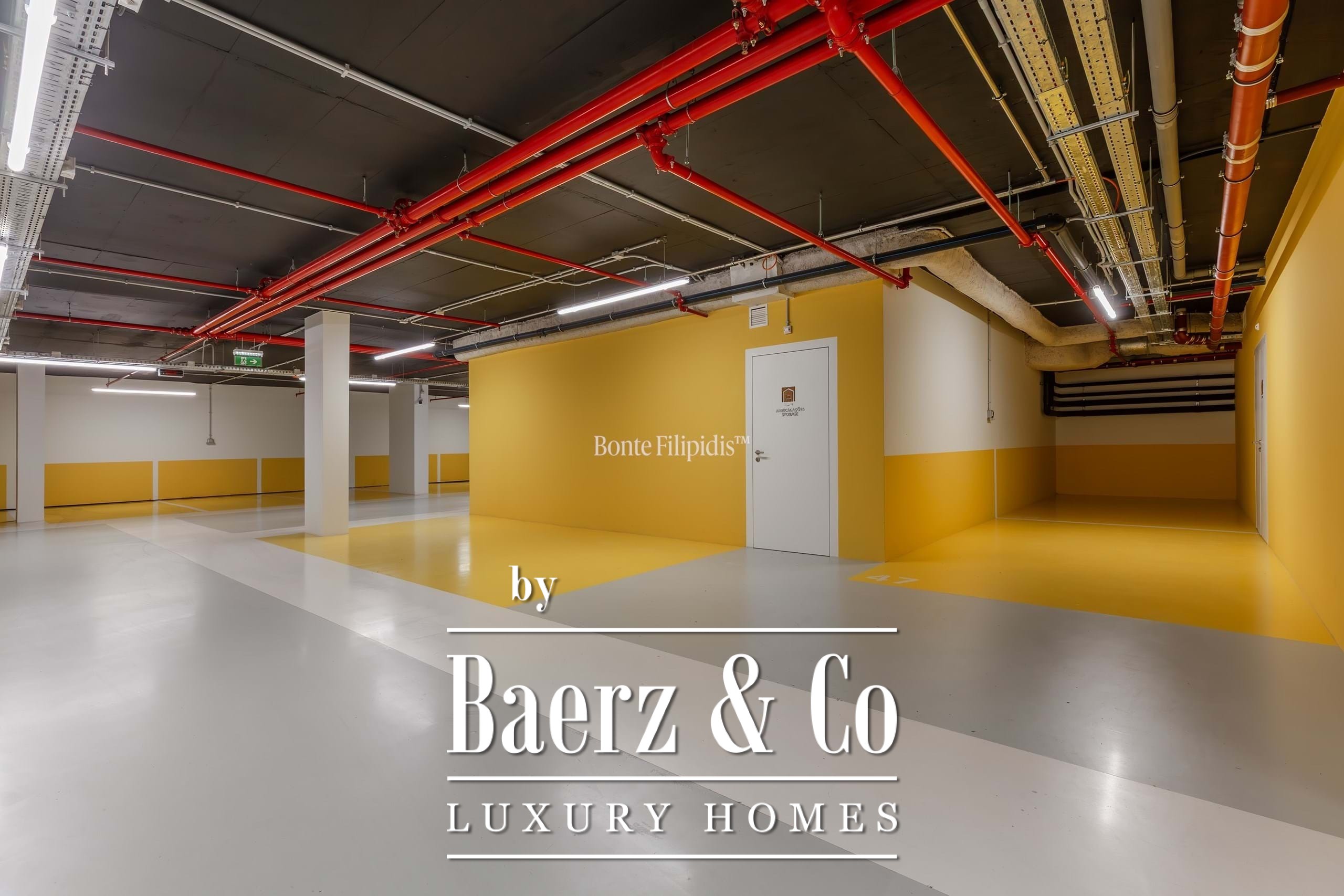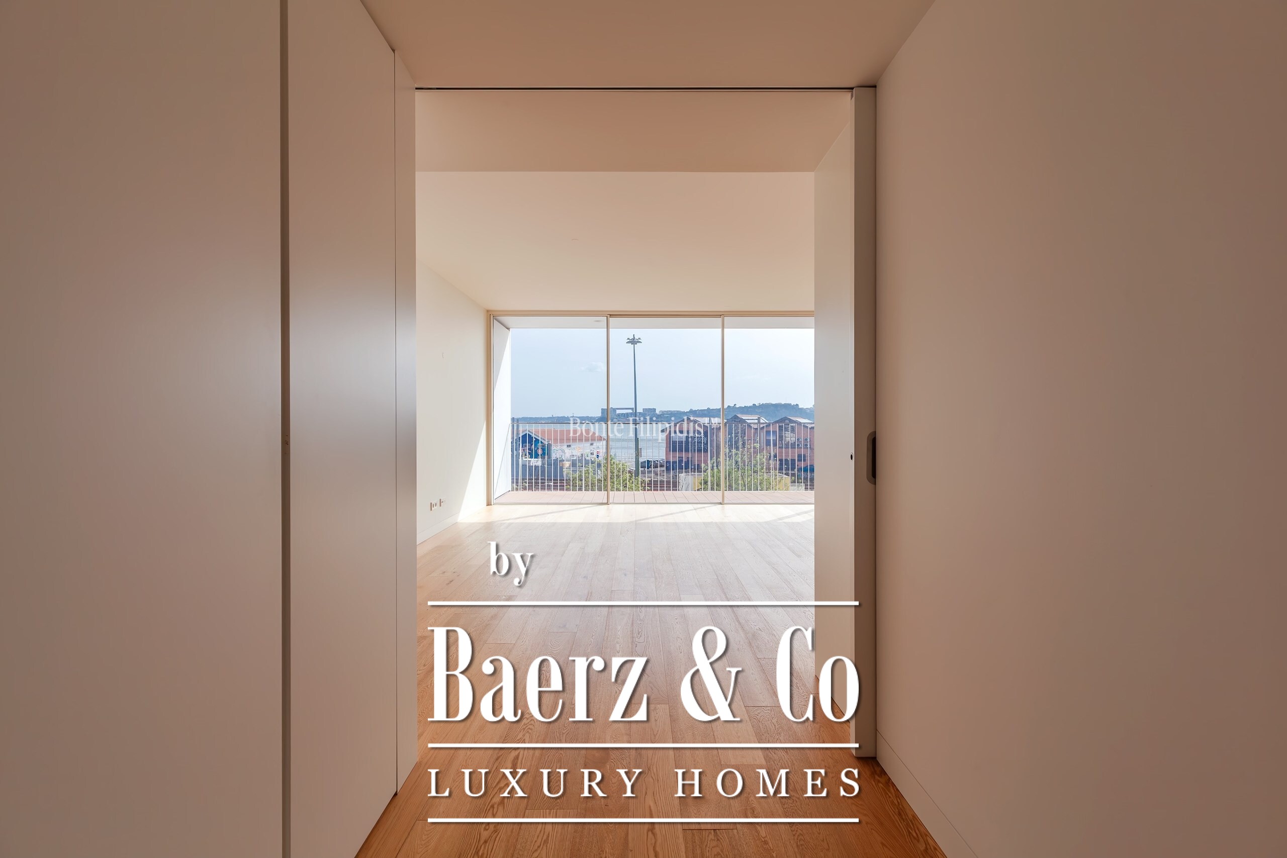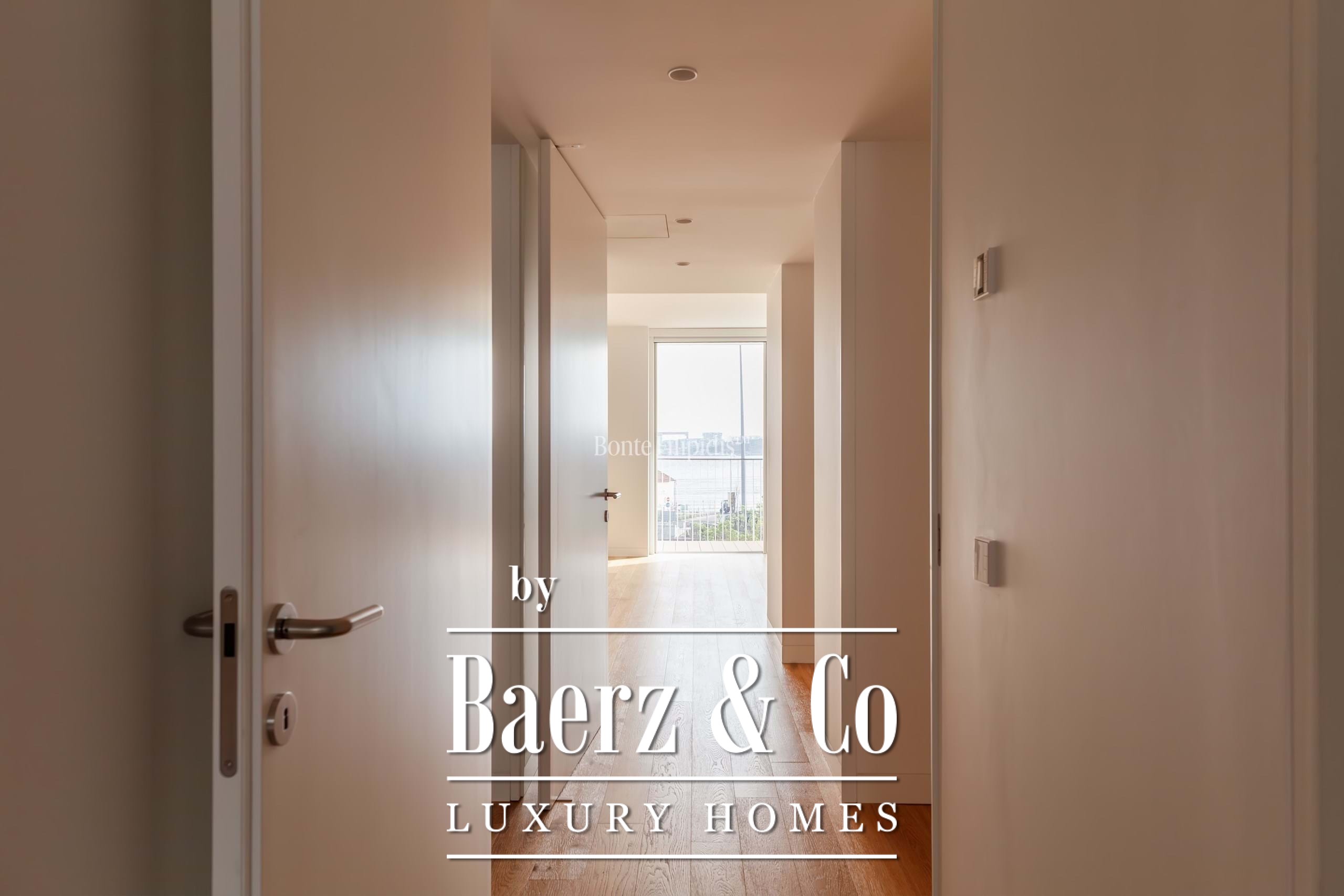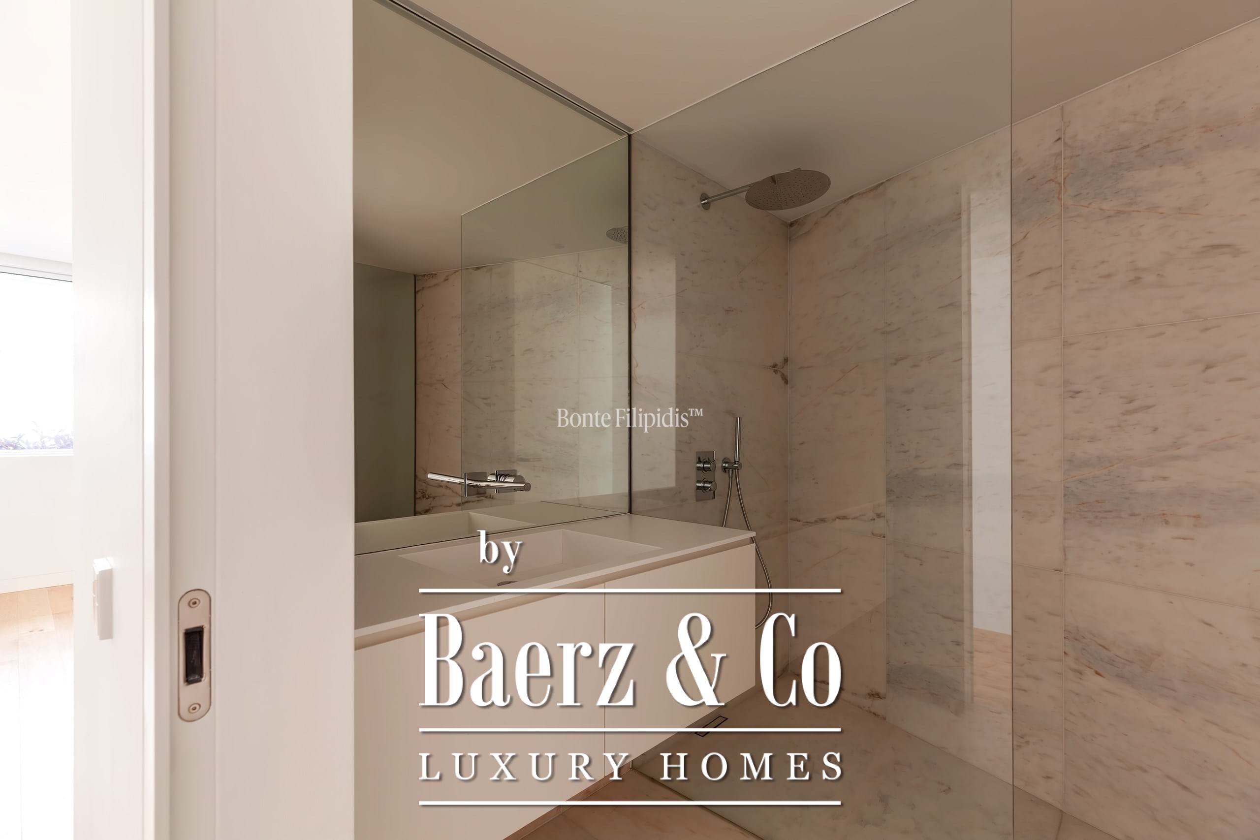 The principal suite is finished with fitted wardrobes and an en suite bath in natural stone. Two additional bedrooms offer generous proportions, wide windows and integrated storage, complemented by a total of three bathrooms. Solid wood flooring, refined cabinetry, and a fully equipped kitchen with high-quality appliances underline a focus on modern comfort.