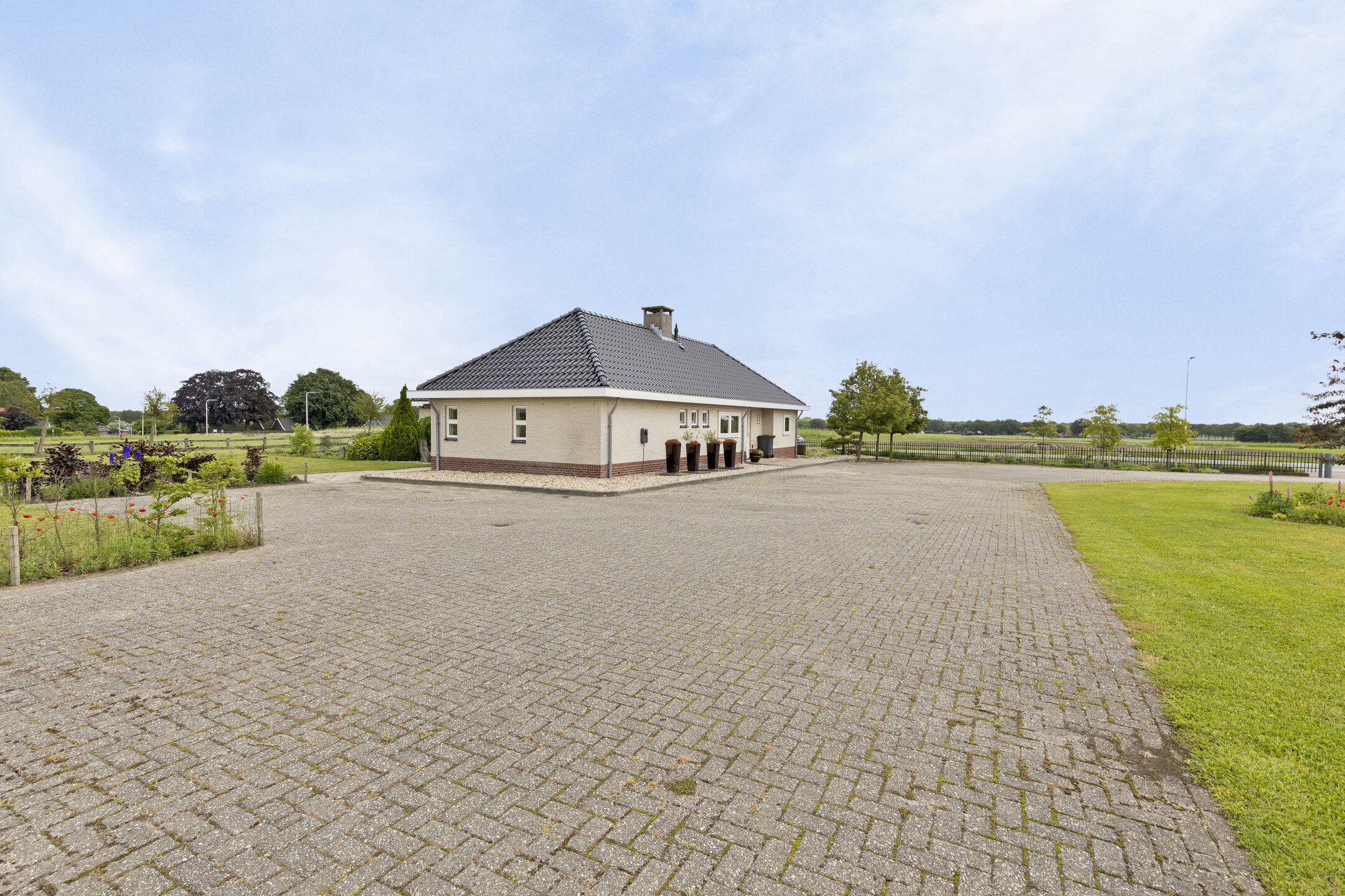 ... for there lies an impressive 1.2ha waiting for you. At the front, the plot is accessed by an electric gate, allowing you to drive straight into the garage. Surface parking is also possible, because the driveway has room for at least eight cars. There is also a charging station, so you always drive away with a full battery.