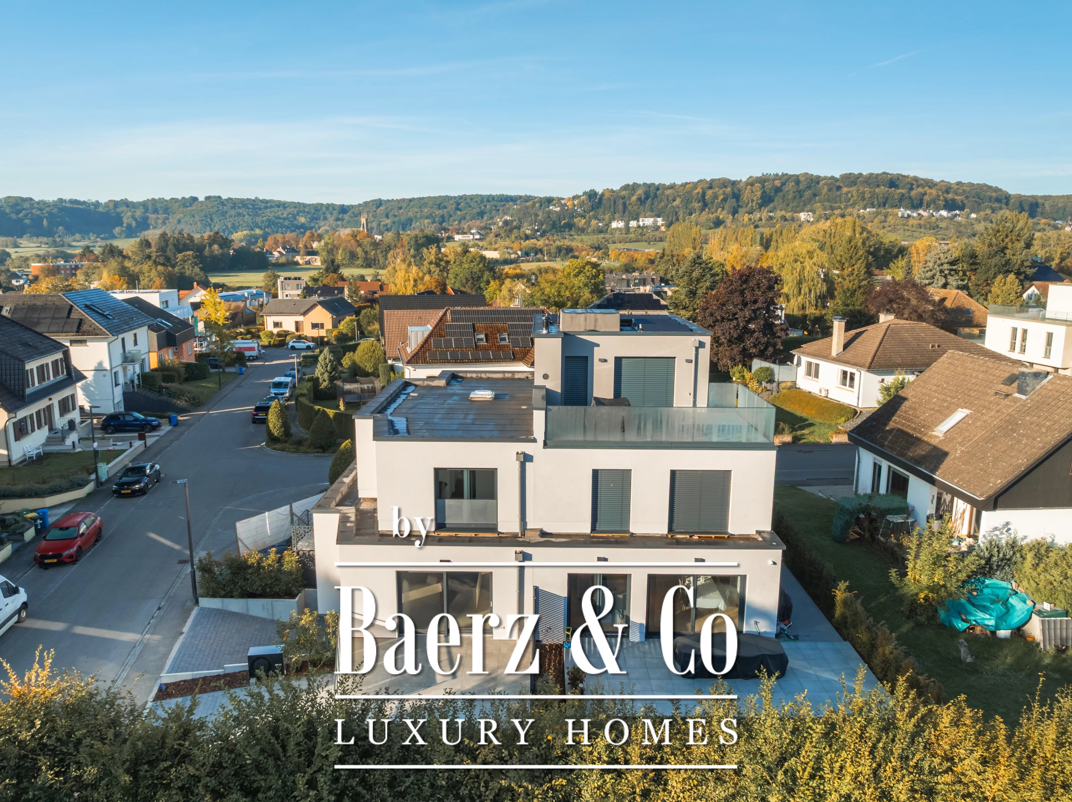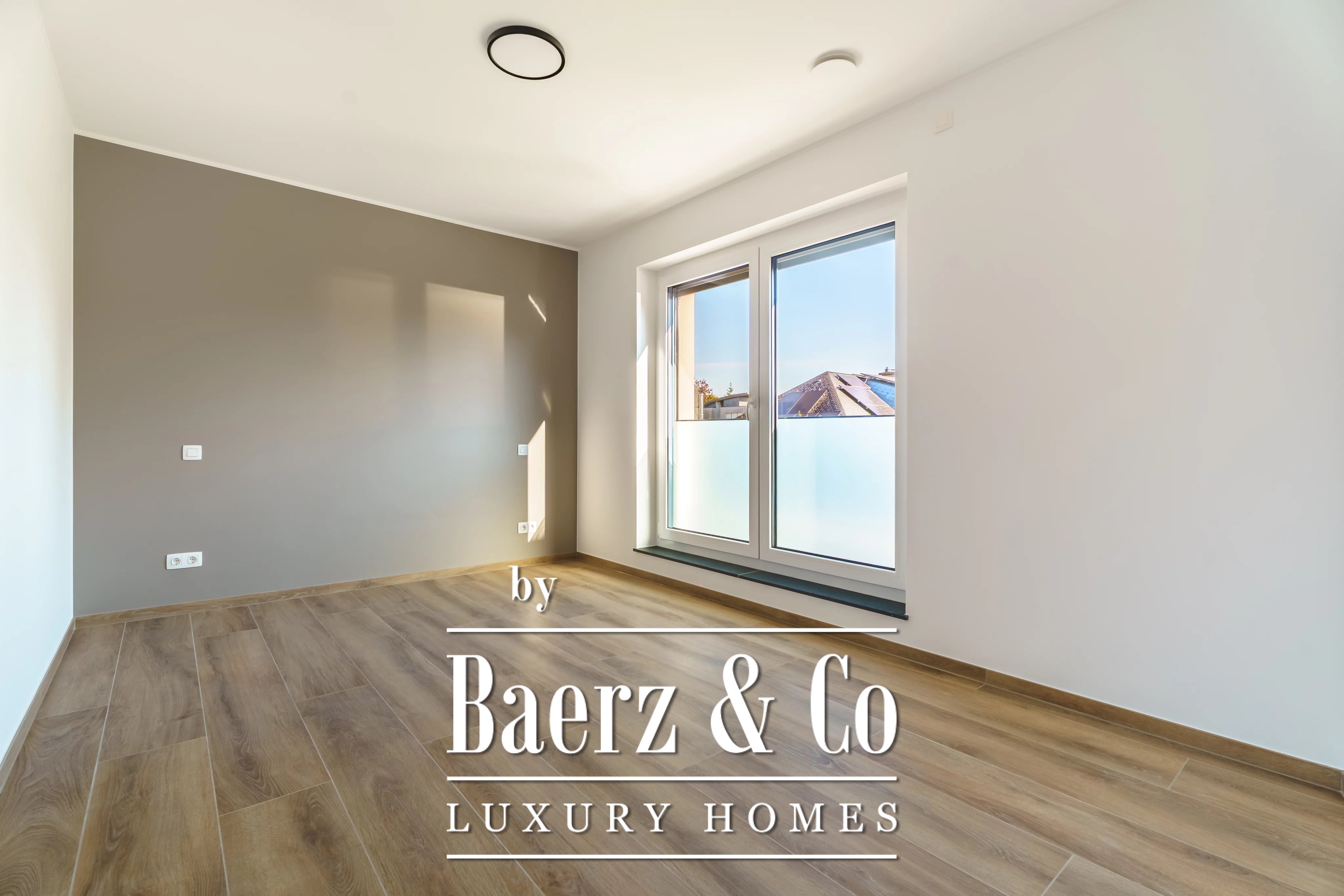 Triple glazing, sliding windows, electric awnings, and an advanced alarm system underscore a commitment to comfort and security throughout this A+ energy class home. The 40.45 m² double garage and videophone entry add further assurance. For those seeking a luxury single-family house for sale in Niederanven, this address articulates contemporary architecture with enduring discretion.