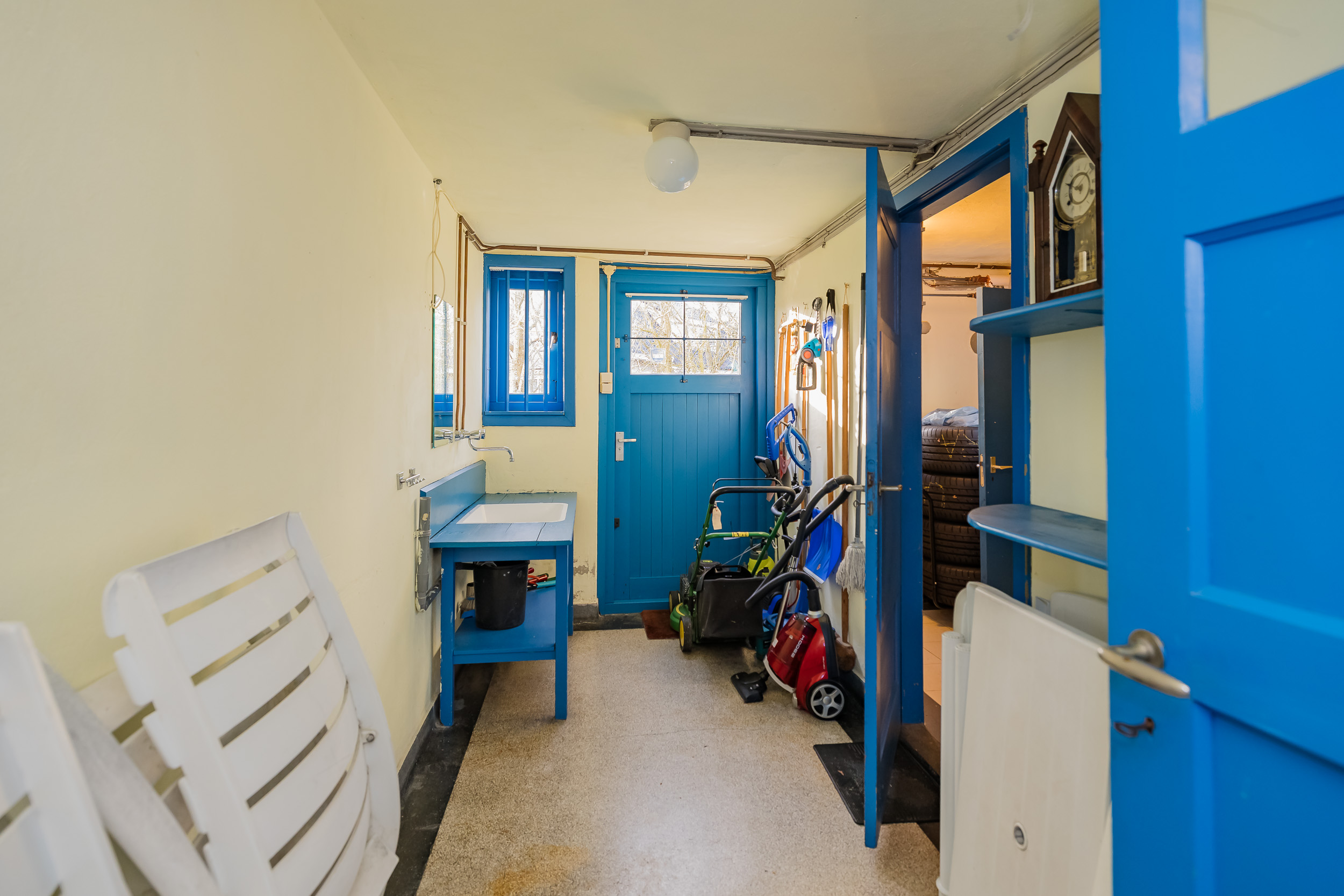 The home features a full basement. Here you will find the sauna with a steam room, the charming wine cellar built with lava stone, spacious storage areas, the garage with French doors, and a door leading directly to the garden.