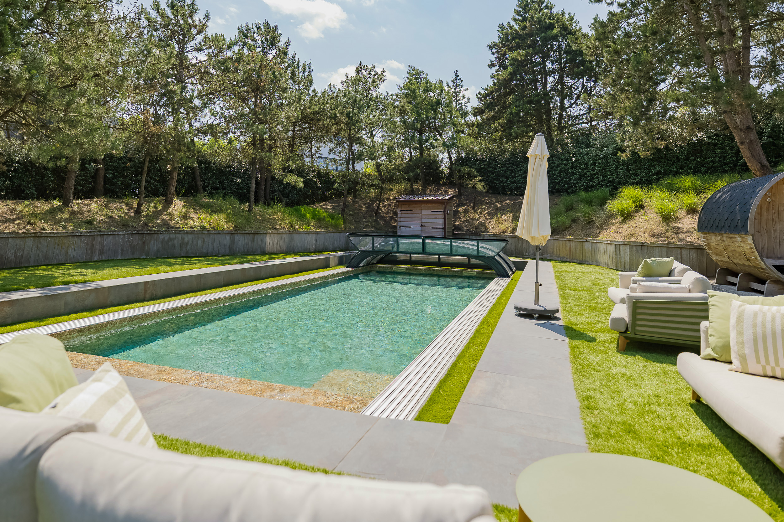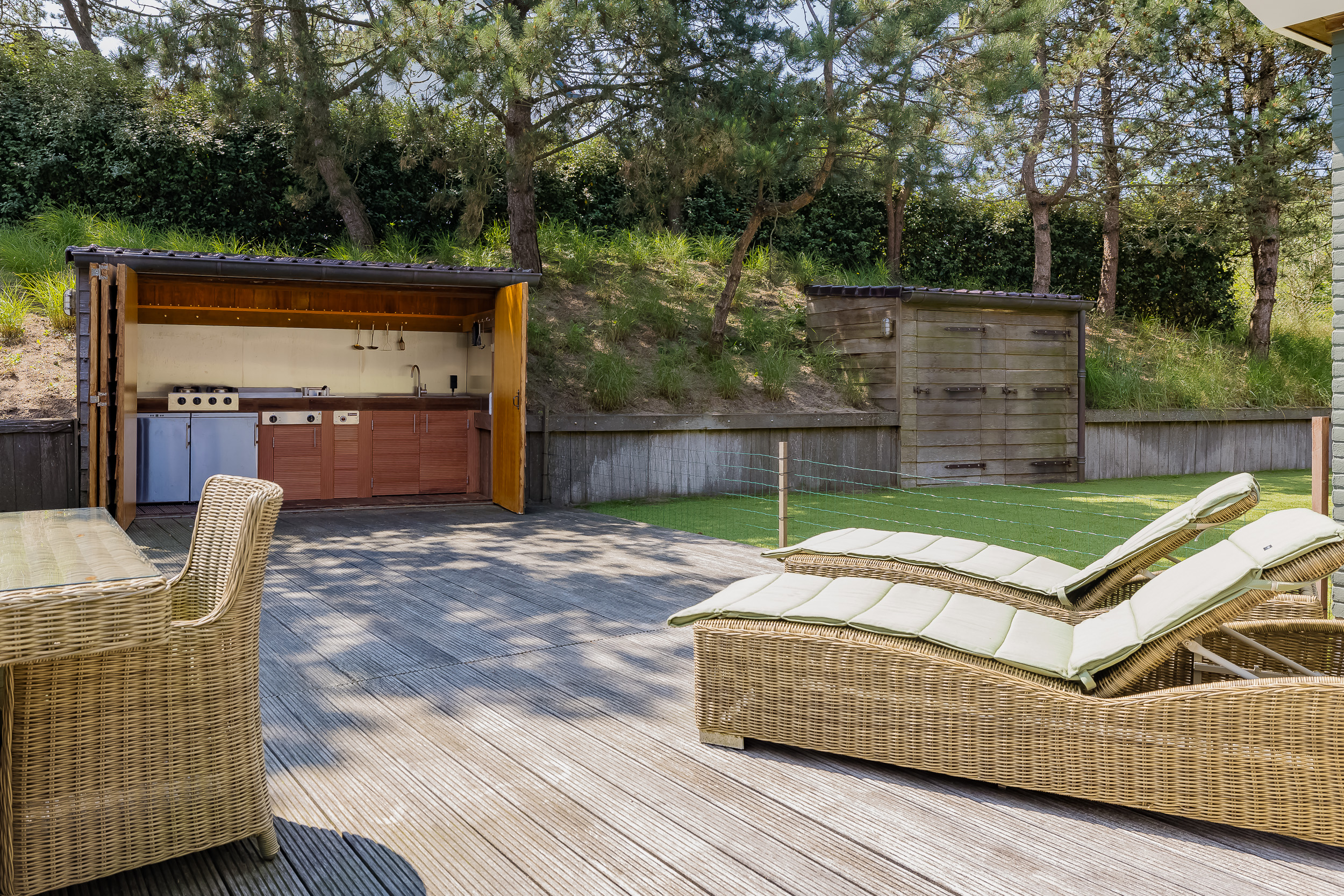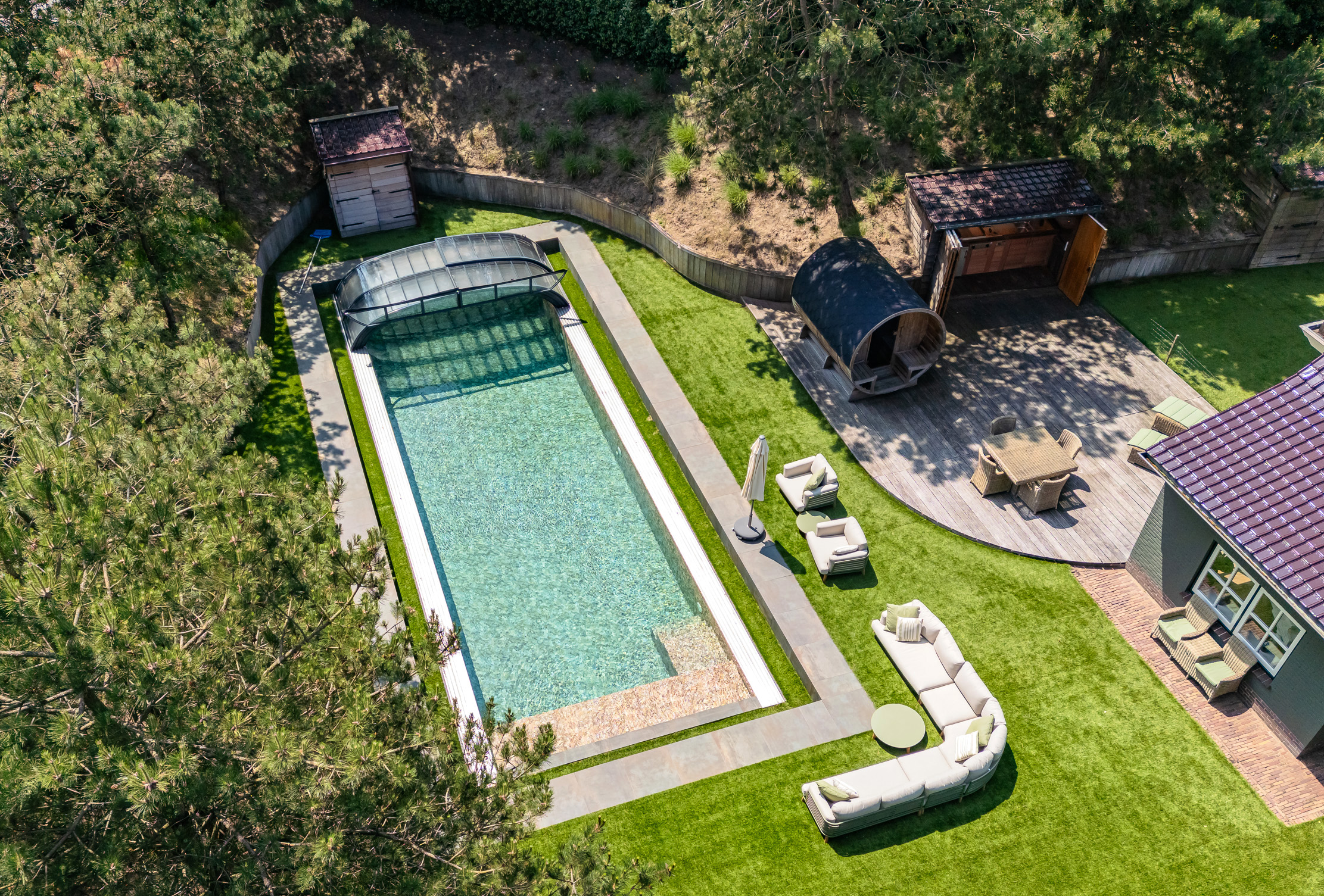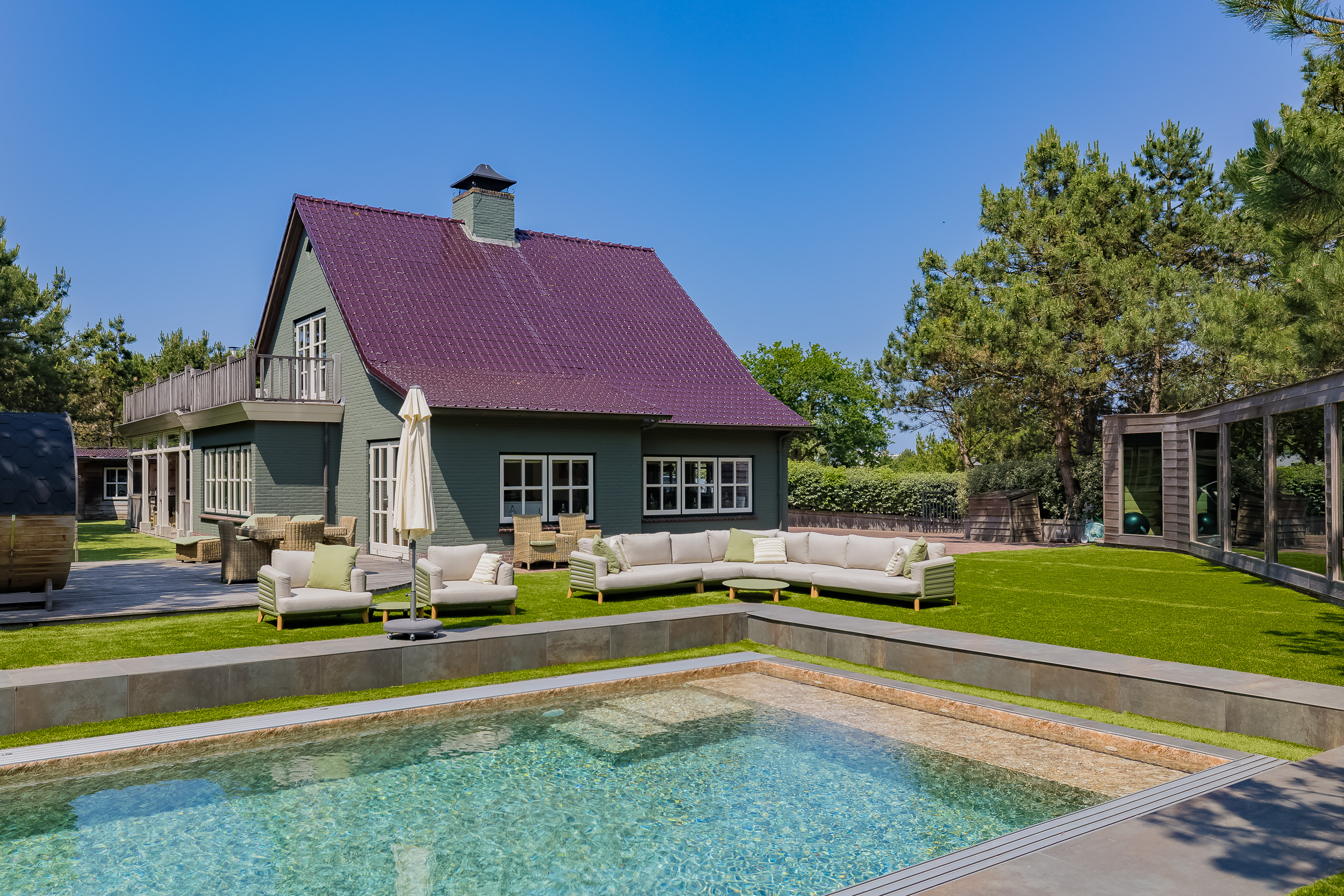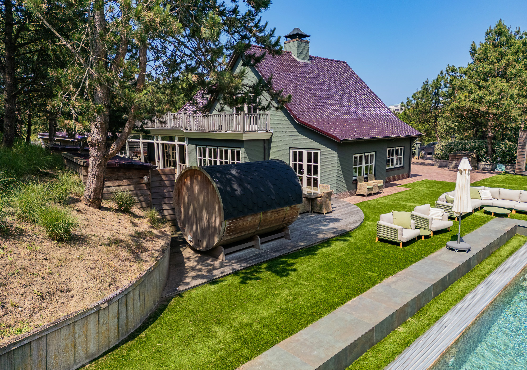The plot is thoughtfully designed with natural, sustainable materials: from the garage path in old bricks to the Red Cedar garden houses, shed and gym. Everything is designed to blend stylishly into the natural environment. The garden offers absolute privacy.