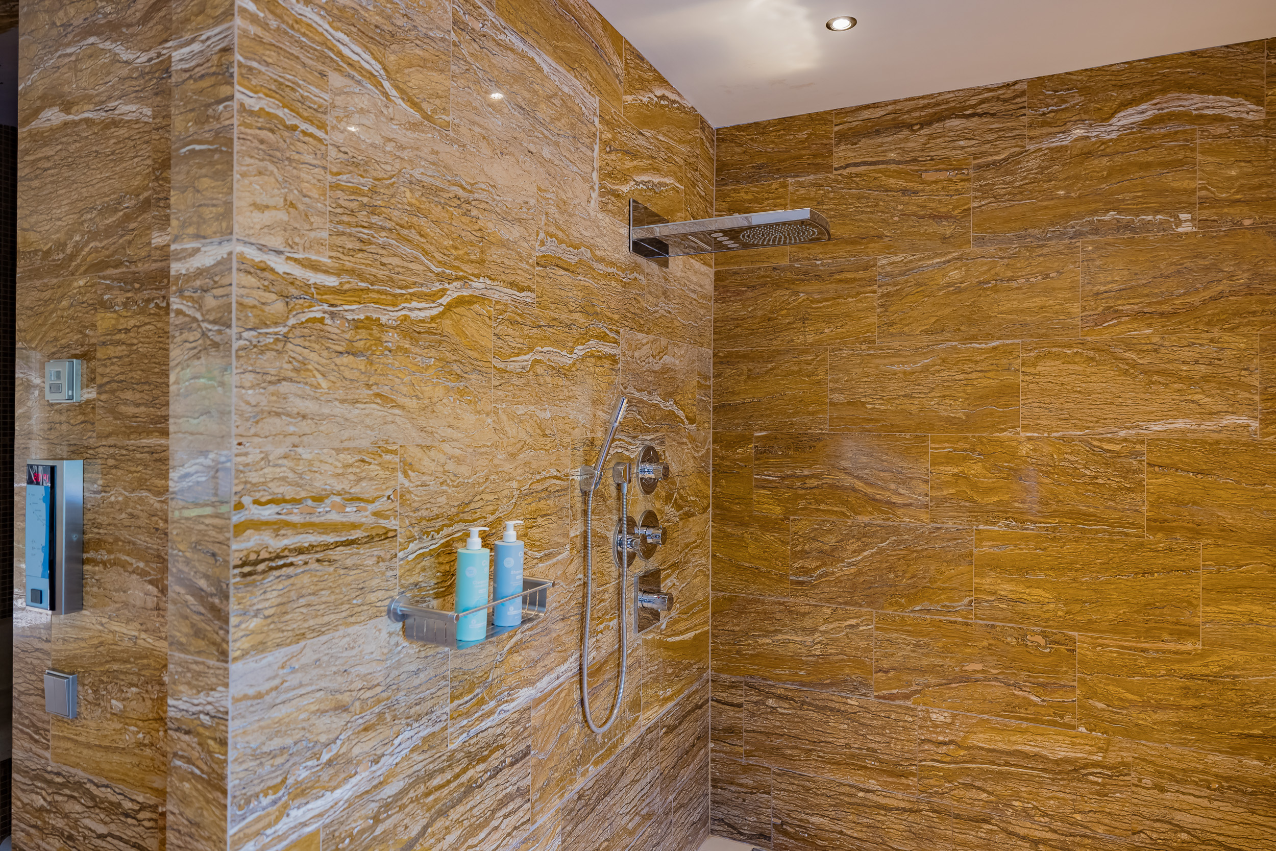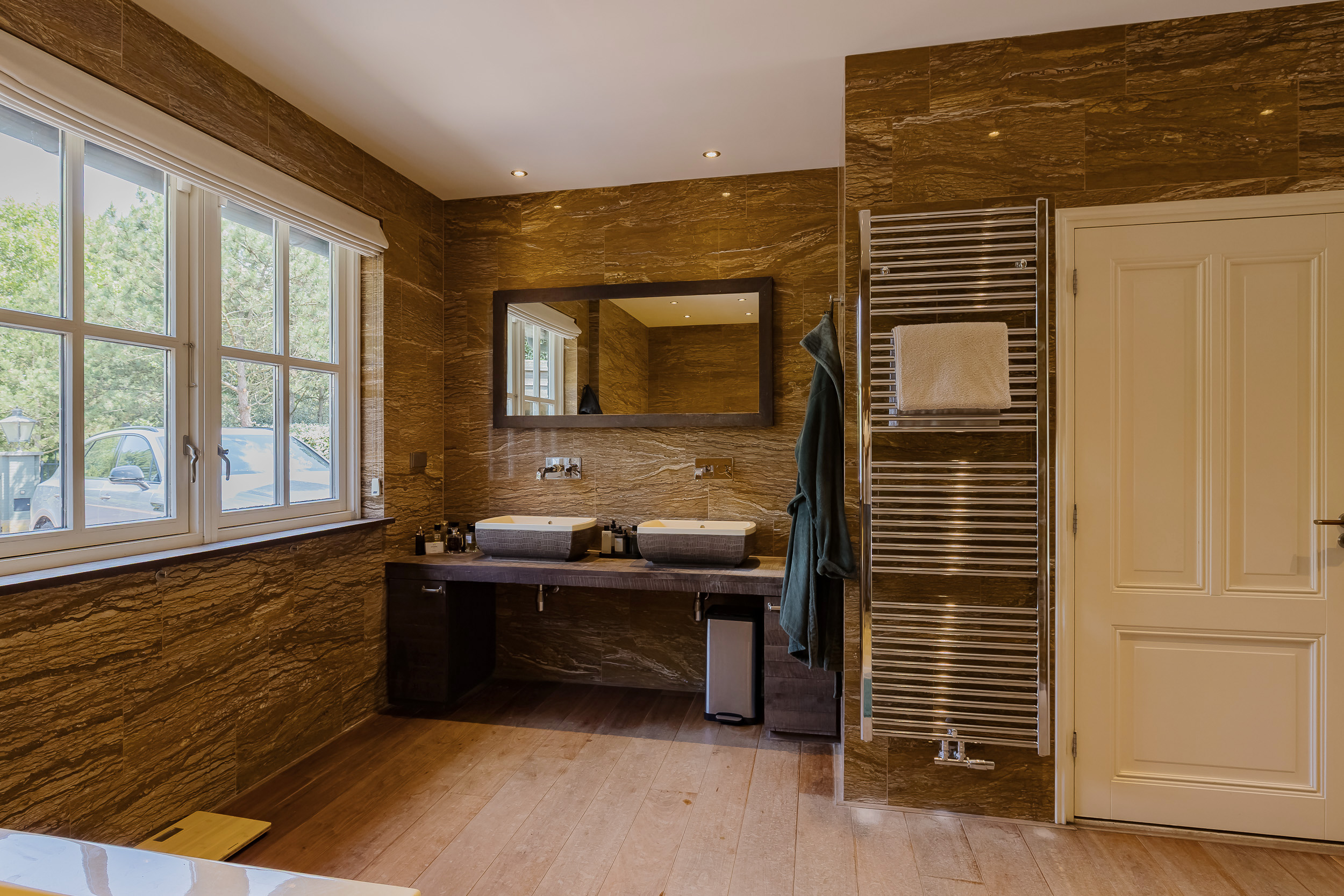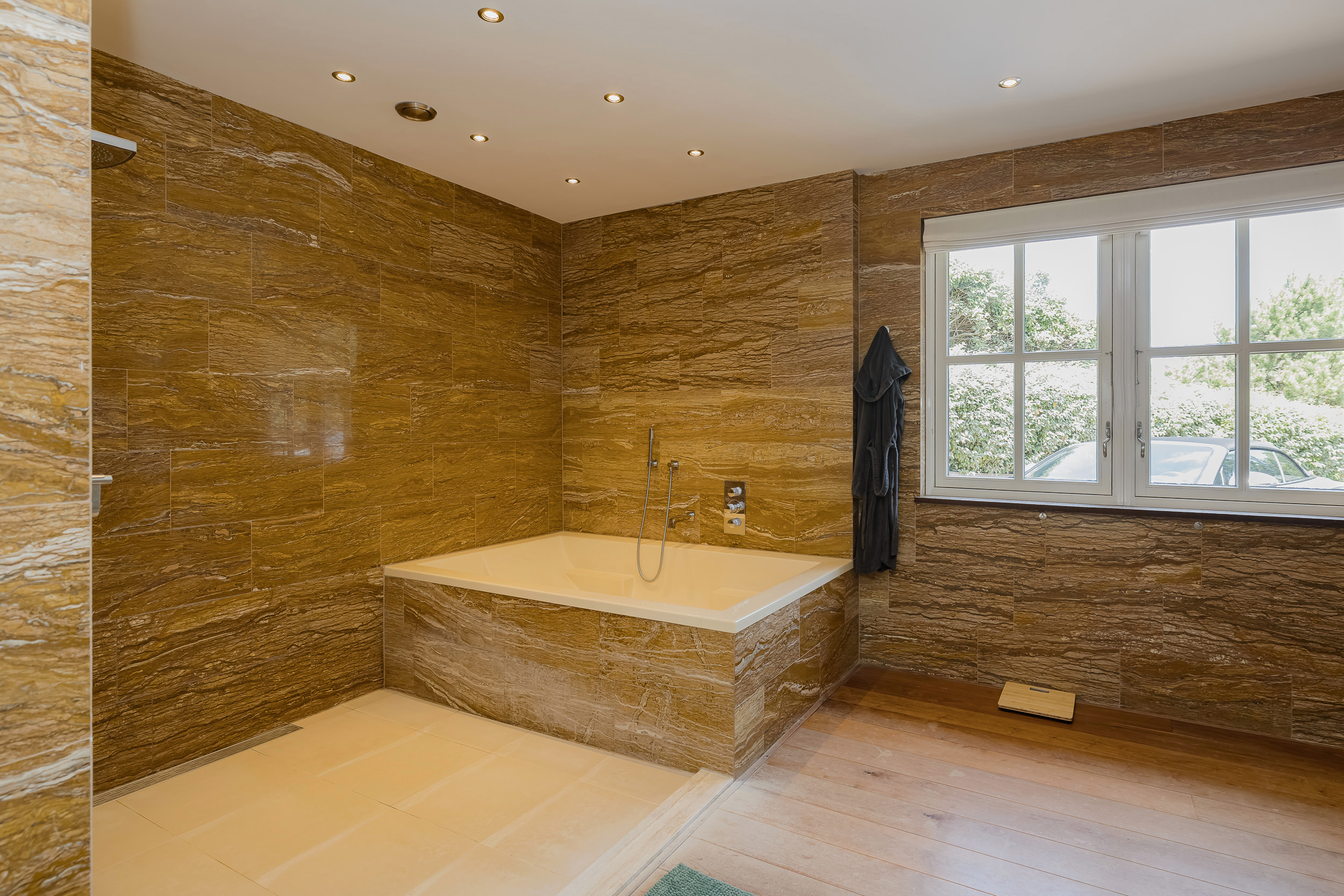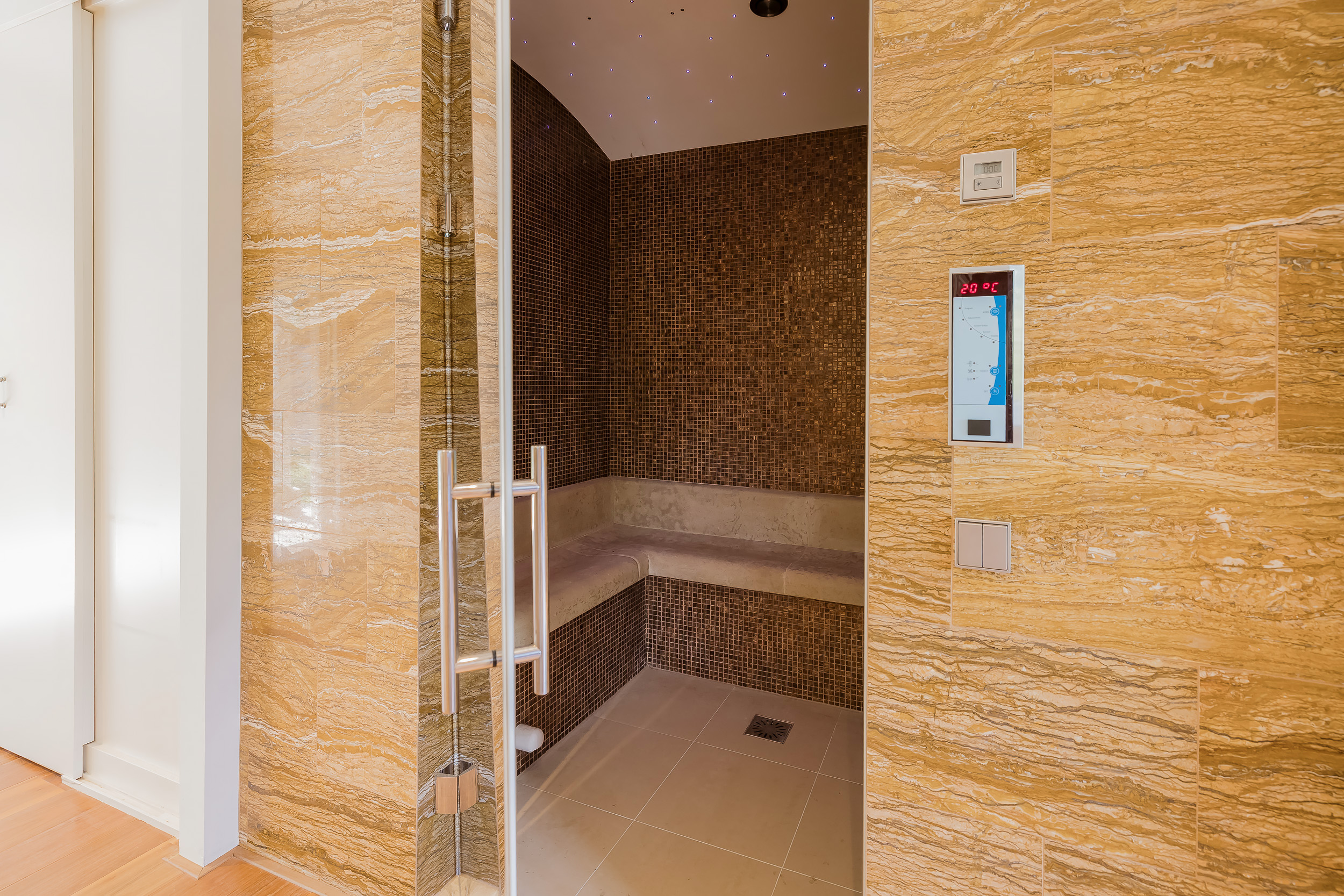 The ground floor bedroom forms its own wing, including a luxurious bathroom with marble tiles in warm terra tones, a walk-in shower with massage functions, a steam room with starry sky and double sinks with unique leather wash basins. The room has a fine walk-in closet and plenty of closet space. The custom-made TV cabinet with elevator completes the feeling of comfort and luxury. From the bedroom you step right onto the beautiful porch with heaters and lighting - a place where inside and outside blend seamlessly.