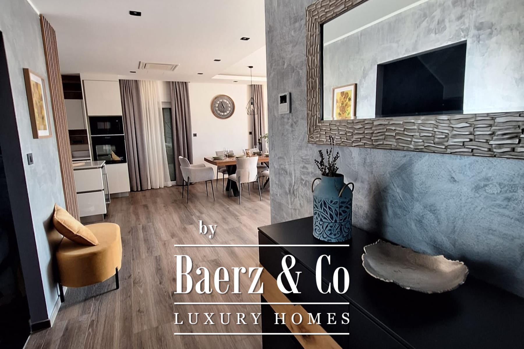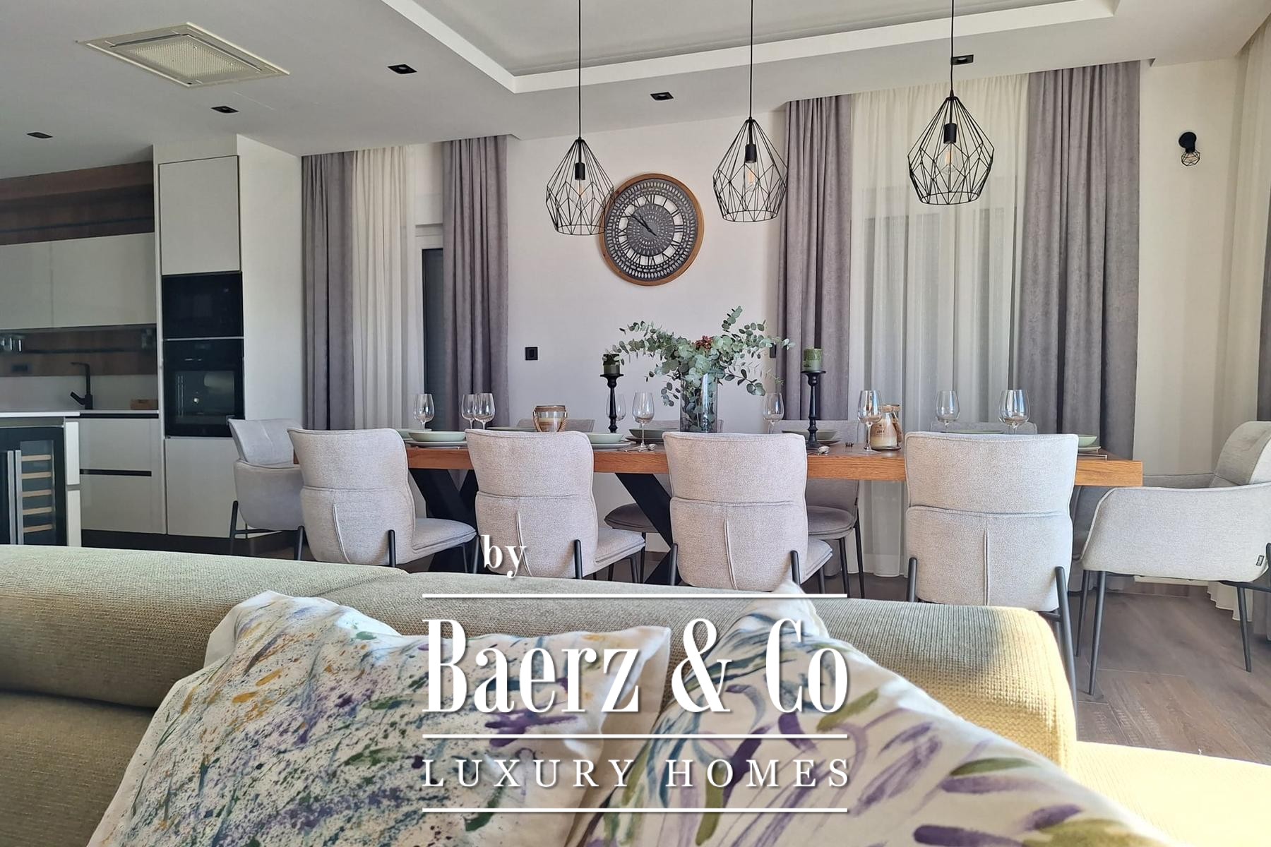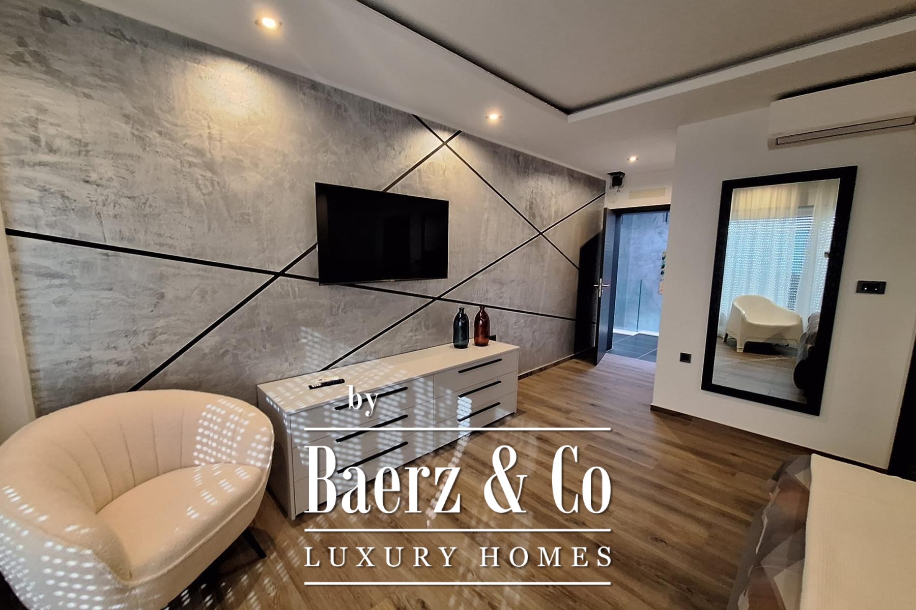 Upstairs, four bedrooms each occupy their own territory, all with private en-suite bathrooms, balancing autonomy with family togetherness. Outside, a generous terrace frames the swimming pool and extends the living space toward the sea, inviting extended afternoons of quiet contemplation or convivial gathering. This property, a luxury villa for sale in Novi Vinodolski, combines clarity of design with an enviable coastal address.