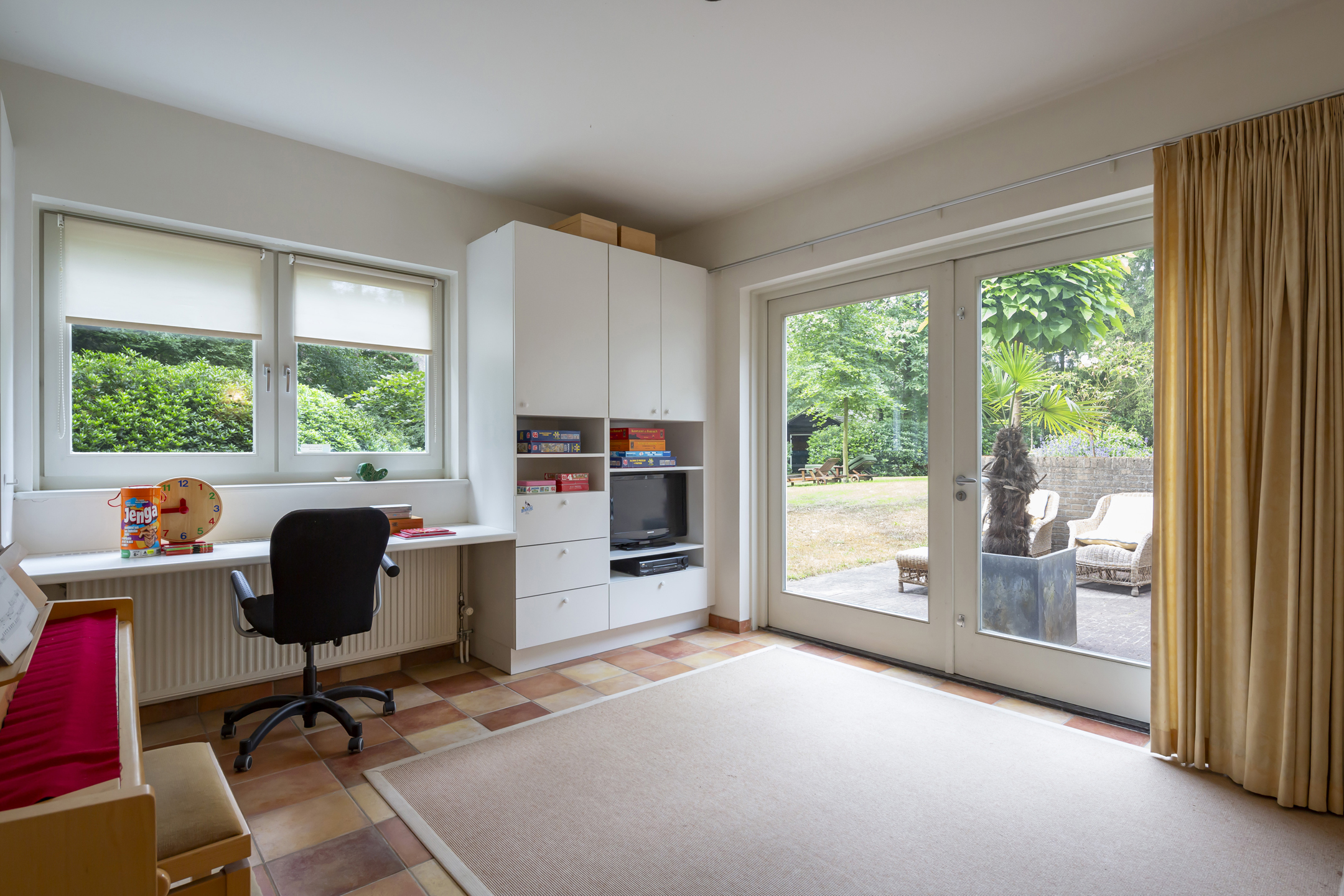 The attractive living room with fireplace is wonderfully light thanks to the large windows and has a view of the fantastic garden. The double large sliding doors provide access to the spacious covered terrace.