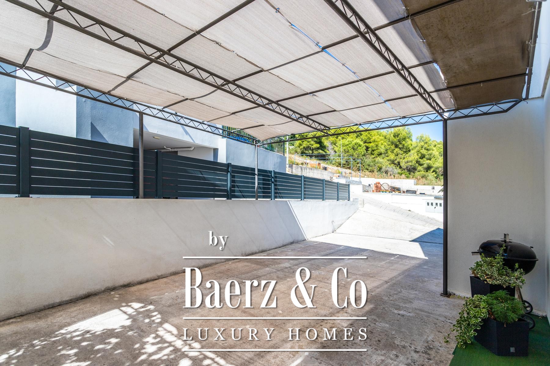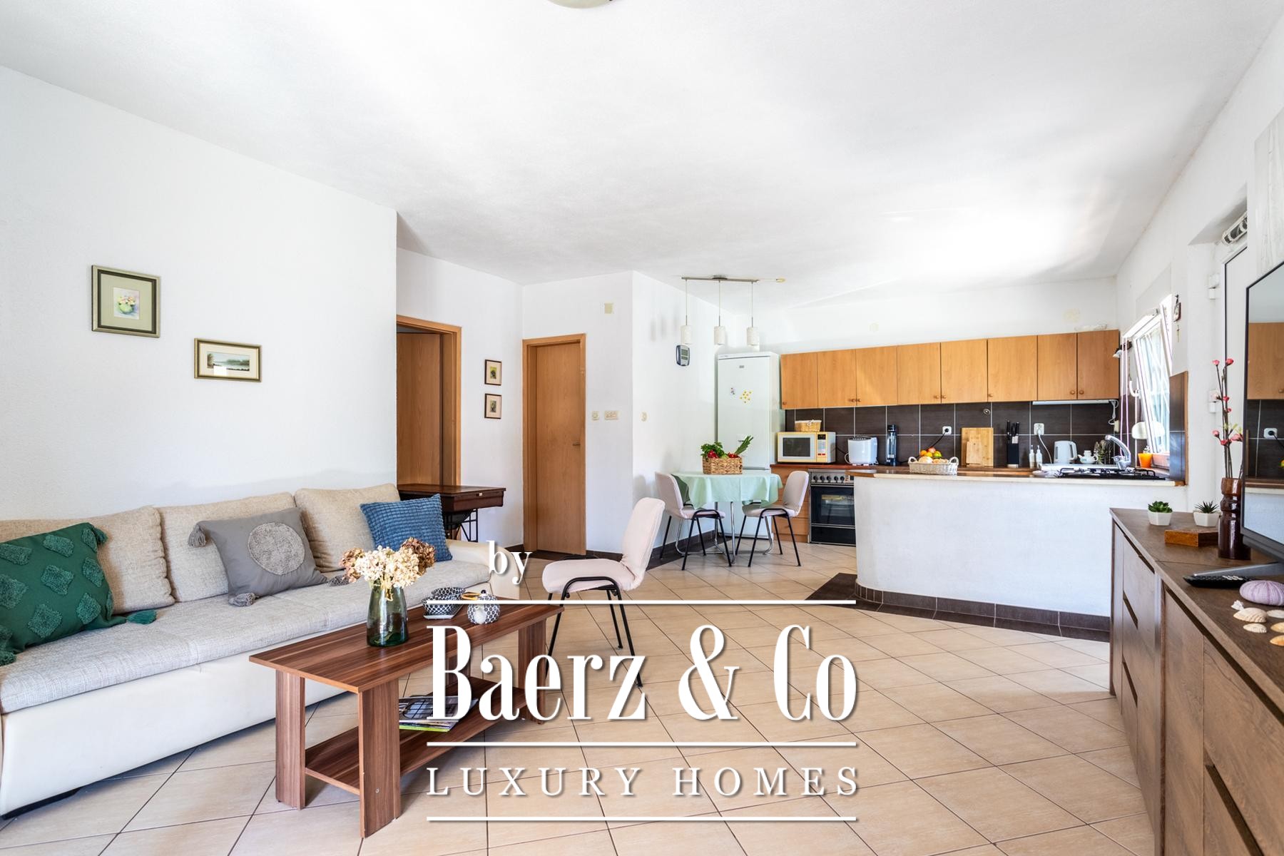 The top floor features a two-bedroom residence whose living room and kitchen are bathed in natural light, opening onto covered and uncovered balconies with sea views. The middle level comprises two one-bedroom apartments, each with its own entrance. The eastern unit opens to a sheltered terrace, while the western apartment enjoys a large sunlit terrace. On the ground floor, a spacious one-bedroom apartment extends out to a landscaped Mediterranean garden—olive trees, grapevines, rosemary, and palms invite tranquility, complemented by an outdoor kitchen and shaded dining under the vines.