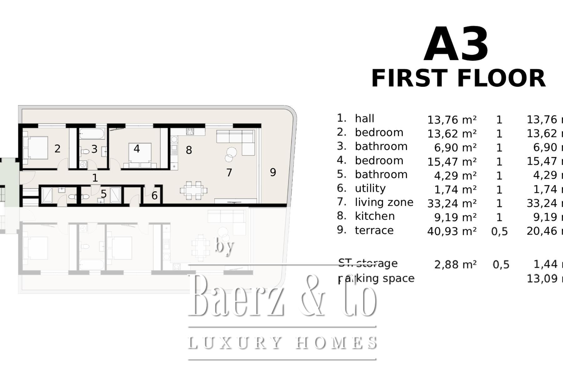 Apartment A3 spans a total of 120 m², with an interior living area of 98.21 m² purposefully arranged for comfort and function. The layout includes an entrance hall, storage room, two spacious bedrooms, and two modern bathrooms. The open-plan living zone connects kitchen and dining areas, leading seamlessly onto a generous 40.93 m² terrace with captivating sea views.