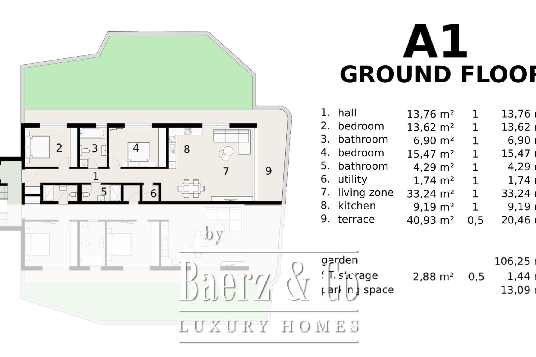 Designed with a focus on contemporary architecture and enduring quality, the property comprises an entrance hall, two spacious bedrooms, two modern bathrooms, and an open-plan living room with kitchen and dining area. Large glass doors open from the living space to a 40.93 m² terrace, creating a seamless flow to the outdoors and framing panoramic sea views. The 106.25 m² private garden provides a secluded oasis for quiet relaxation or entertaining against a coastal backdrop.