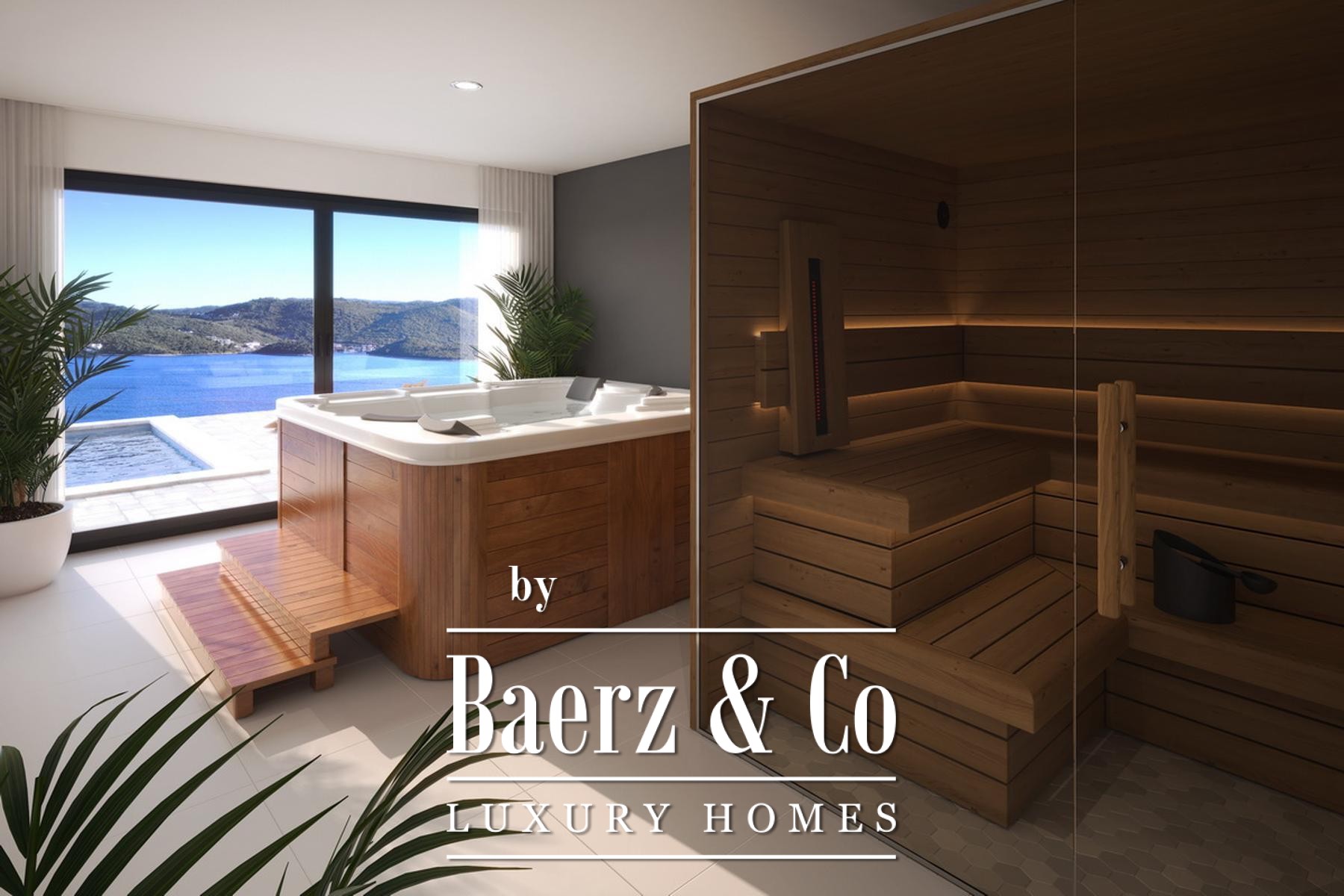 The layout considers every nuance of comfort and privacy. On the lower level, a fitness center, sauna, jacuzzi, and covered terrace encourage daily rituals of wellness, while efficient storage and technical spaces bring quiet order. The ground floor flows from a welcoming hall into an open living and kitchen area, complemented by a covered terrace for shaded gatherings. On the first floor, two bedrooms, an additional wardrobe, a balcony, and refined bathrooms support quiet retreat.