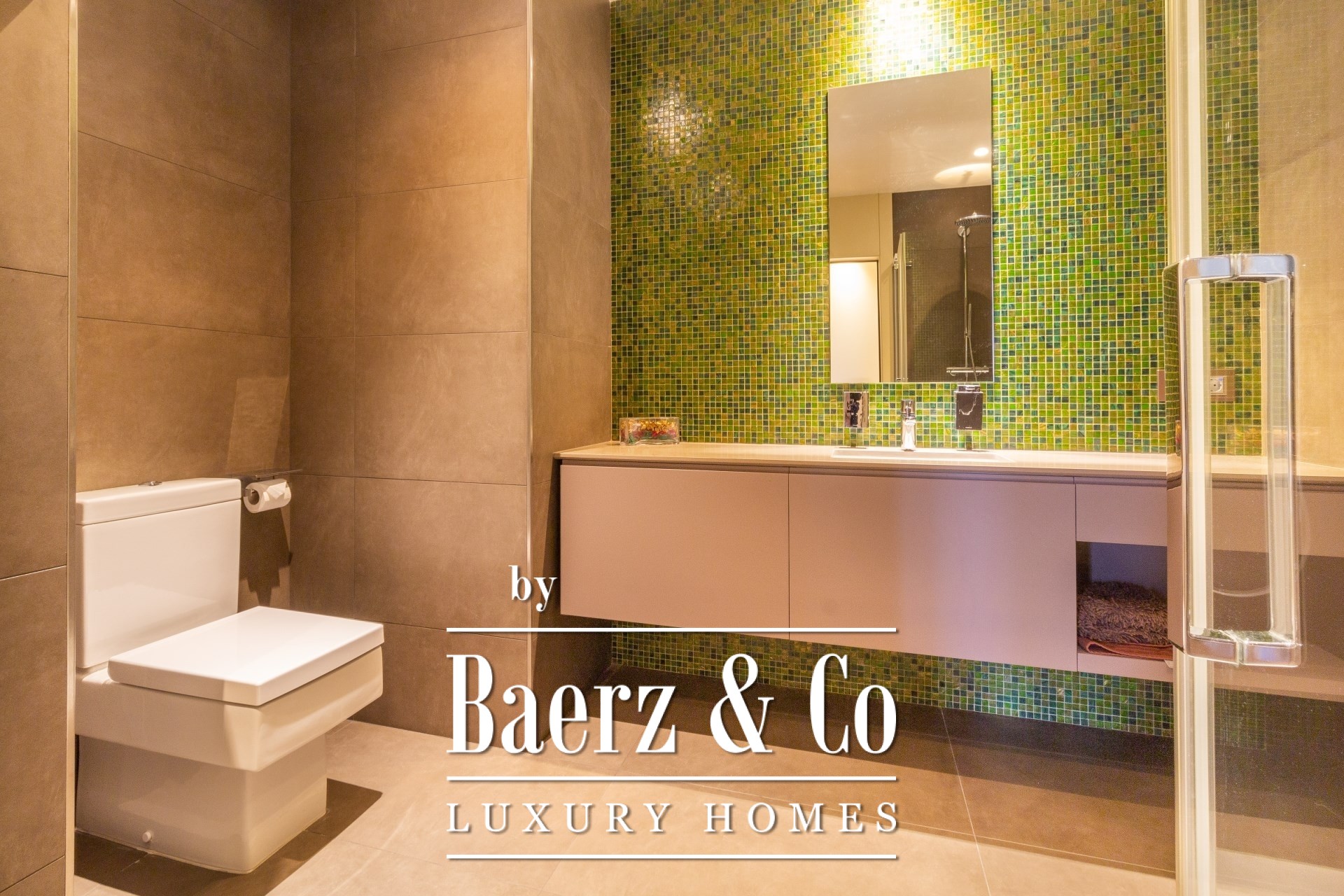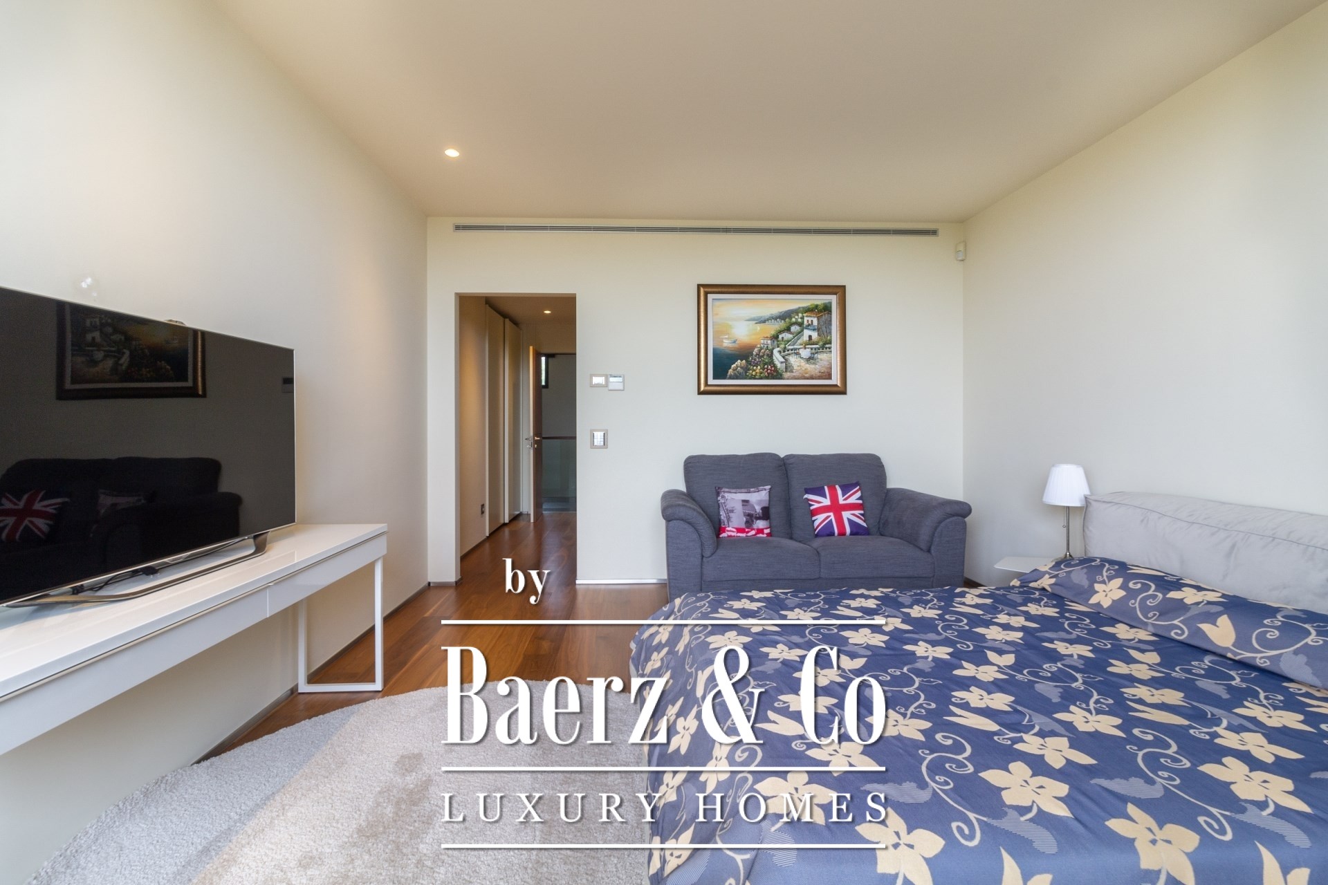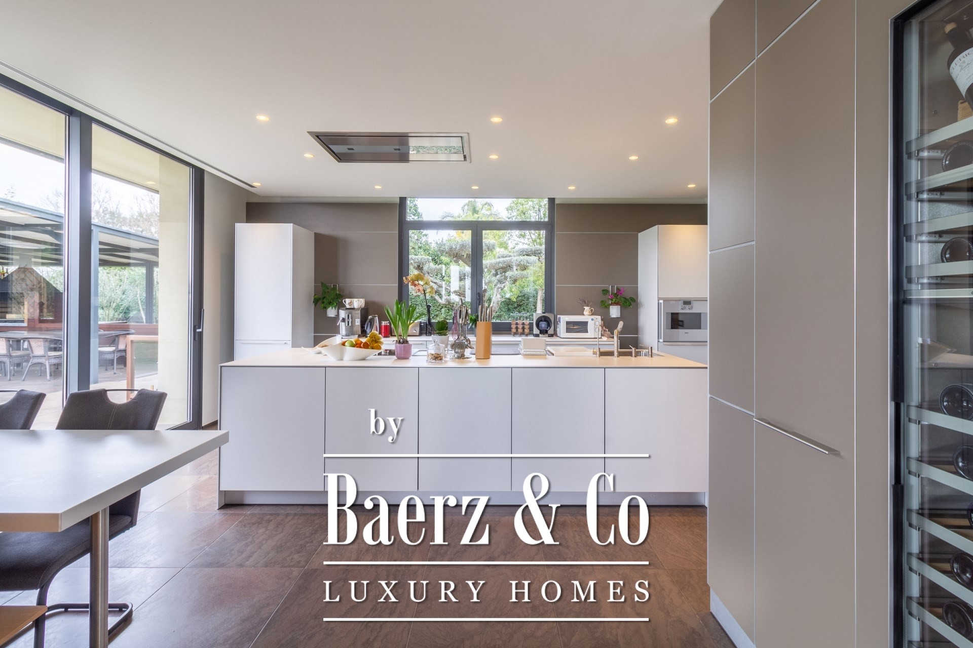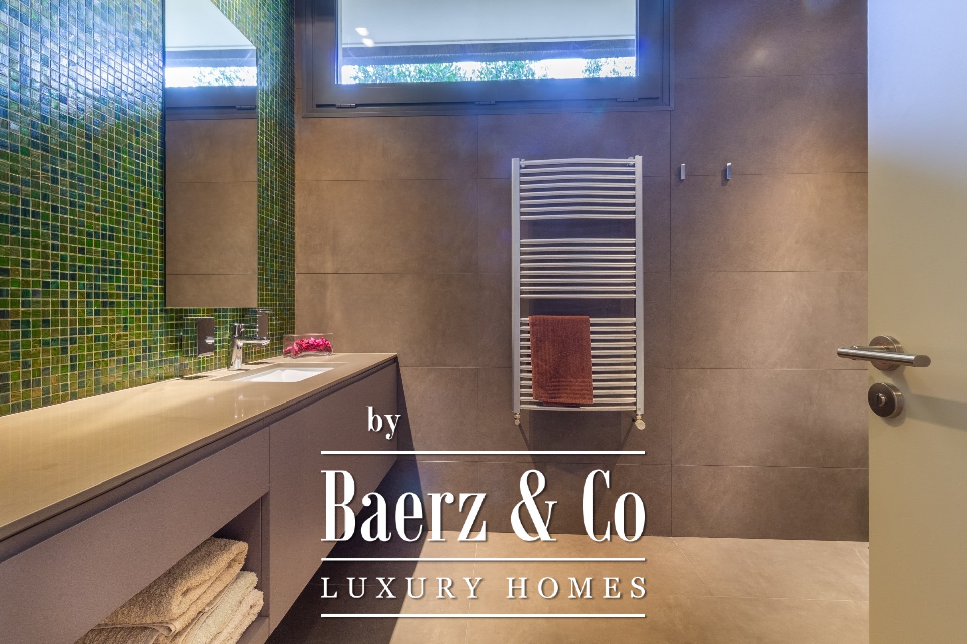 Outdoors, mature gardens surround the pool with its waterfall feature, a barbecue and outdoor kitchen, and expansive chill-out spaces. Underfloor heating, ducted air conditioning, electric windows, integrated audio, complete surveillance, and an elevator underscore the emphasis on comfort and security.