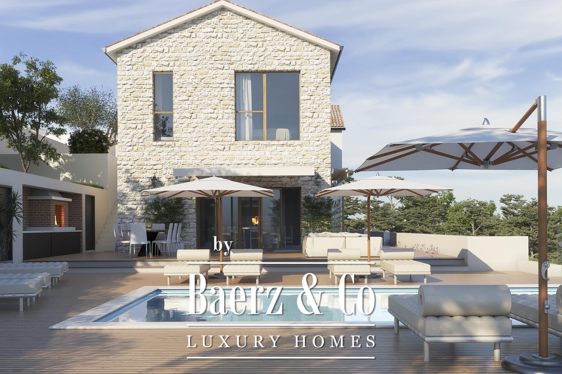 Materials and finishes center on technical precision, featuring smart home systems, photovoltaic panels, underfloor heating, air conditioning and automated shutters. Landscaped Mediterranean gardens, a private olive grove and a spacious pool terrace offer serene spaces for relaxation and gatherings. The outdoor kitchen and traditional konoba extend the living environment, with a double garage and additional parking enhancing everyday functionality.