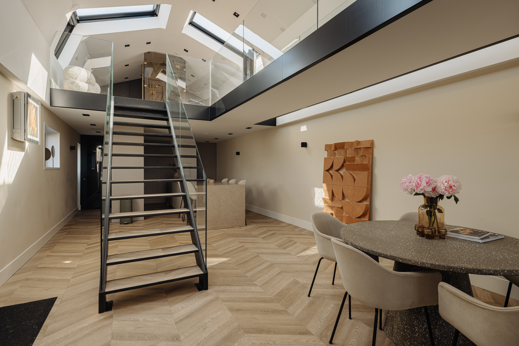 The main house is connected via a glass atrium to the rear section, which includes an indoor gym with a bar (formerly a 3-car garage). On the first floor of the rear building, you’ll find a self-contained studio apartment, complete with living room, bedroom, bathroom, and private kitchen — ideal for a live-in family member or au pair.