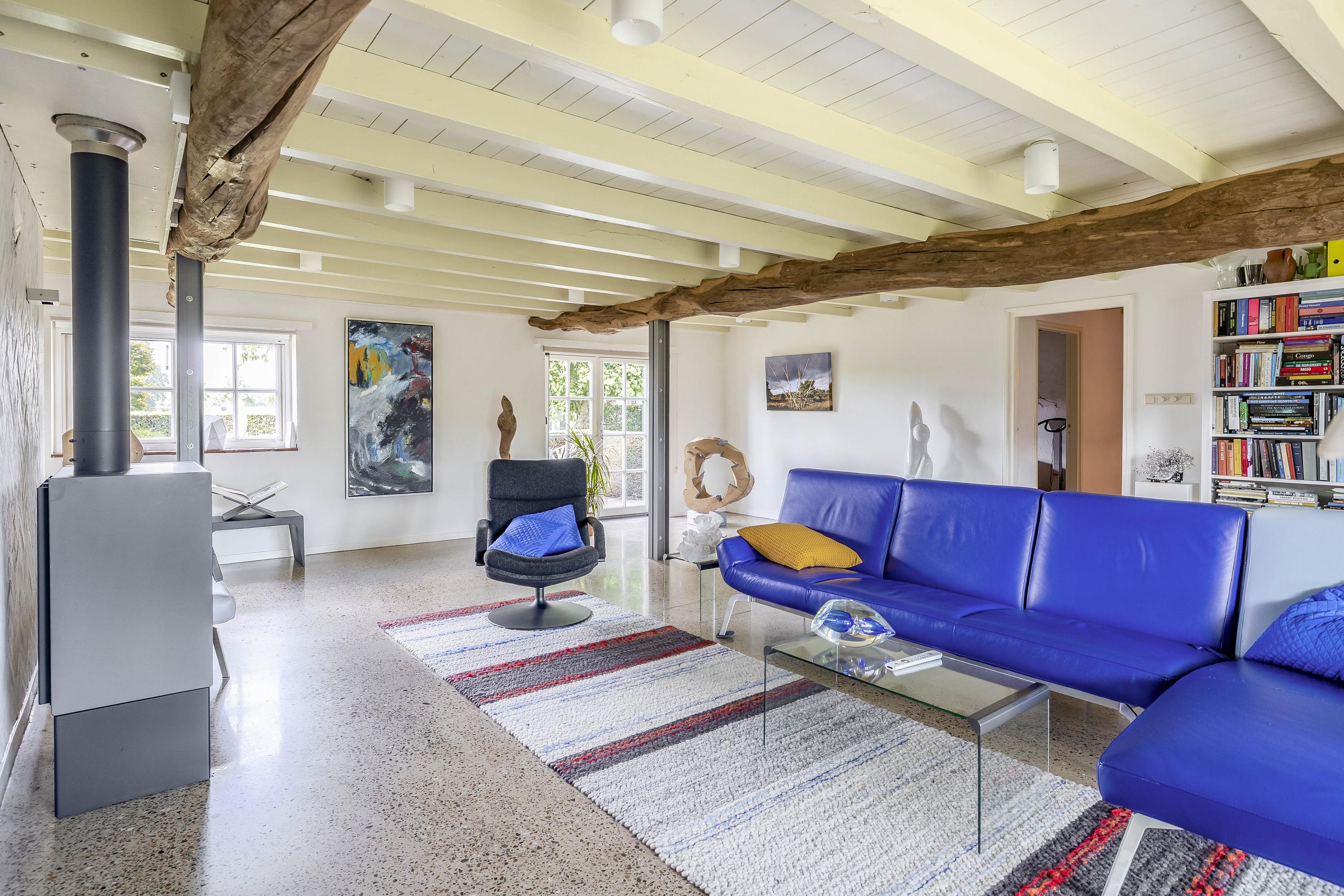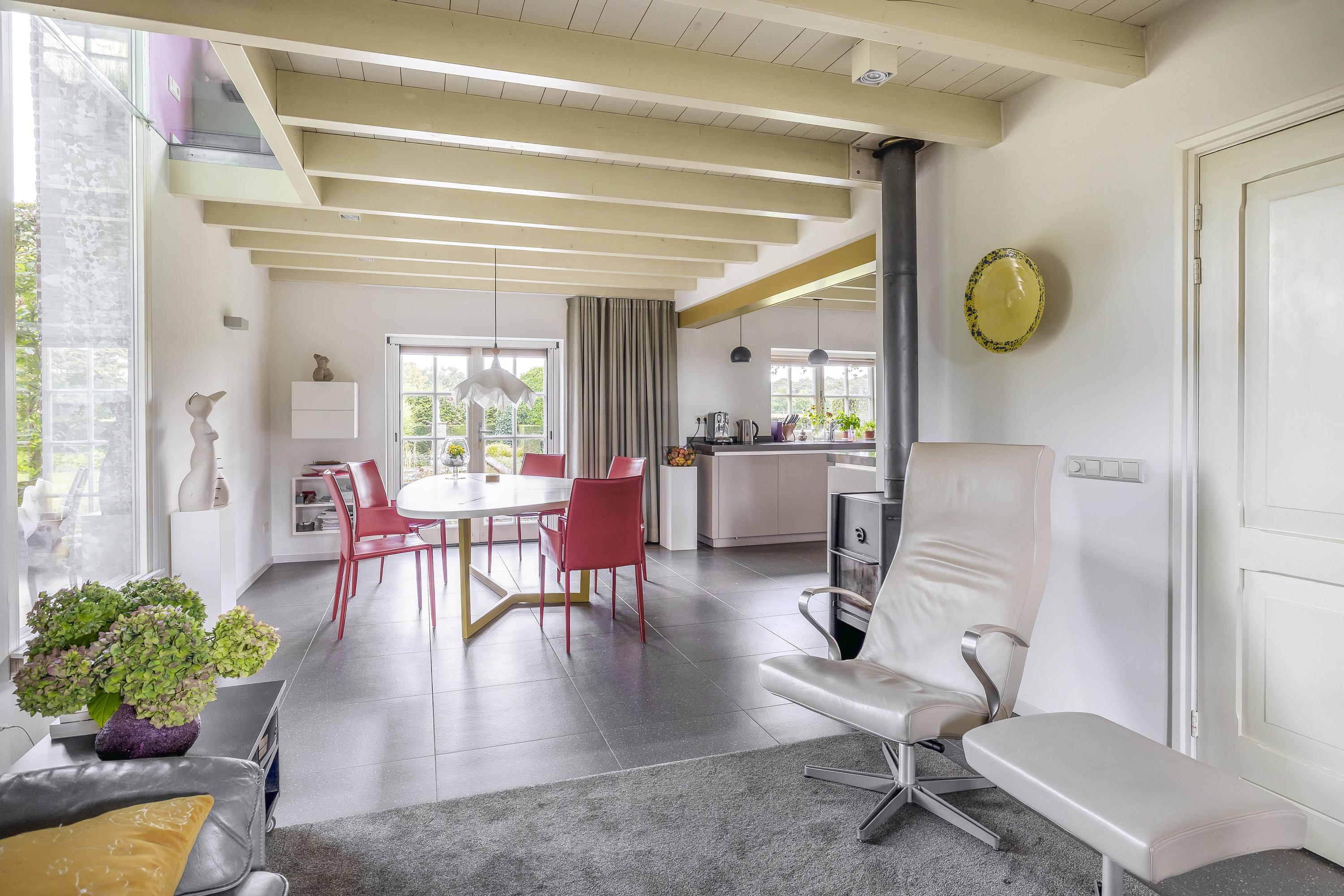 Double doors from the kitchen lead to the living room, which has a smooth, polished concrete floor with underfloor heating. The living room has stucco walls and a beautiful wooden beamed ceiling with attractive old oak beams. A large window at the front and double French doors at the rear offer a beautiful view of the garden. Here too, a wood-burning stove has been installed for extra warmth and cosiness.
