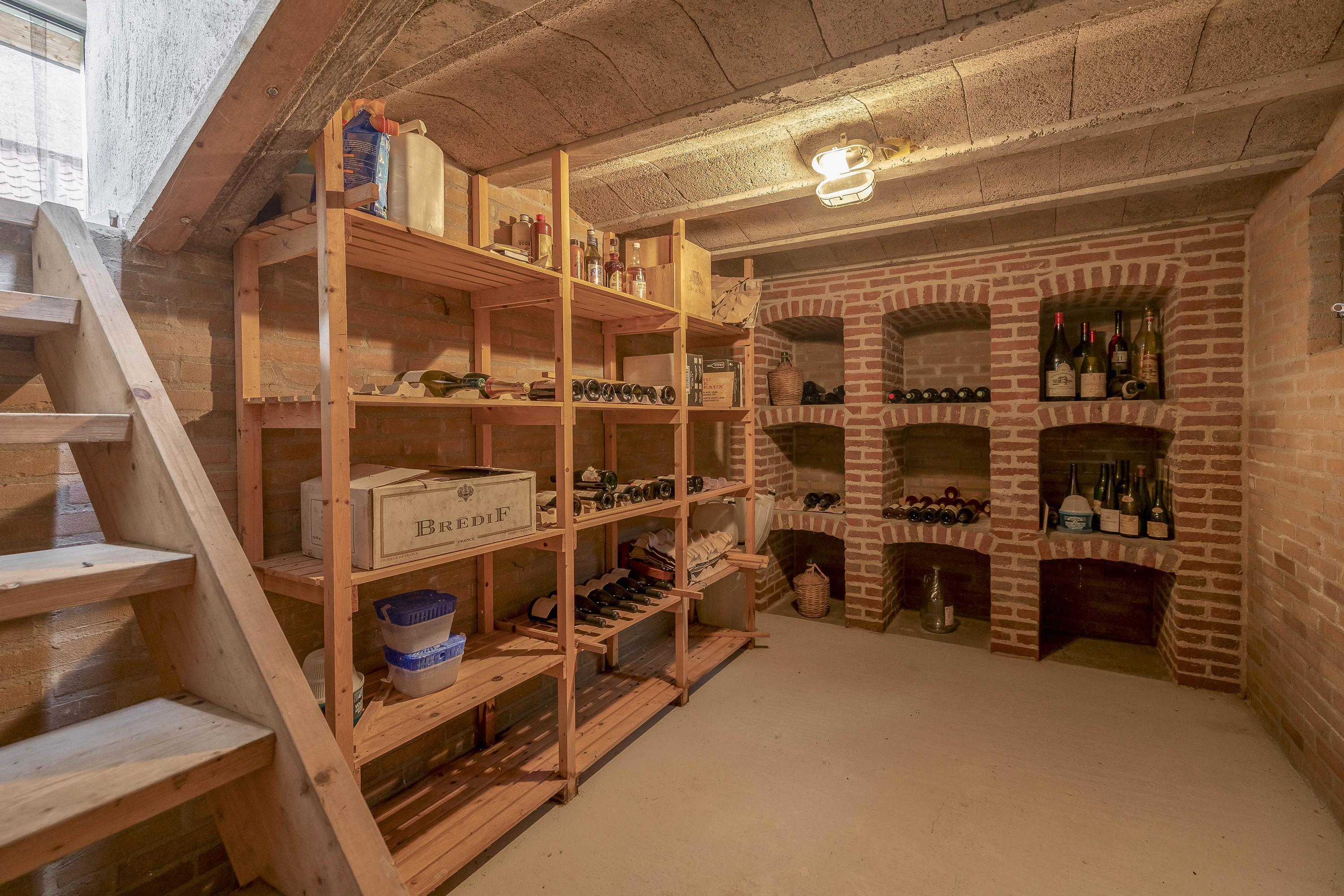 Behind the house is a detached building, the garden house, which includes the garden room, studio space, and a wine cellar, built entirely of stone and with a tiled roof. The garden room is entirely glazed on three sides, with sliding doors on the garden side and folding doors on the terrace side. From here, you have a beautiful view of the garden. This room has a large fireplace with a substantial wood-burning stove and an electric heating lamp. The floor is laid with old clinker paving.