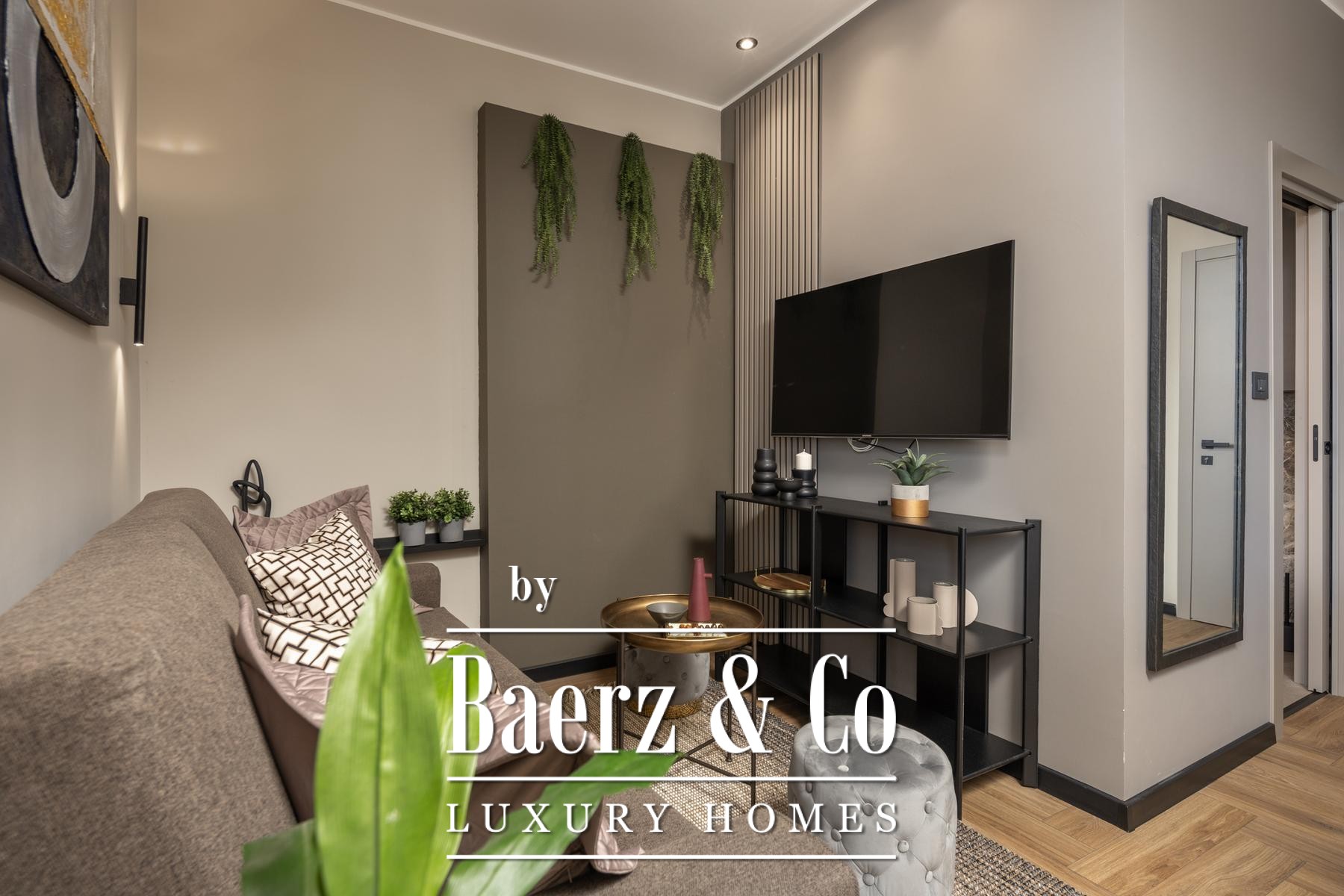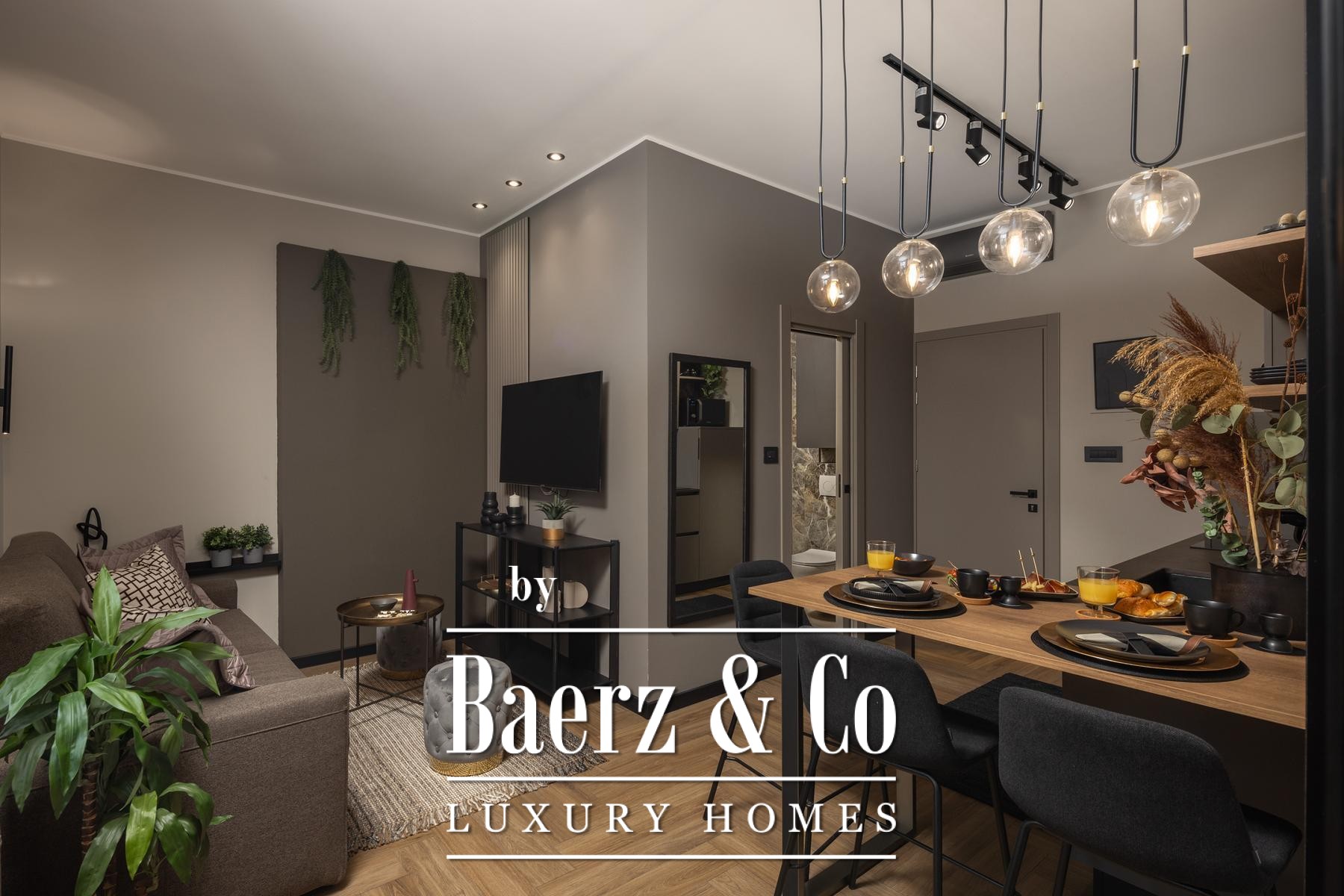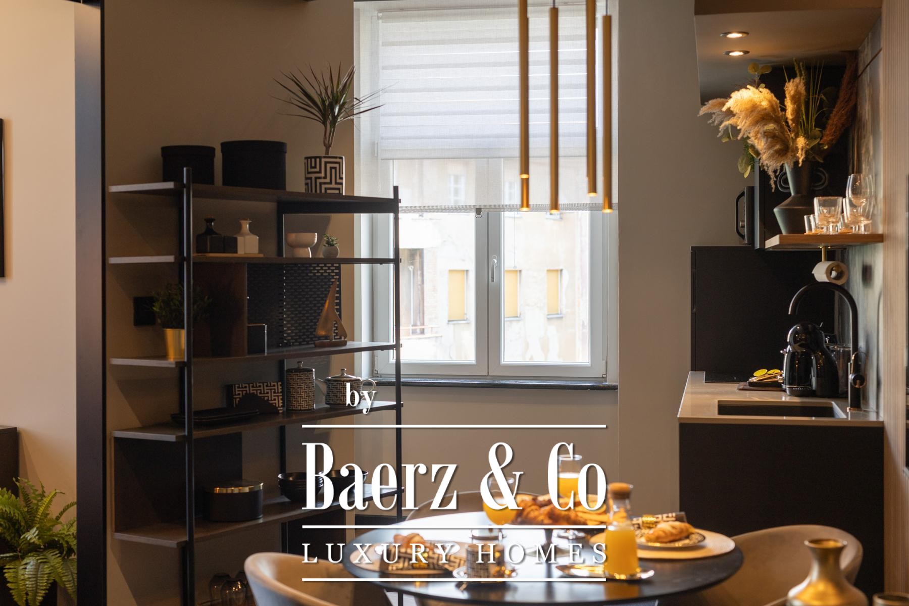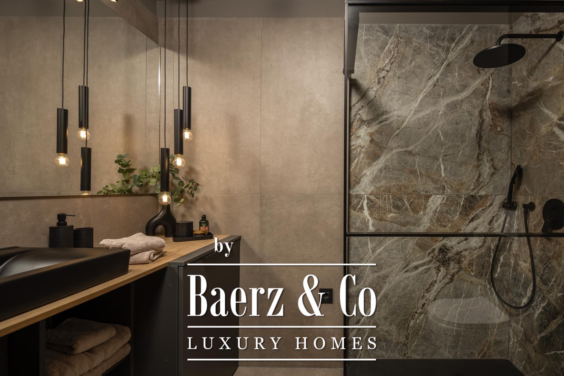 The interiors are shaped by a refined use of warm beige and anthracite, highlighted by gold details and custom lighting. Italian furnishings, large-format porcelain tiles, and matte black Veneta Cucine kitchens with sophisticated stone-marble backsplashes set an elevated tone. Frosted glass partitions, wooden wall slats with LED accents, and designer brass lighting complete the ambience.