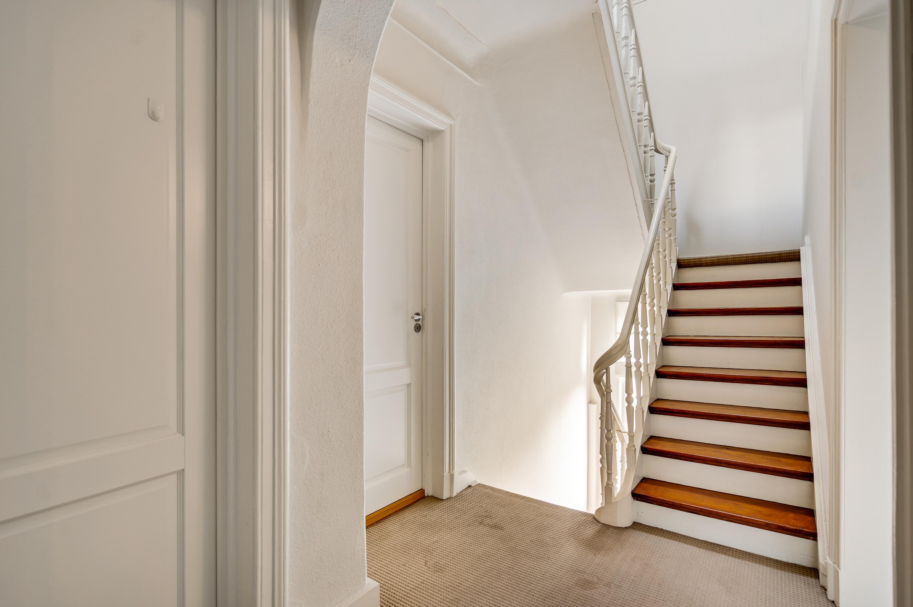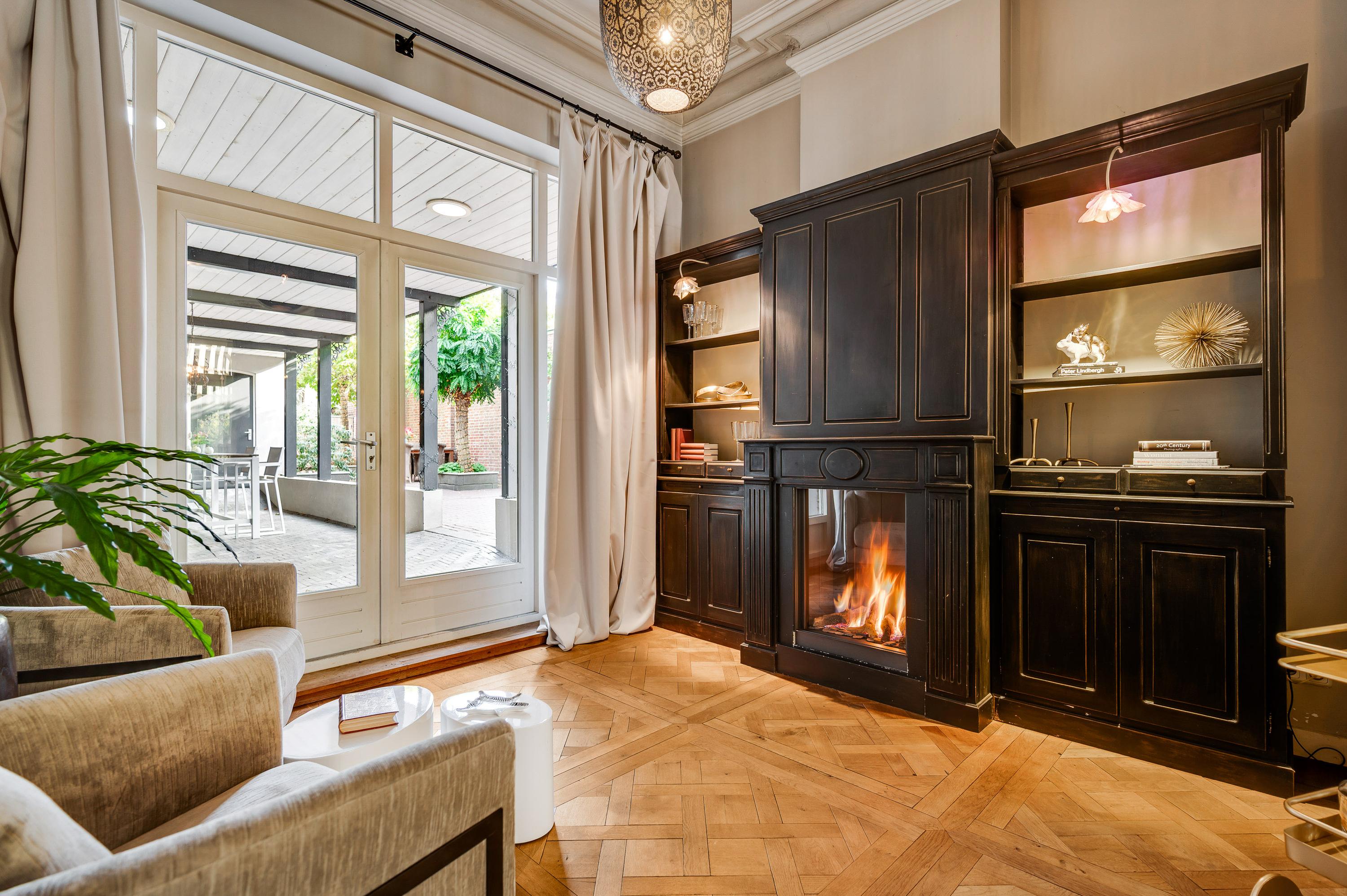 Upon entering, you are immediately embraced by the warm atmosphere and refined finishes. The impressive living room, nearly ten meters long, forms the heart of the home. Here, a beautiful Versailles parquet floor is laid, which, combined with the designer gas fireplace and the tall windows, creates an atmosphere of exclusive tranquility. Through the French doors, the space flows seamlessly into the covered terrace and the stylish city garden – a private oasis in the heart of the city.