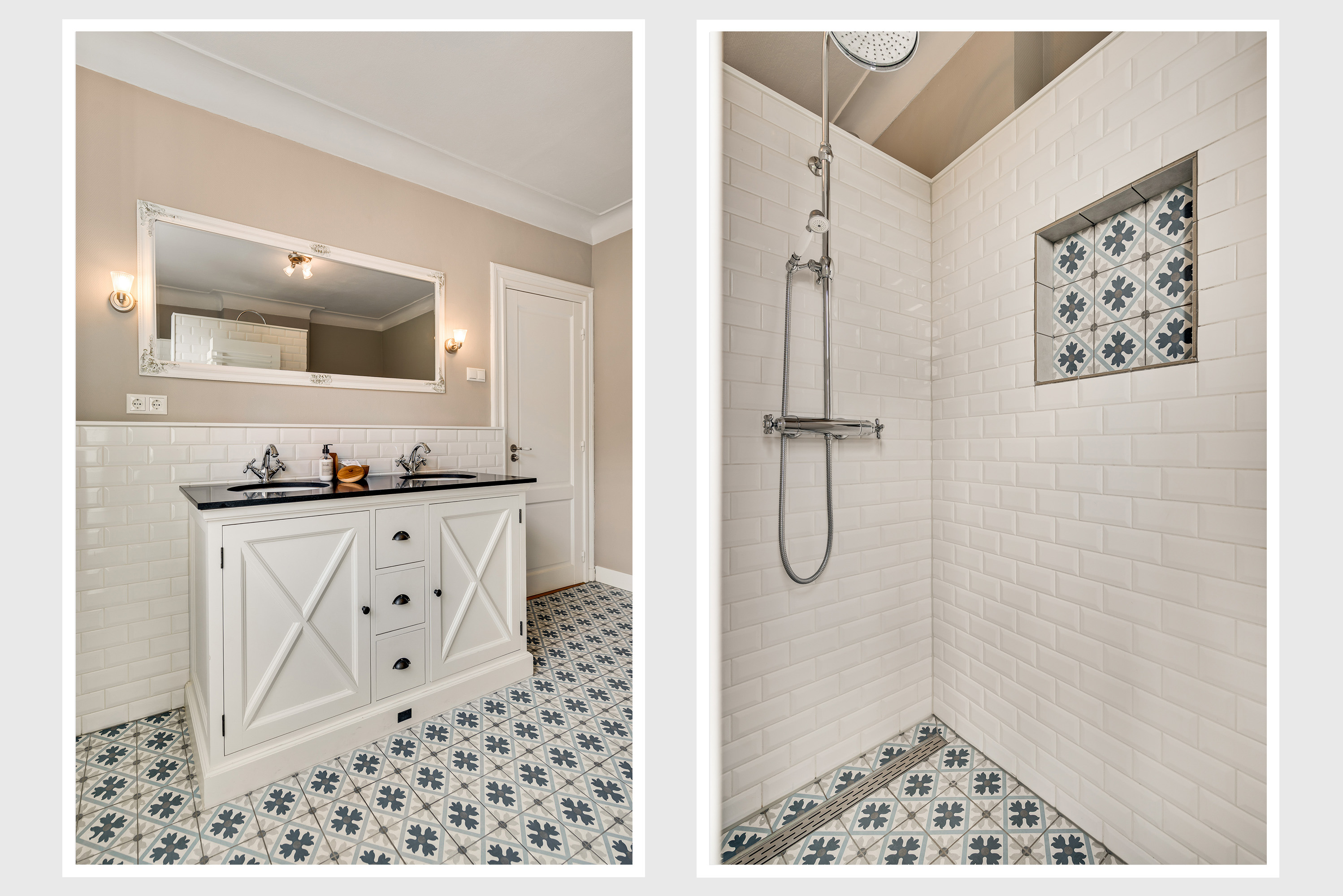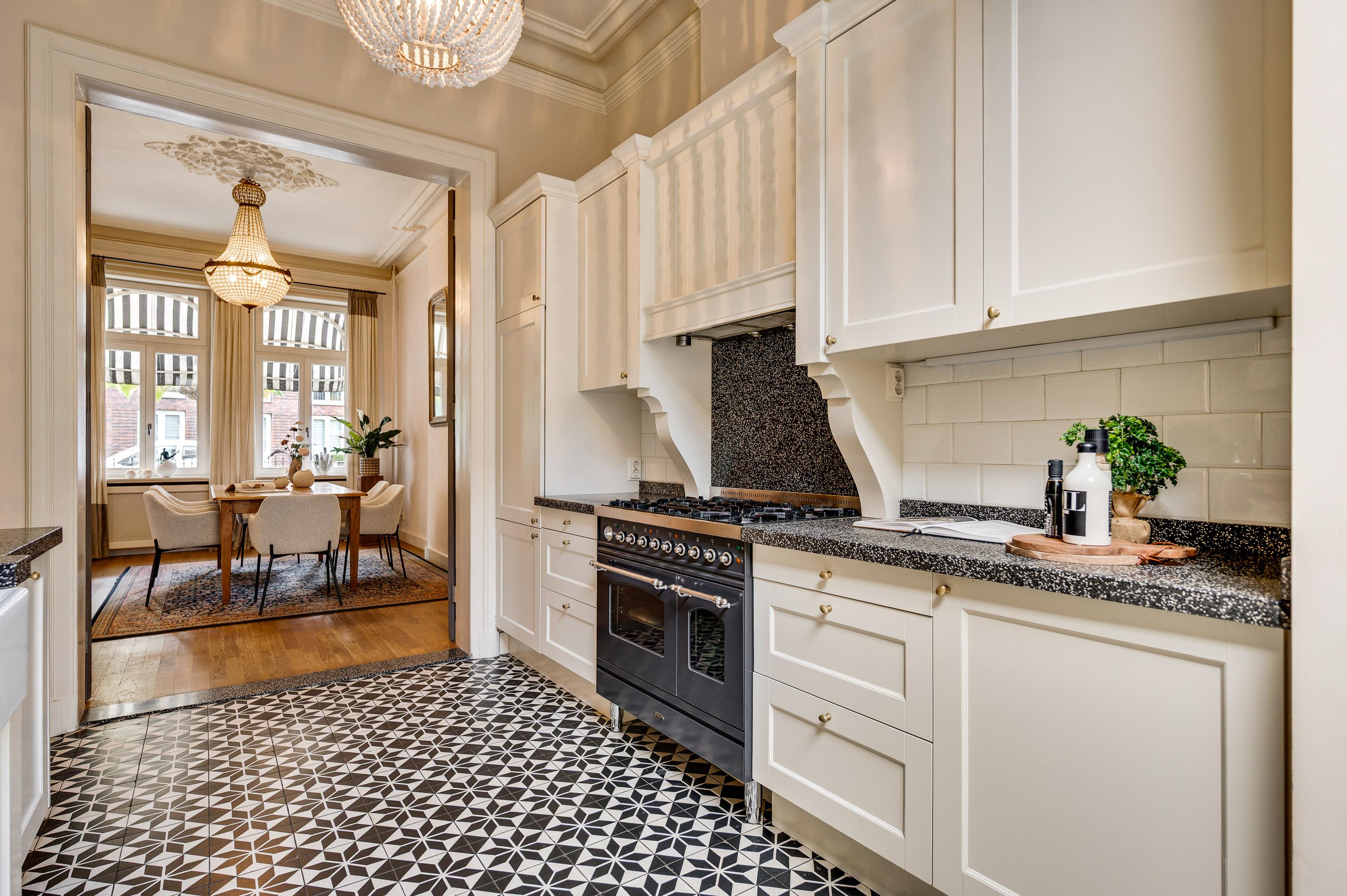 From the stately hall, you enter the impressive kitchen-diner of approximately 25 m². It is equipped with a luxurious kitchen layout that combines classic craftsmanship with modern convenience. The terrazzo countertop, the 6-burner Boretti gas stove with double oven, and the high-quality built-in appliances make this kitchen the beating culinary heart of the home. The classic tiled floor and the high panel doors that separate the kitchen from the dining room emphasize the refined character of the home.