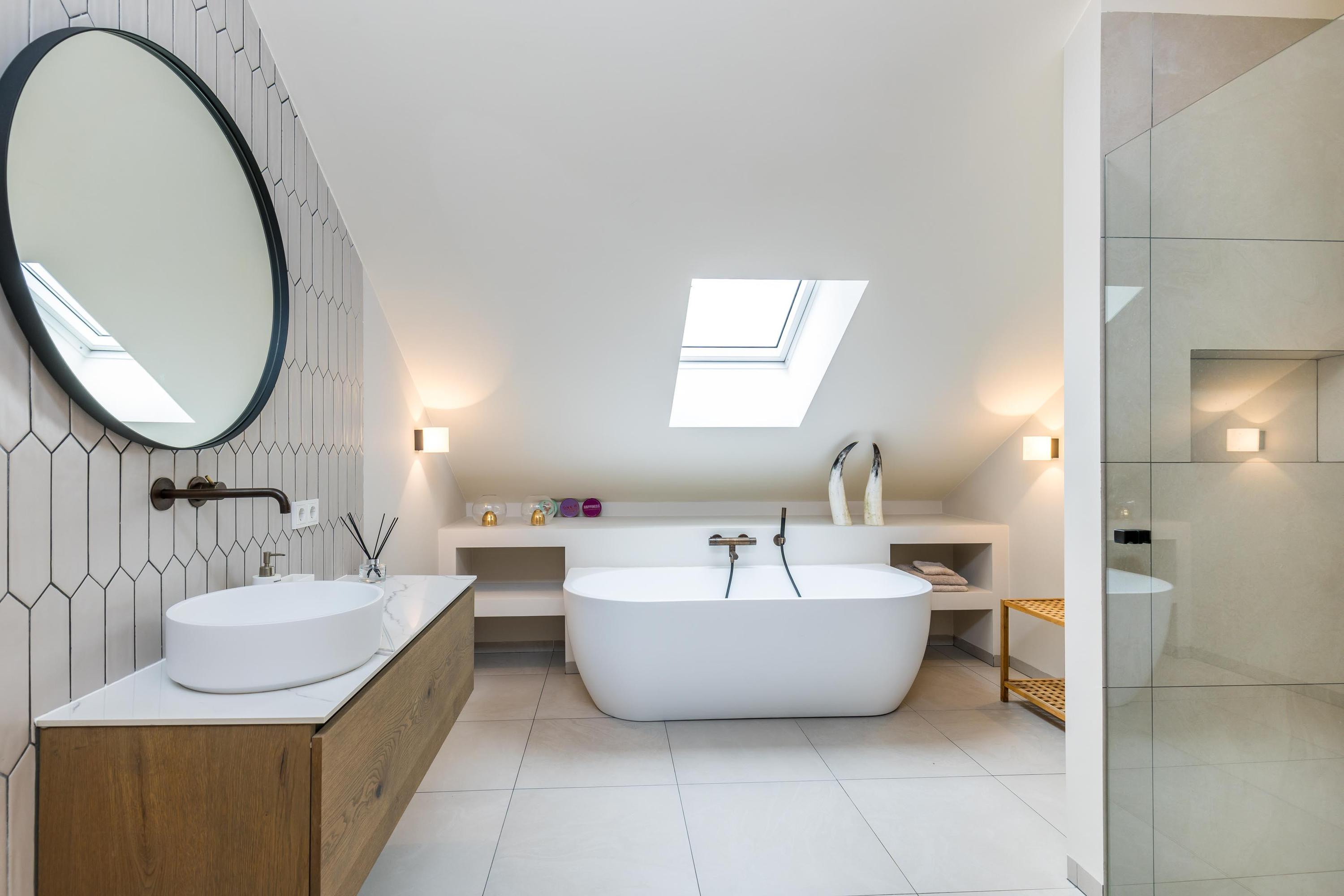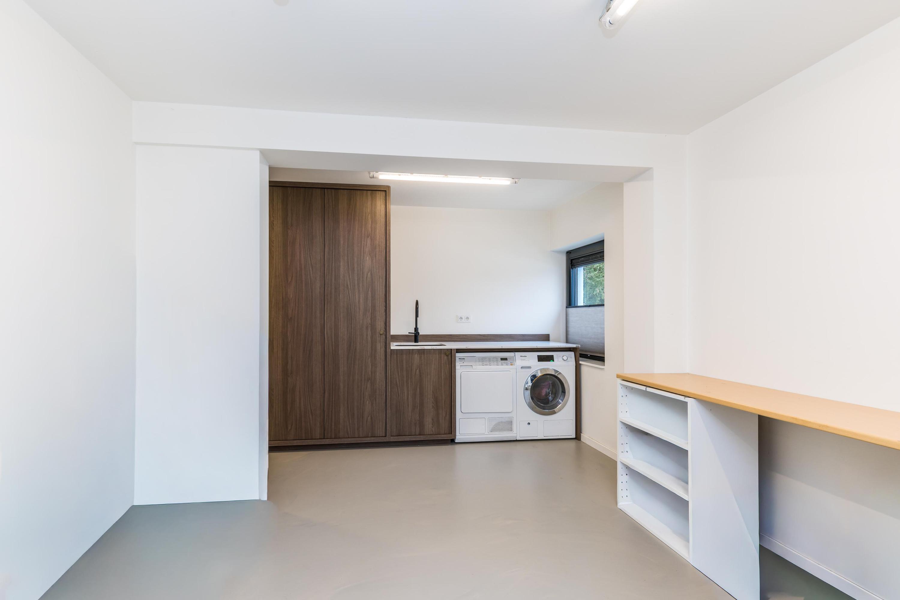 Following the entrance hall is the garden-facing kitchen/diner with a spectacular height, a beautiful, sleek kitchen with a cooking island and equipped with all desirable built-in appliances. Sliding doors provide access to the terrace and the attractive back garden. Charming garden-facing living room with a cosy fireplace and lovely views of both the front and back gardens with a stream. The kitchen/diner opens onto a spacious TV room at the front. Also from the kitchen is a separate hallway with a toilet and sink, and access to the master bedroom with a walk-in closet and ensuite luxury bathroom overlooking the garden, featuring a freestanding bathtub, walk-in shower, and vanity. There is also a spacious laundry/mud room with ample storage space that could also be used as a fitness room. The installations, including the heat pump, are neatly concealed in this space.