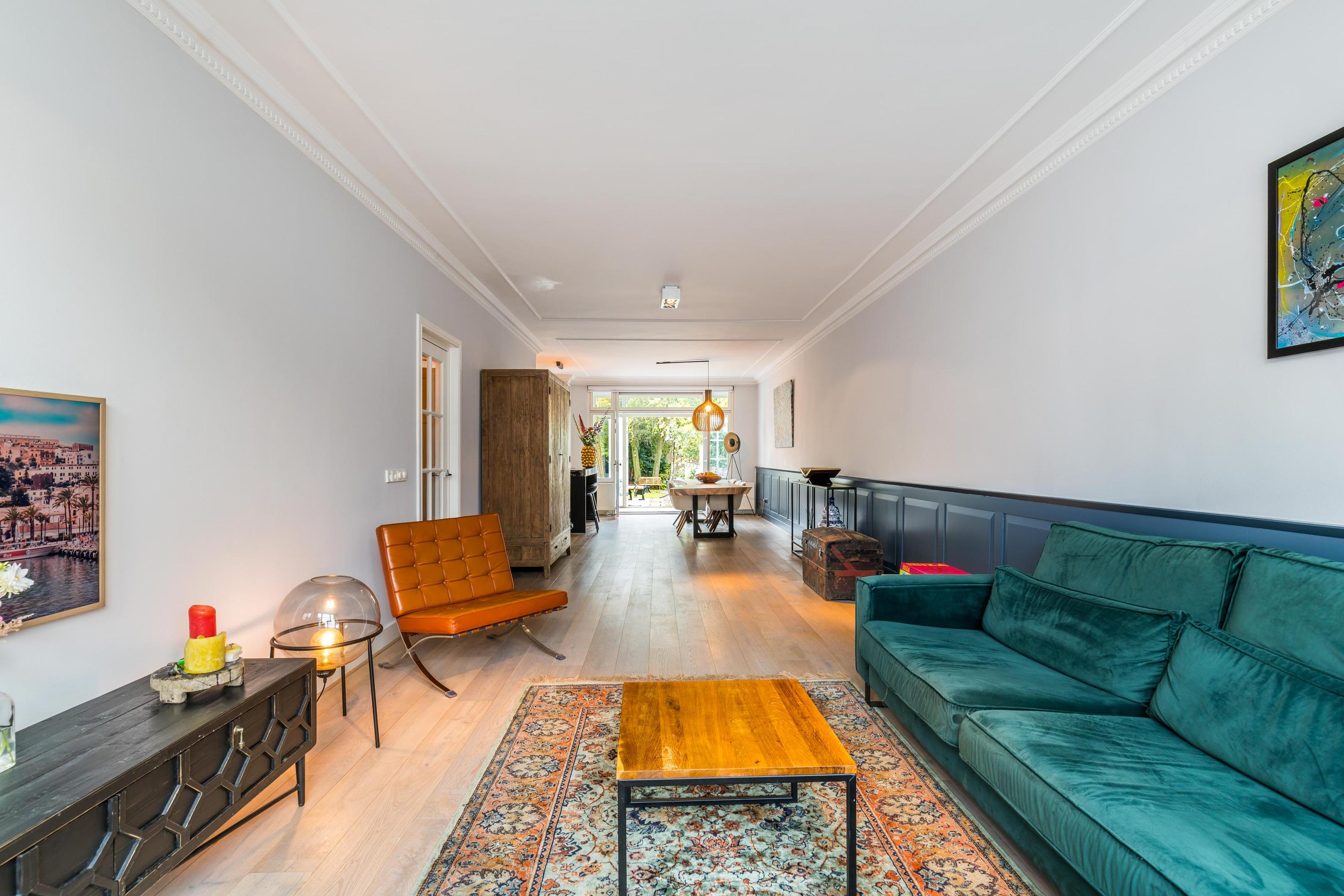 Representative entrance with high ceilings and original details. From the hallway, access to the modern guest toilet and the spacious living area with a beautiful oak floor. The open kitchen (renovated in 2022) forms the heart of the home and is equipped with a large cooking island, high-end built-in appliances including a steam oven and a (wine) climate cabinet. Adjacent is the bright conservatory with French doors opening onto the sunny rear garden, where indoor and outdoor living blend seamlessly.