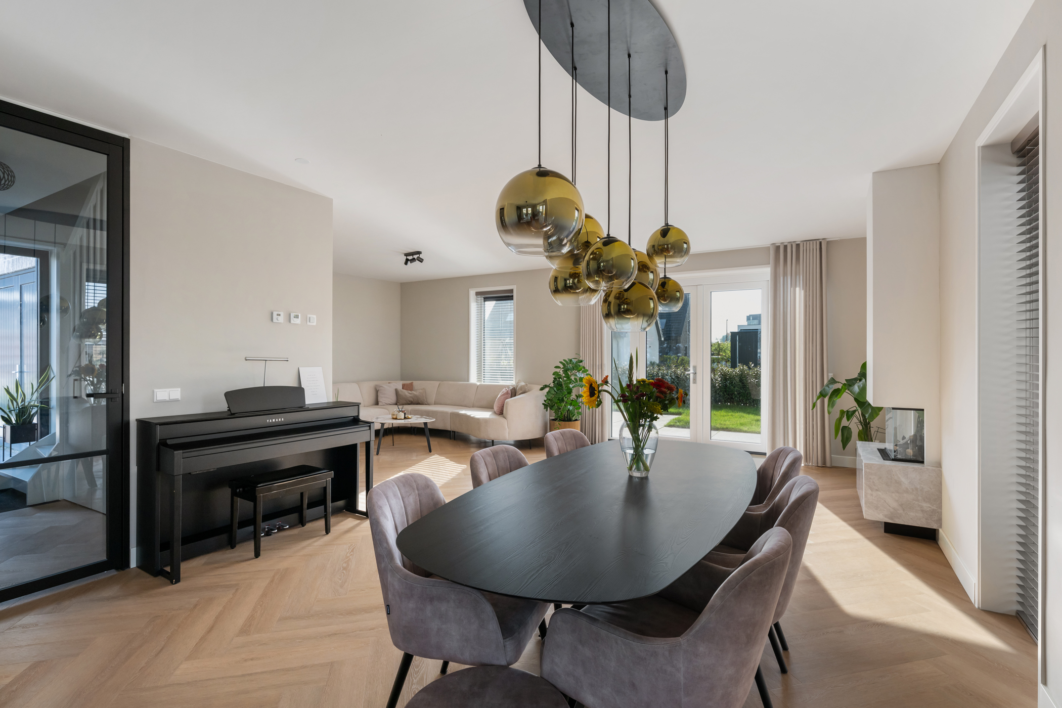 The kitchen is fully equipped with high-quality built-in appliances, including an induction hob with integrated extractor, combination steam oven, refrigerator, freezer, dishwasher, wine cooler, and Quooker (instant boiling water tap).