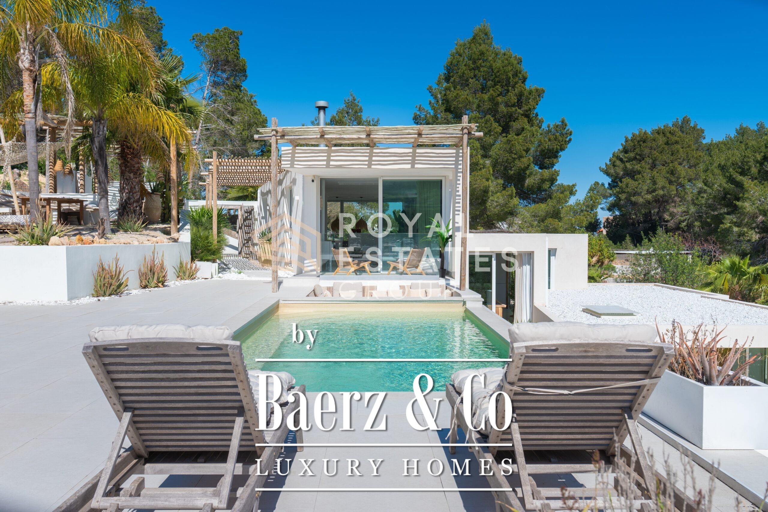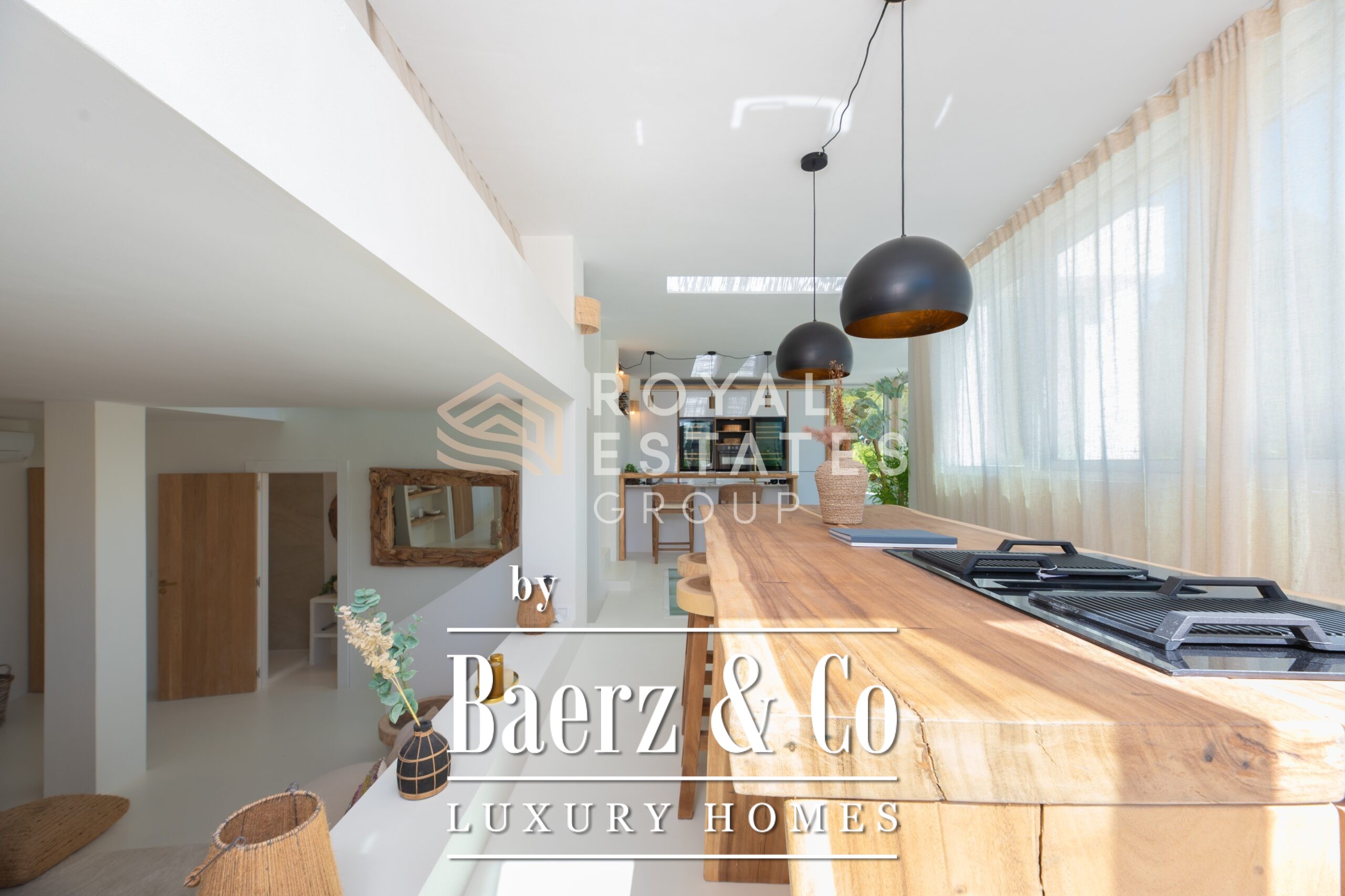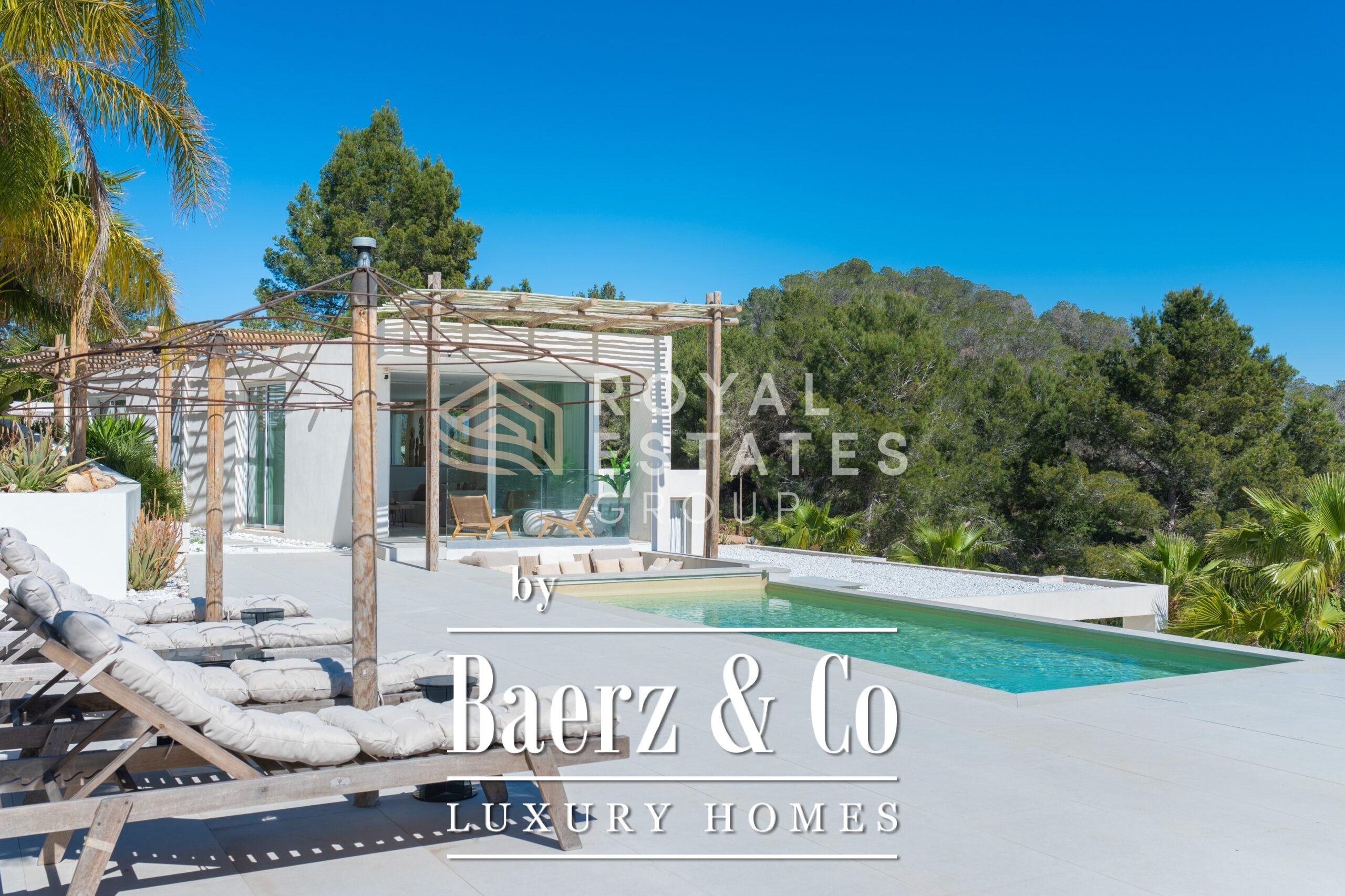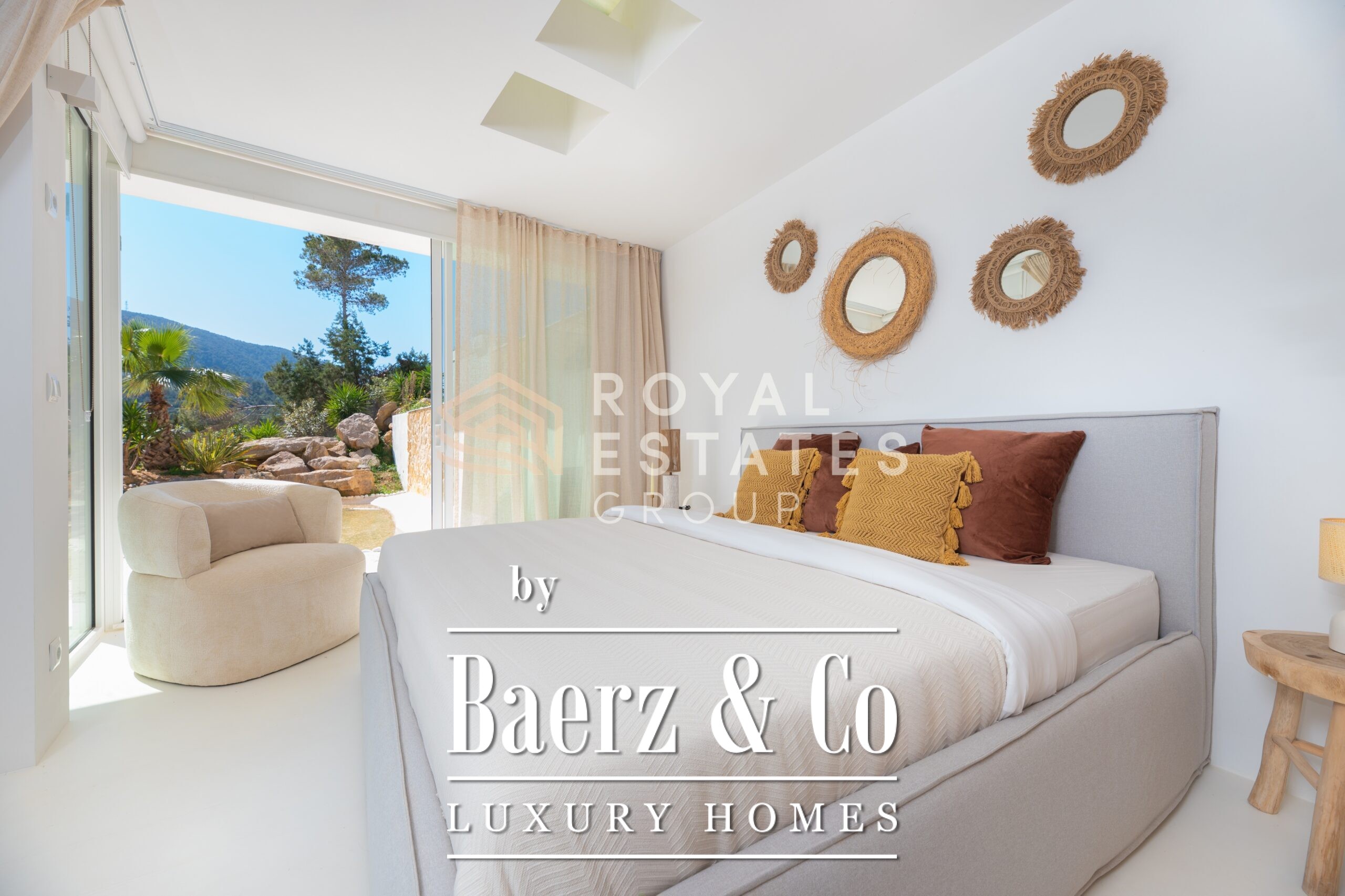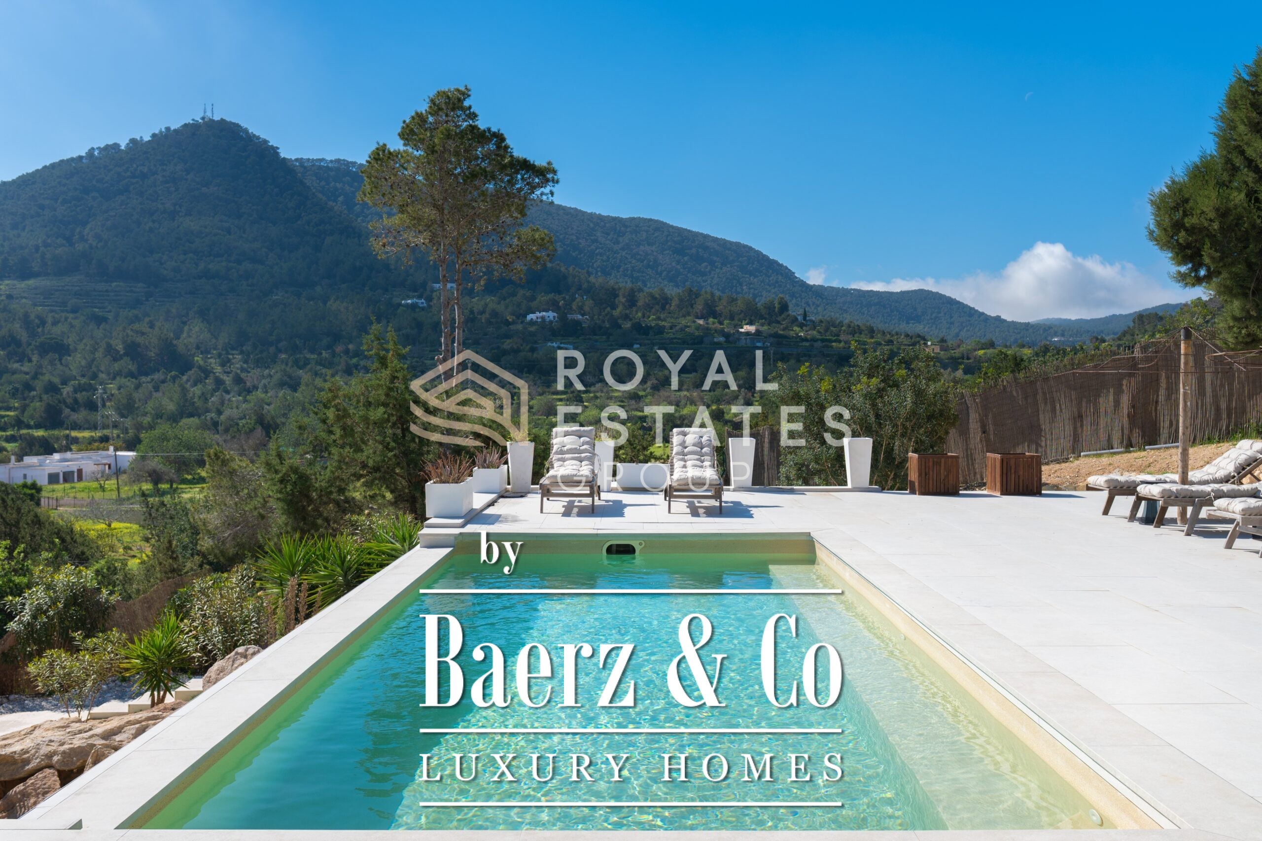 Villa San Jose with panoramic views sits quietly amid the green hills of western Ibiza, offering a rare sense of tranquillity and space. With a generous plot of 19,600 m² and a living area of 330 m², the villa ensures total privacy, surrounded by Mediterranean nature and rolling hills. Well-placed vantage points across the grounds showcase sweeping views over the landscape, with subtle glimpses of the distant sea.