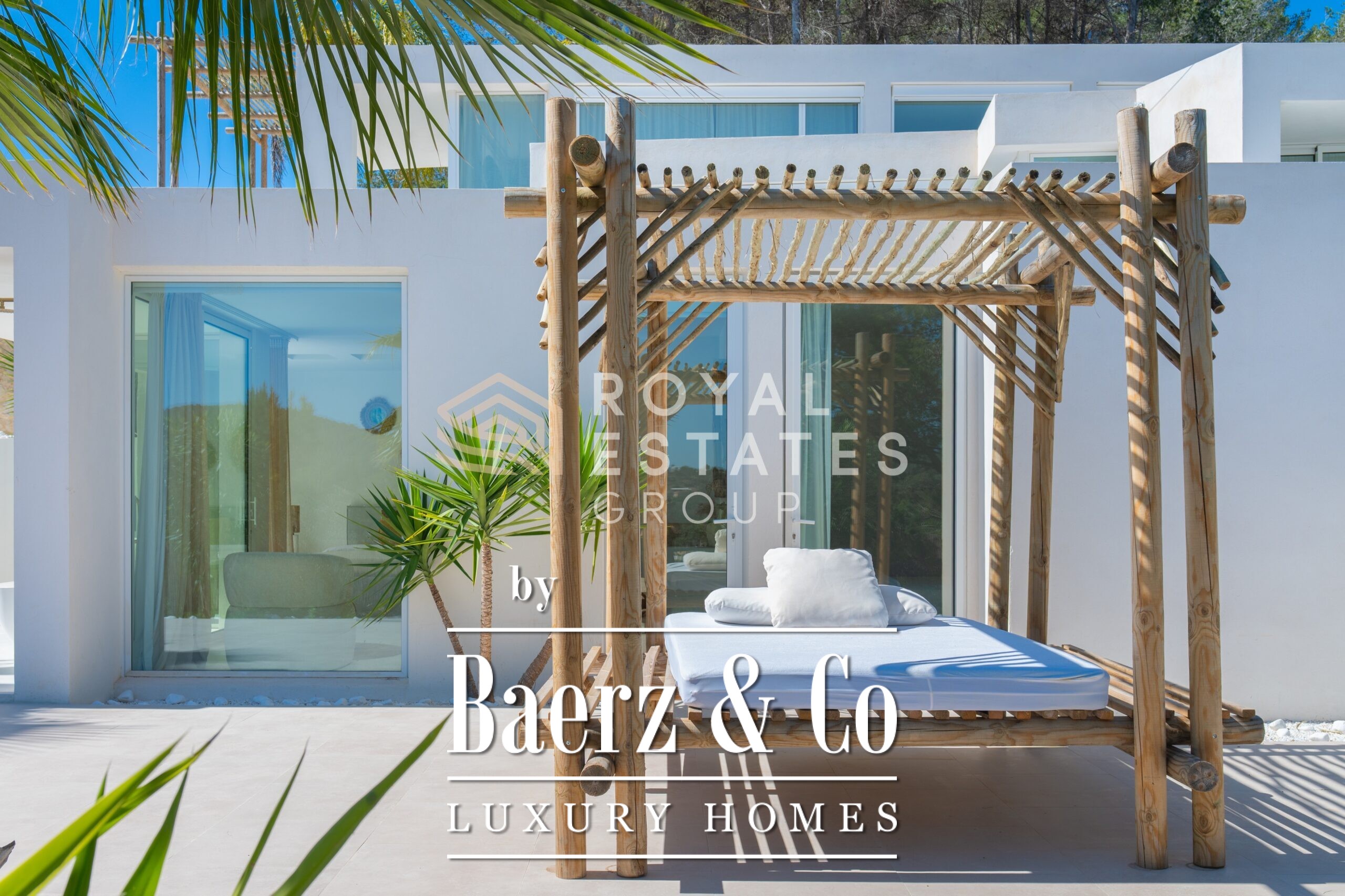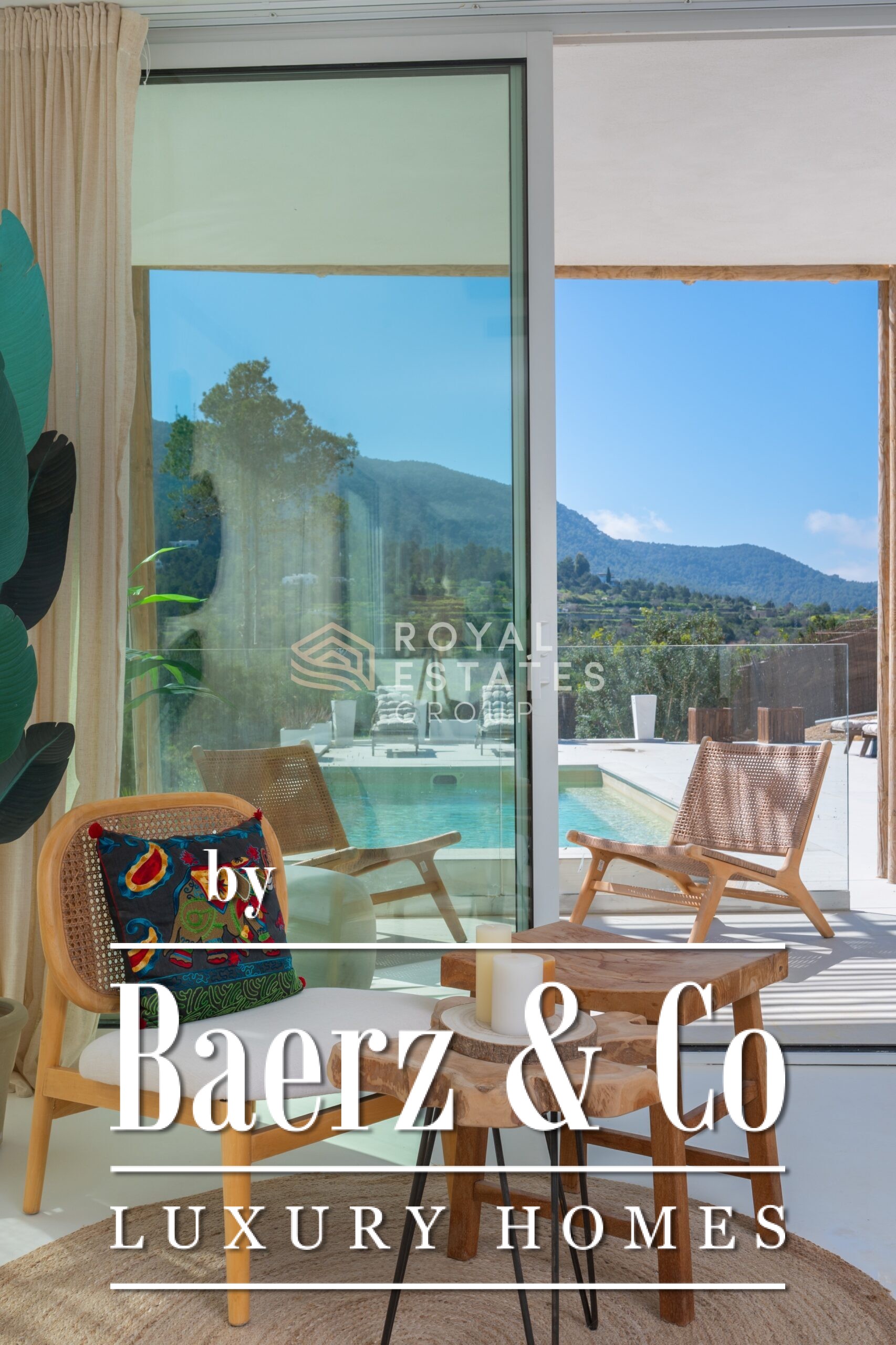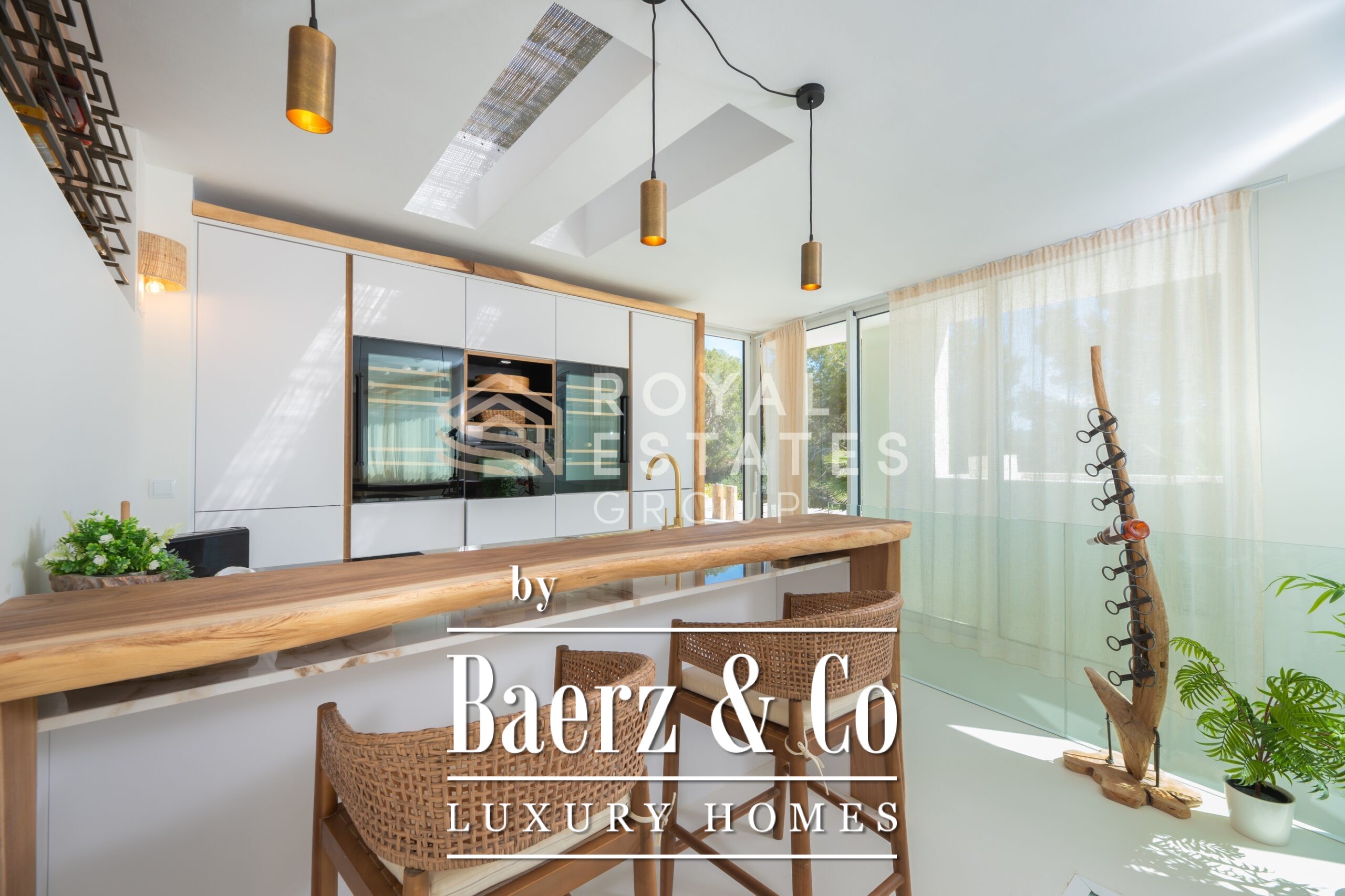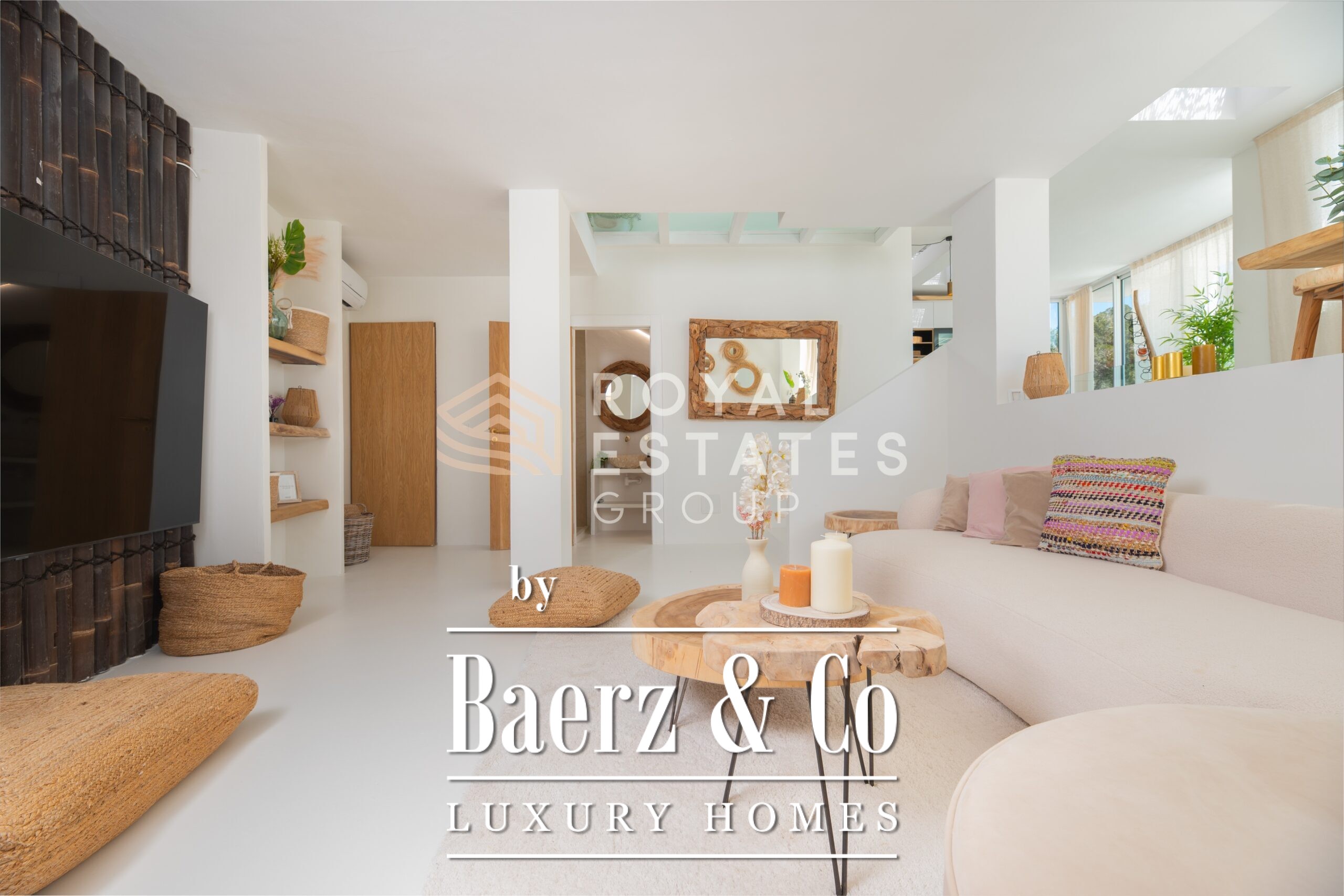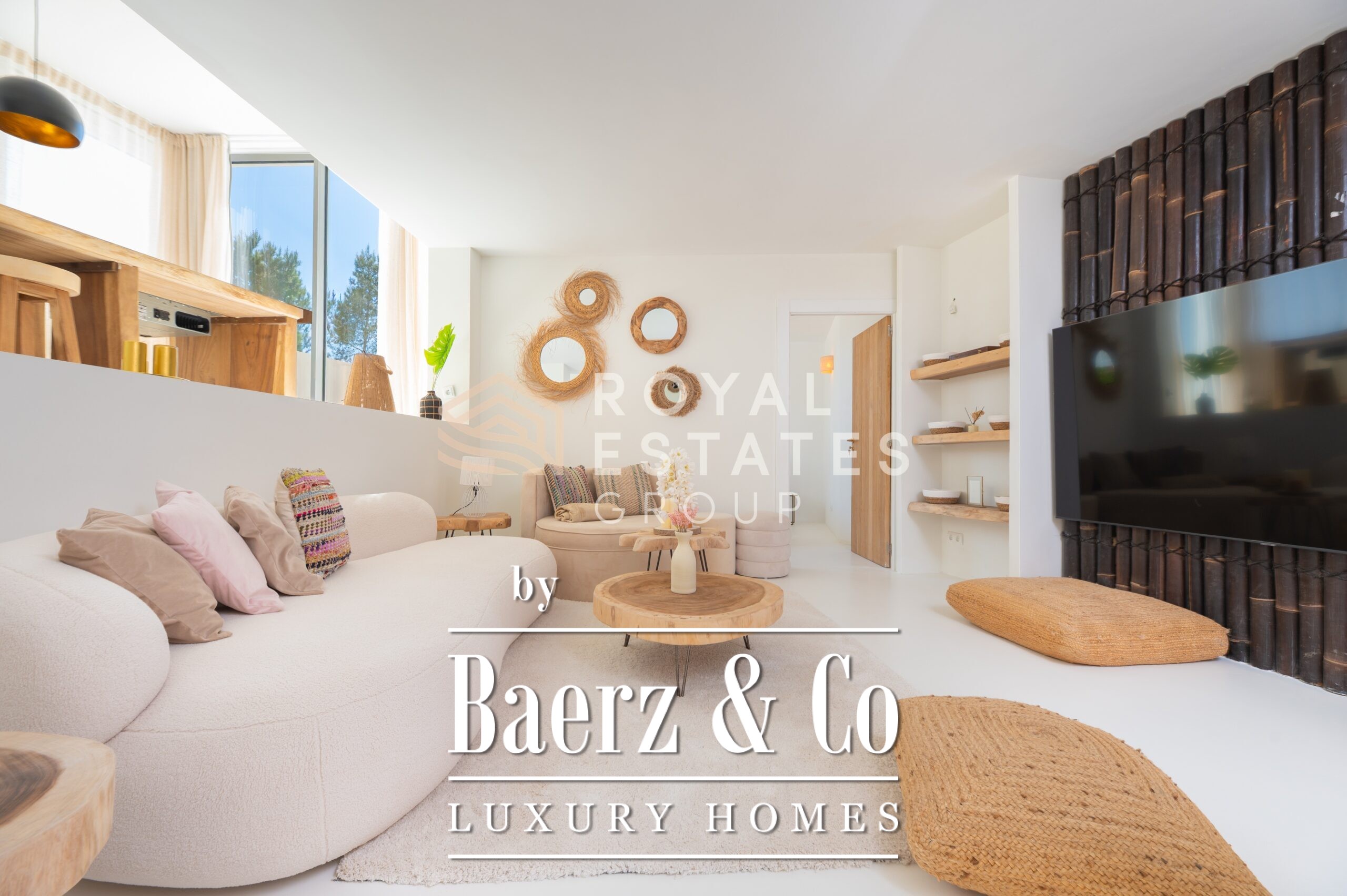 Villa San Jose with panoramic views sits quietly amid the green hills of western Ibiza, offering a rare sense of tranquillity and space. With a generous plot of 19,600 m² and a living area of 330 m², the villa ensures total privacy, surrounded by Mediterranean nature and rolling hills. Well-placed vantage points across the grounds showcase sweeping views over the landscape, with subtle glimpses of the distant sea.