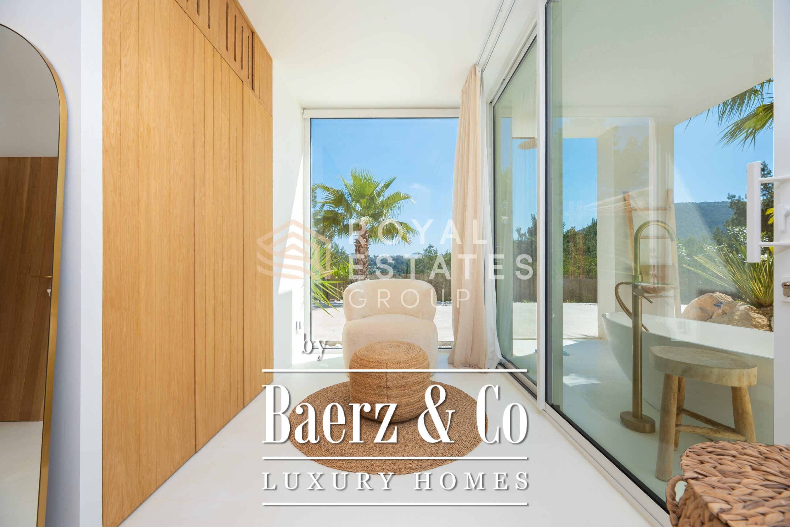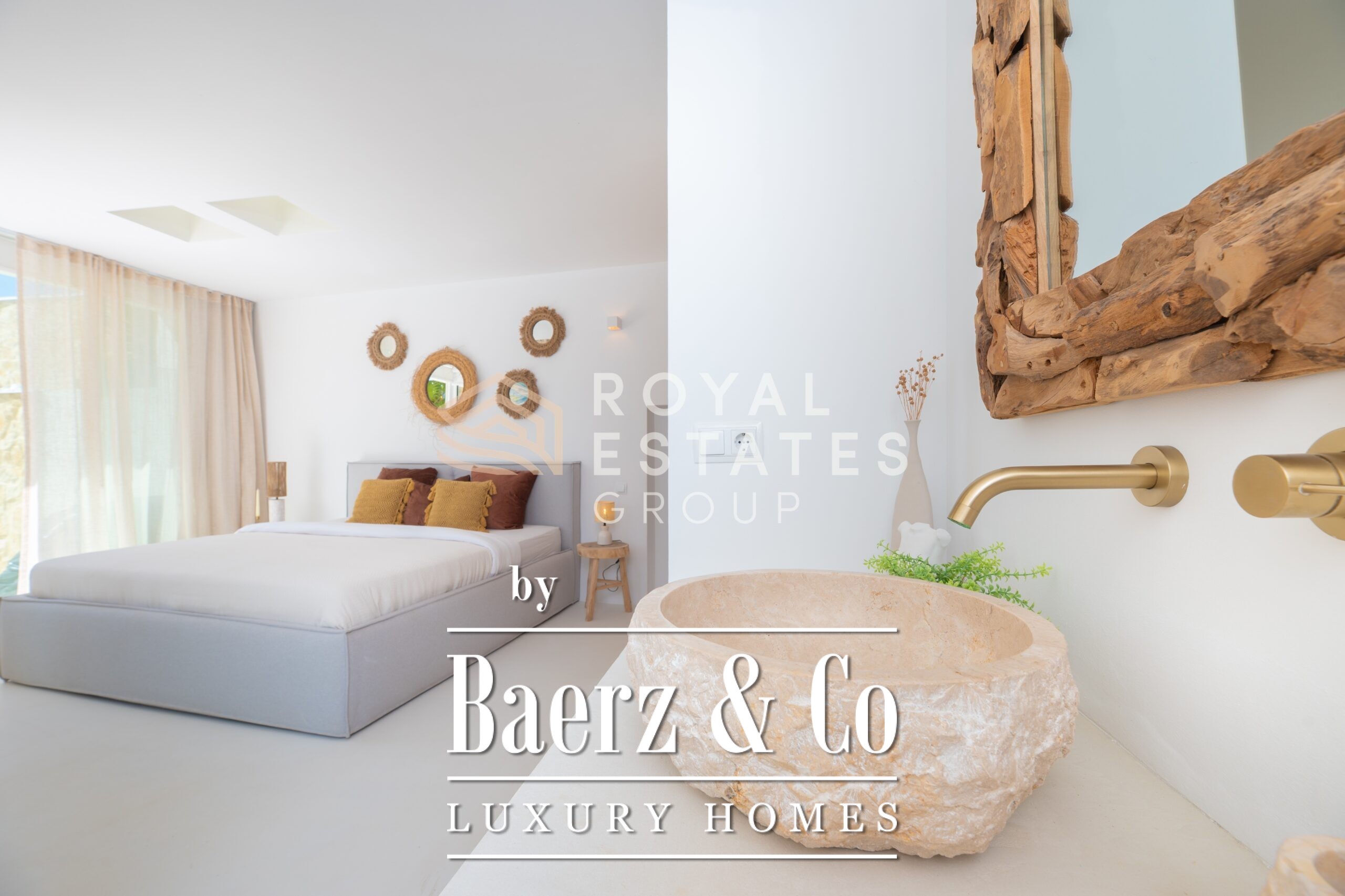 The main villa encompasses four bedrooms and three bathrooms, creating a purposeful balance between family living and guest accommodation. Expansive windows fill the interiors with light, fostering a seamless connection to the outdoors. Underfloor heating and air conditioning support comfort throughout the year. Refined amenities such as an indoor gym, sauna, jacuzzi, and a 20 m² wine cellar further define the experience, while technical features include solar panels, a 32 kW battery system, and a water tank from a shared natural source.