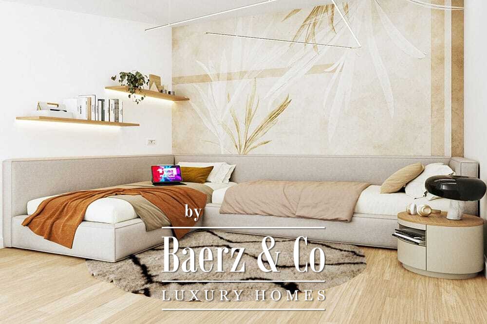 This building stands across four terraces and comprises just seven luxury apartments, including layouts of two bedrooms and two bathrooms within a living area of 123 m². The open living spaces are accentuated by balconies and a private garden, allowing natural light and sea air to shape the daily rhythm. Communal amenities feature manicured gardens and an elegant swimming pool set for relaxation or sociable gatherings, while elevator access and optional covered parking add discretion and ease.