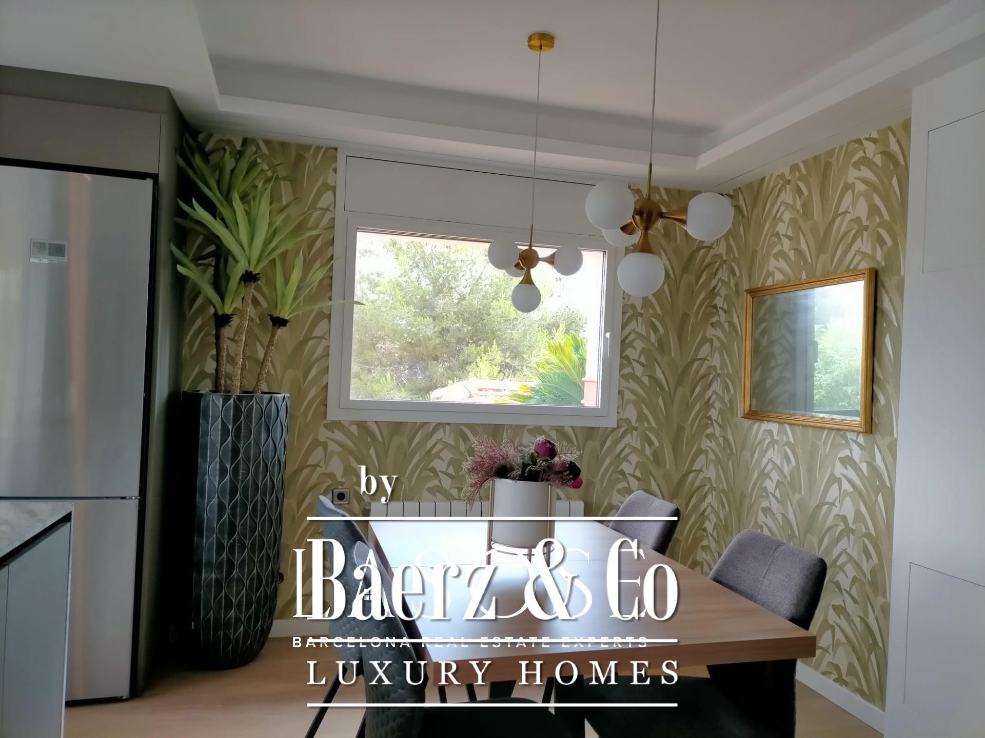 Villa Sant Pere de Ribes is quietly positioned in the esteemed Els Cards residential area, set between Sitges and Sant Pere de Ribes, where privacy and panoramic views define every living moment. This five-bedroom, three-bathroom villa blends traditional Spanish architecture with contemporary refinement. Recently renovated interiors preserve authentic details such as arches and natural textures, while bringing in clean modern lines and warm tones. The open-plan main floor flows across kitchen, dining and living spaces, illuminated by abundant sunlight from windows on two sides. A statement fireplace centers the living area, offering an inviting gathering point year-round.