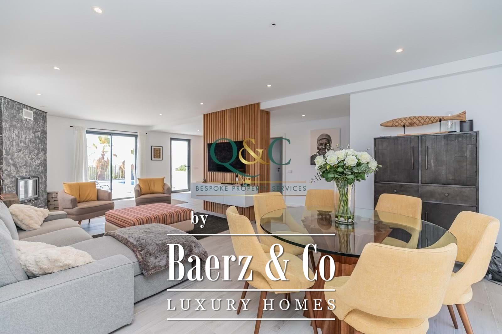 The luxury kitchen, with Bosch appliances, instant boiling water tap and 5cm granite worksurfaces, overlooks the pool, terrace and the sea beyond, and with underfloor heating to provide the perfect cooking environment. The living space with log burner enjoys the sea view, and the dining area overlooks the rear courtyard. The bright open-plan spaces combine to offer a serene connection with the beauty of the Algarve hillside.