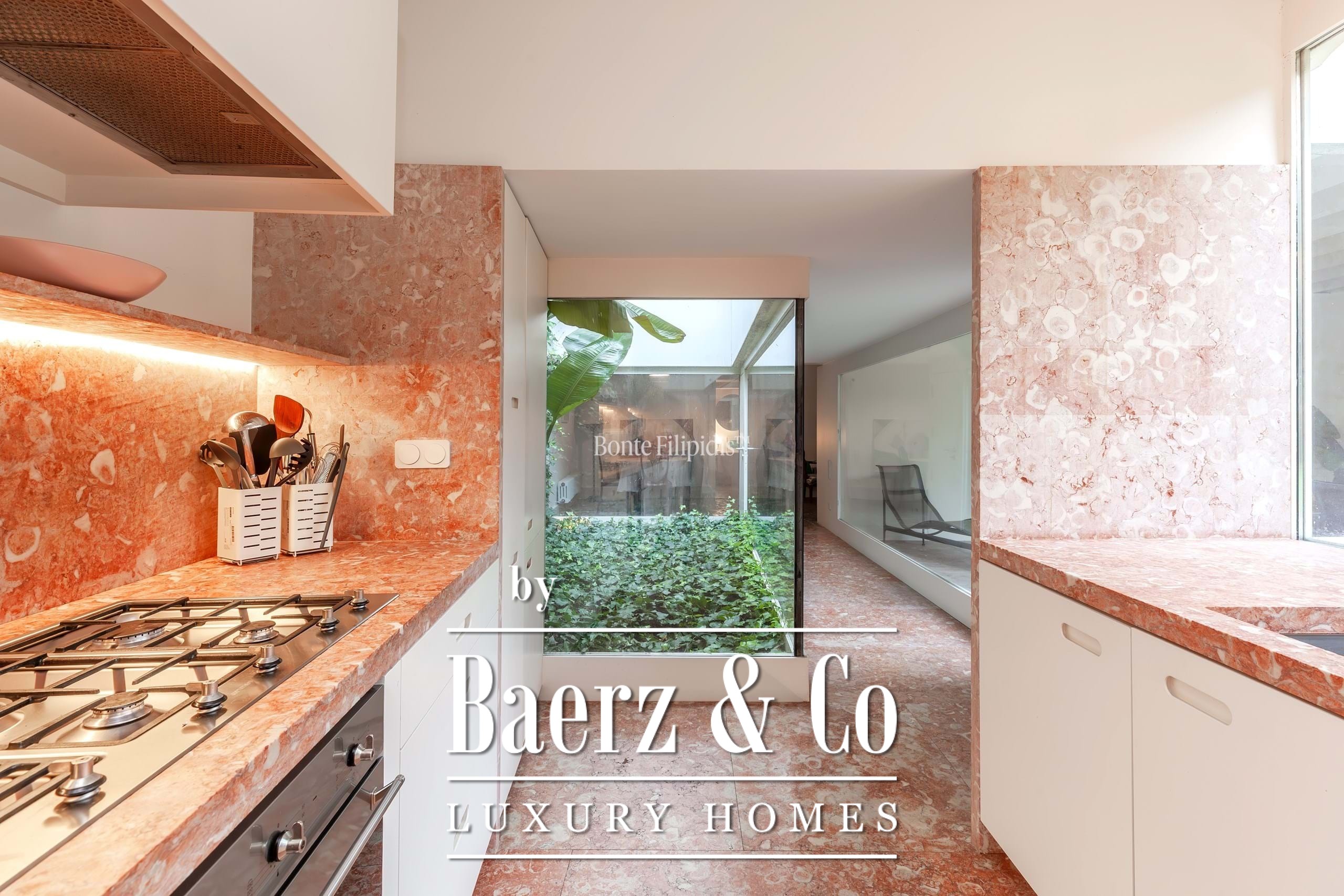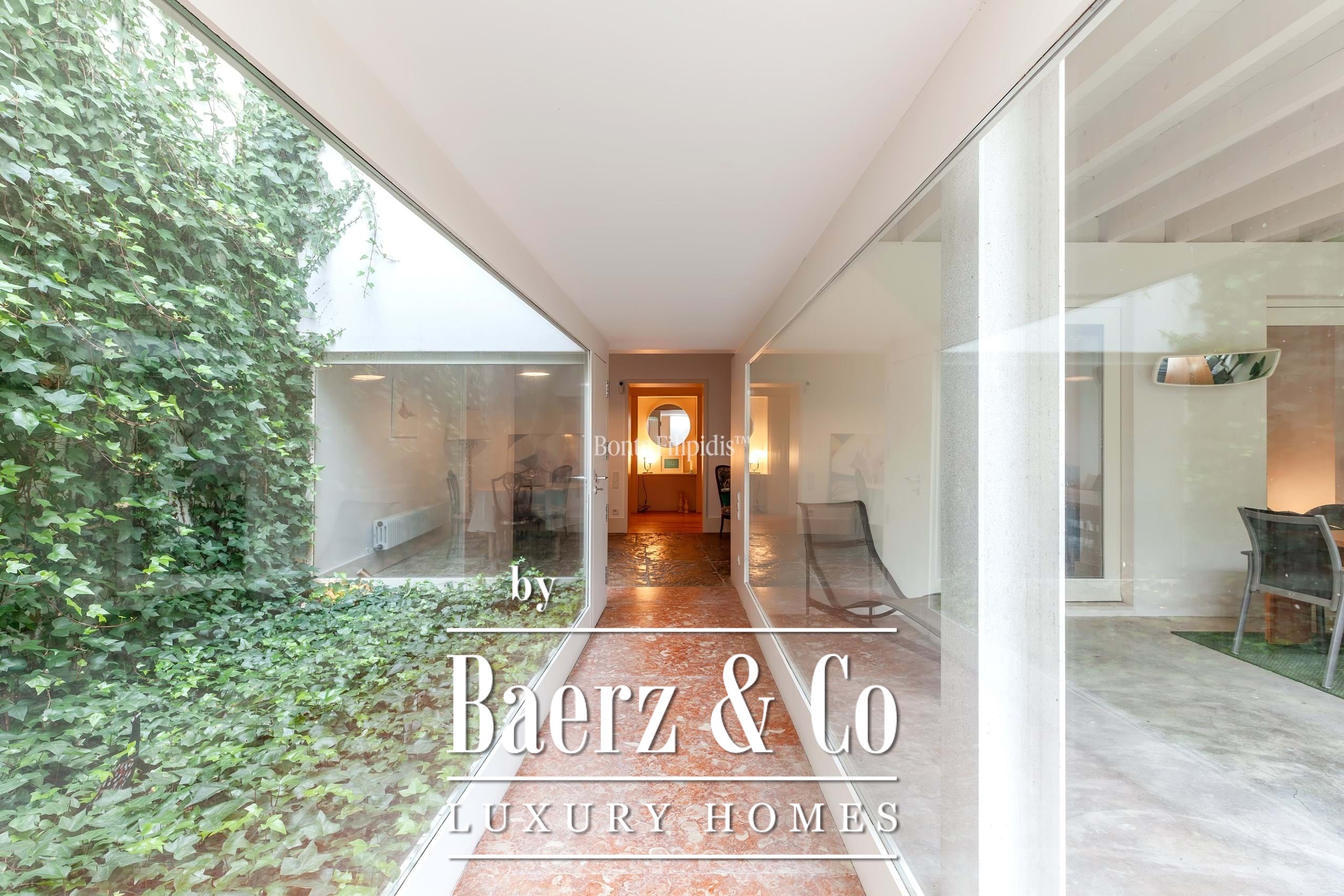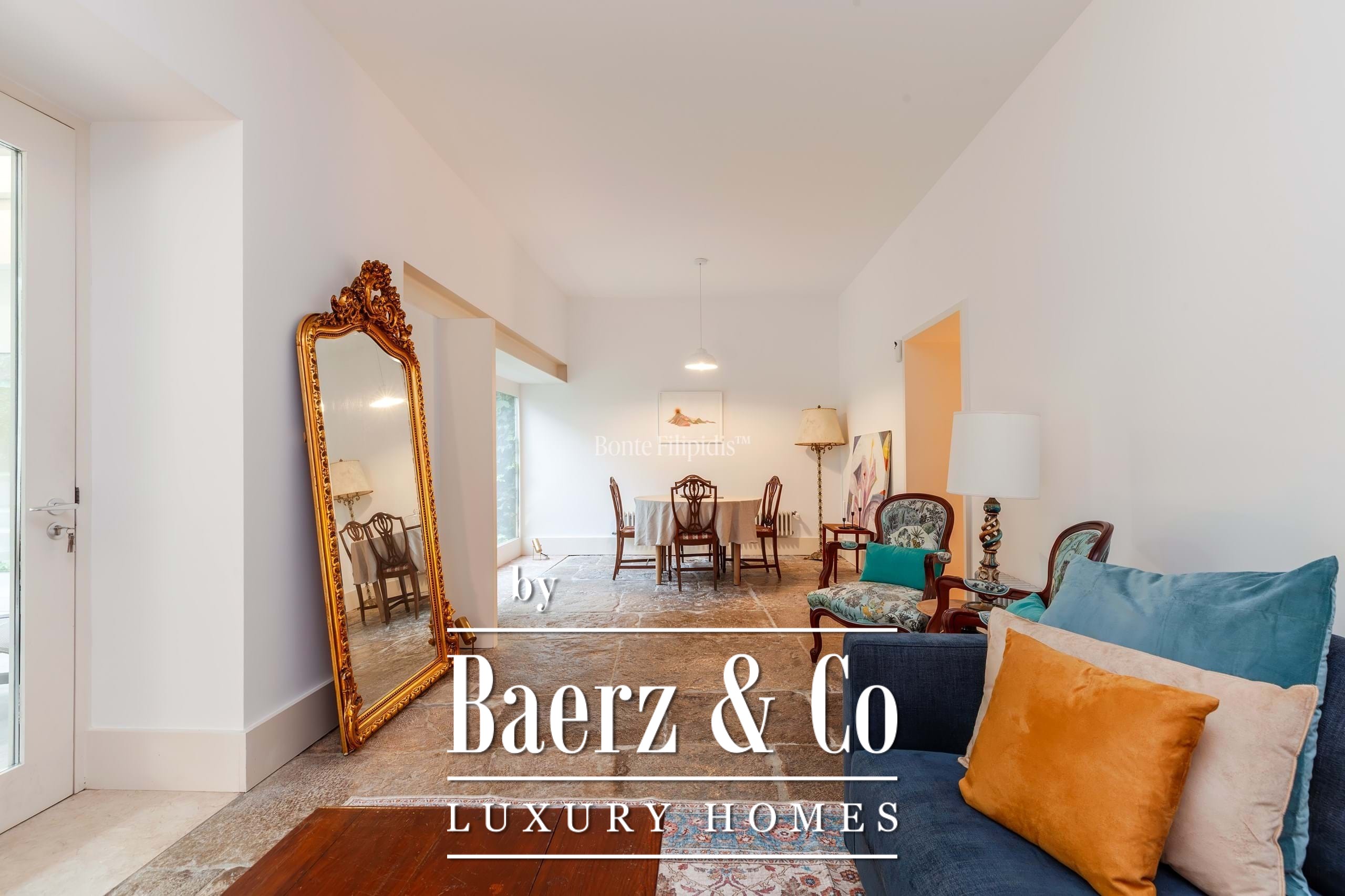 The primary living spaces are marked by original stone flooring and softly vintage accents, with large panoramic windows drawing natural light into the open-plan social area. Here, living and dining zones flow seamlessly out to an 80 m² private garden, a tranquil retreat bordered by mature greenery for quiet moments or reserved gatherings. Subtle material choices and precise detailing lend an understated sophistication to every space.