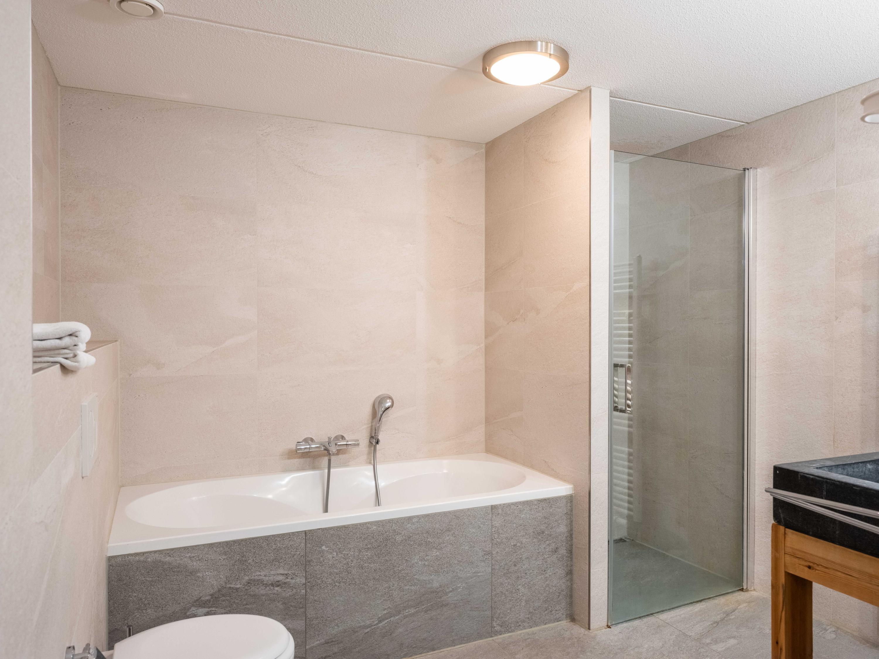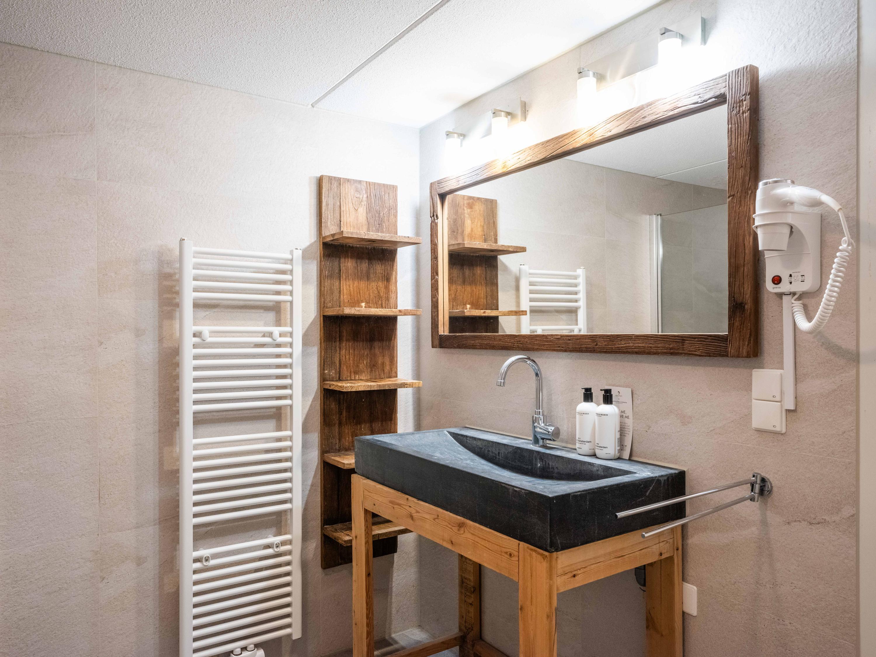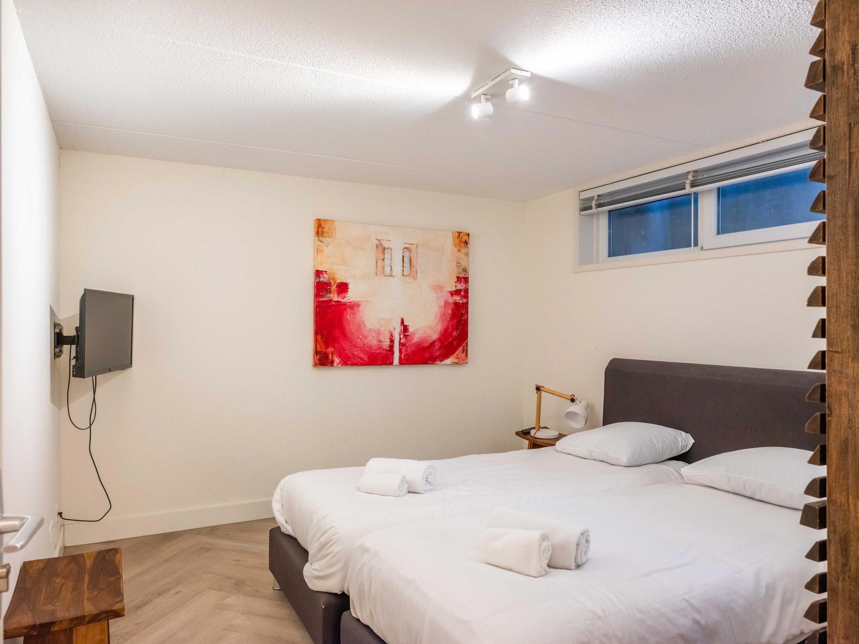 De benedenverdieping beschikt over twee slaapkamers, een heerlijke sauna en een badkamer met een ligbad, een douche en een brede wastafel.